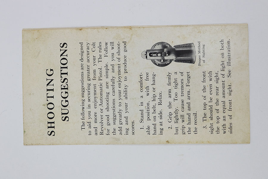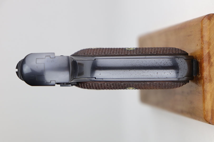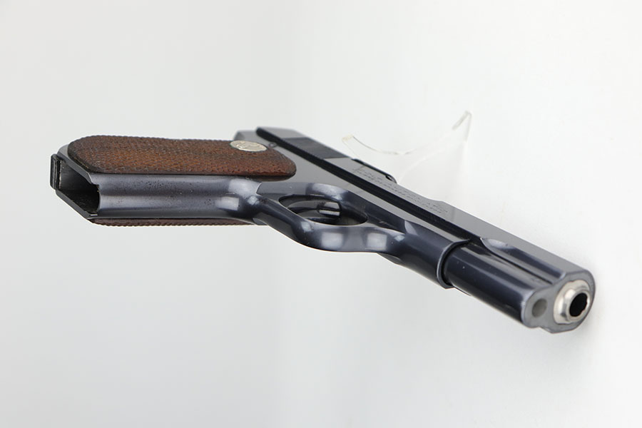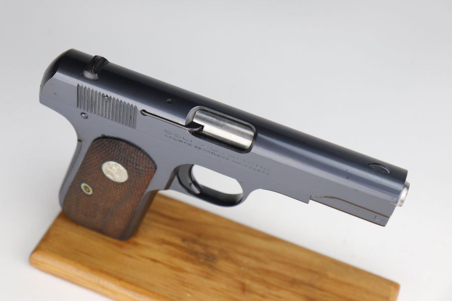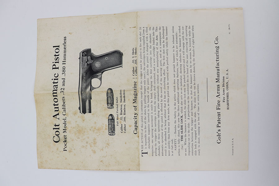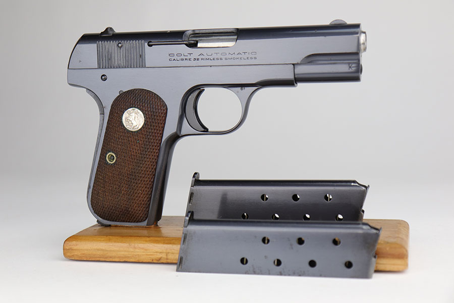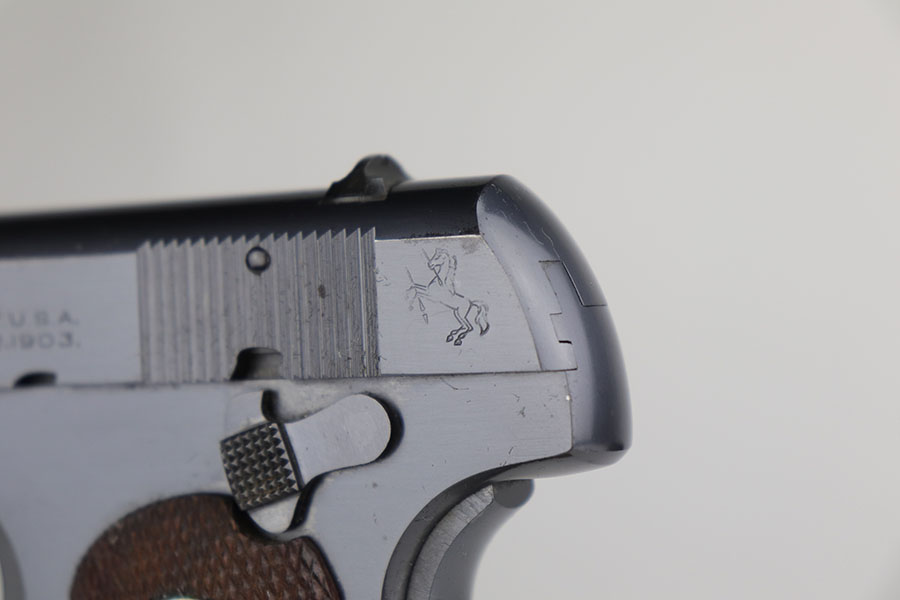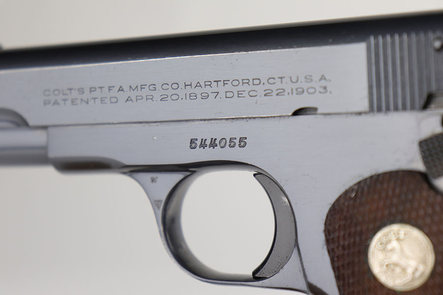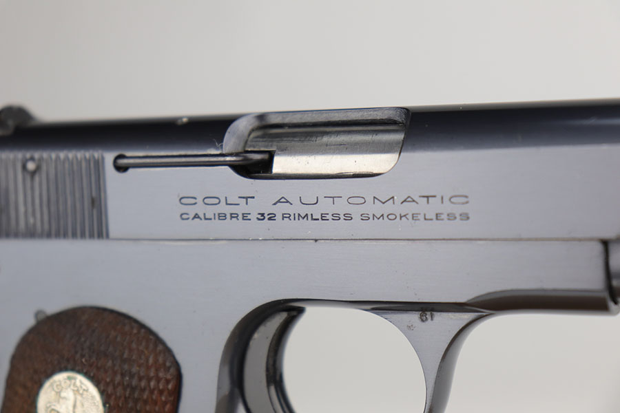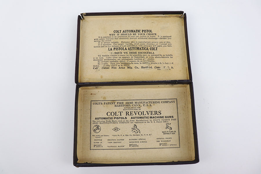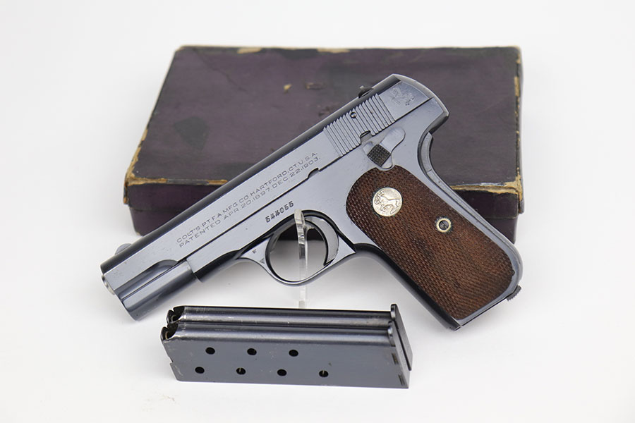 10/27/20 – This is a minty Colt Model 1903 in the original box with spare magazine and the basic Colt paperwork. The gun was manufactured in 1941 and has 99% of the original blue, as there’s just a tiny bit of muzzle wear but virtually no bluing loss overall. There are also a few areas with minor oxidation, most prominently seen on the grip safety. Mint bore and grips. The box is numbered and matching to the pistol on the bottom. Both magazines are original and marked ‘CAL .32 COLT’ on the bottom. Comes with the original Colt manual.