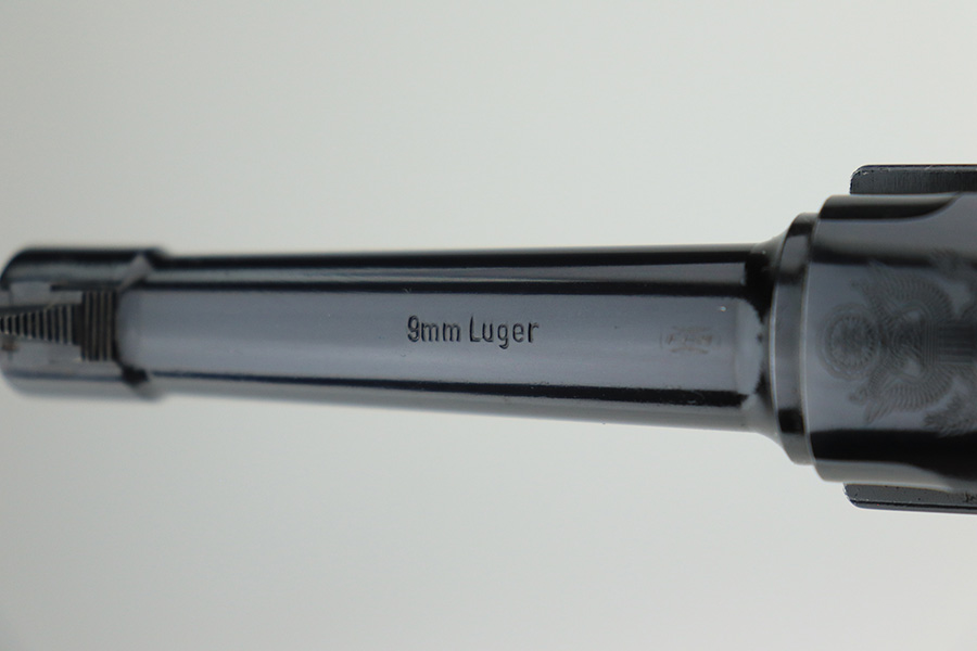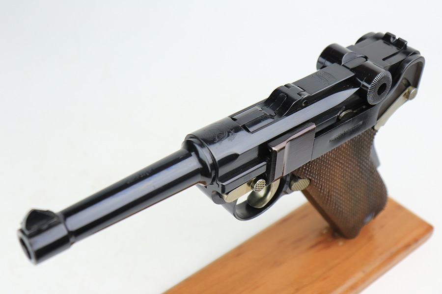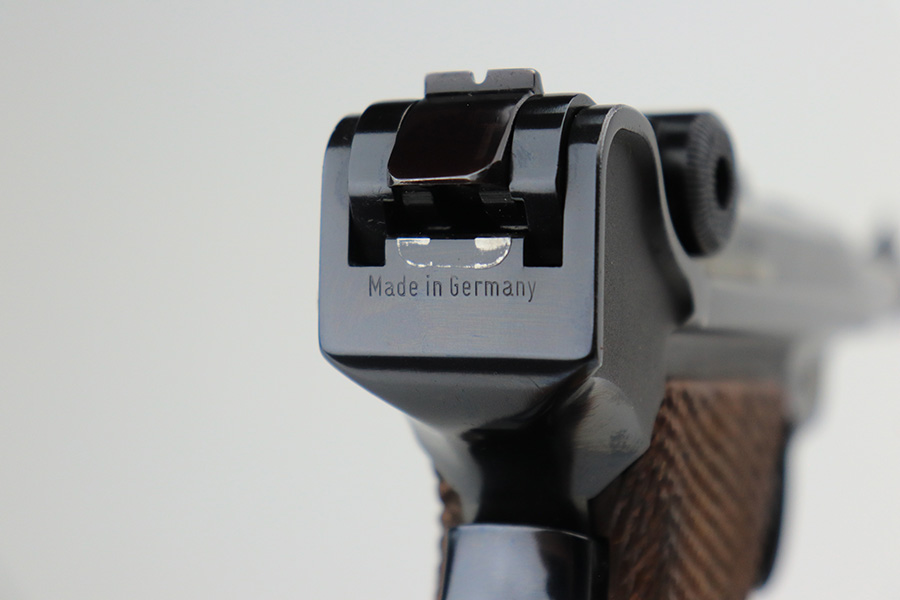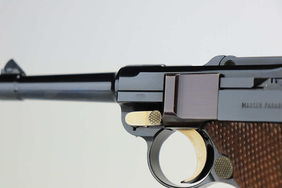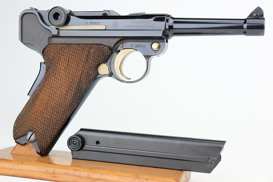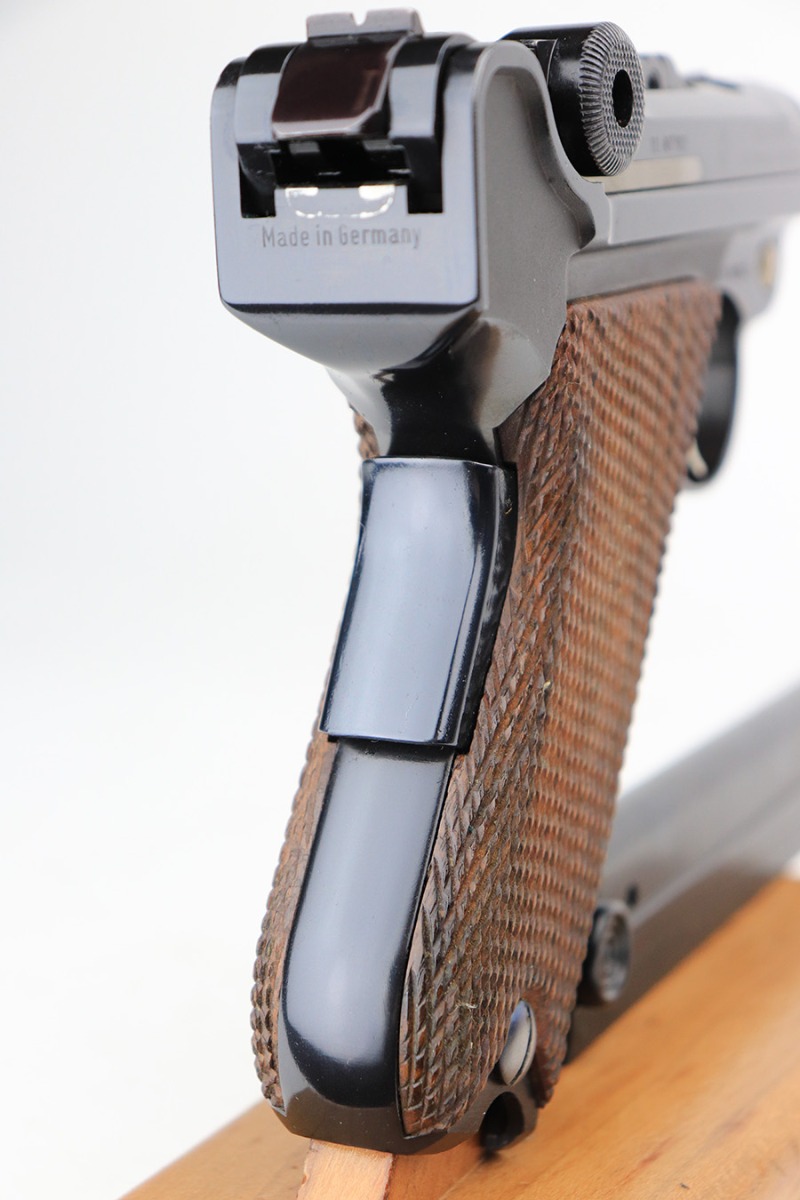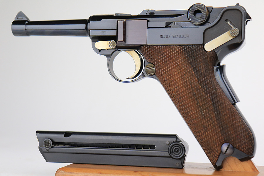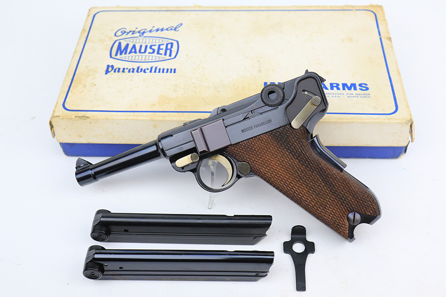 5/31/22 – This is a mint, post-war Mauser American Eagle Luger. It is all matching and has an Interarms import mark. 4 inch barrel. It is in mint condition with just a few tiny scratches on the front strap. It comes with a period-correct box (not serialized), two magazines, a tool, and a cleaning brush. Mint wood grips. Near-mint bore.