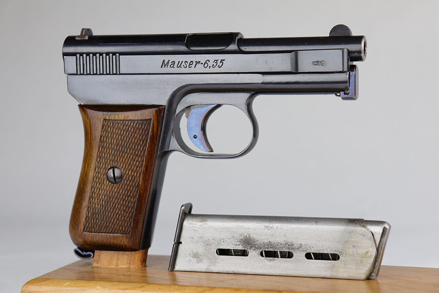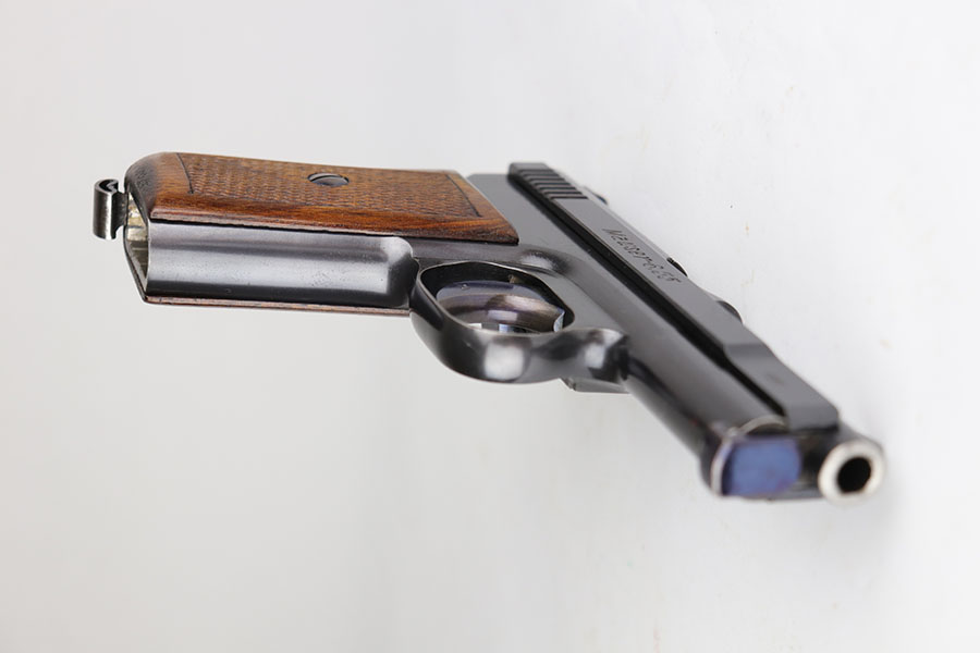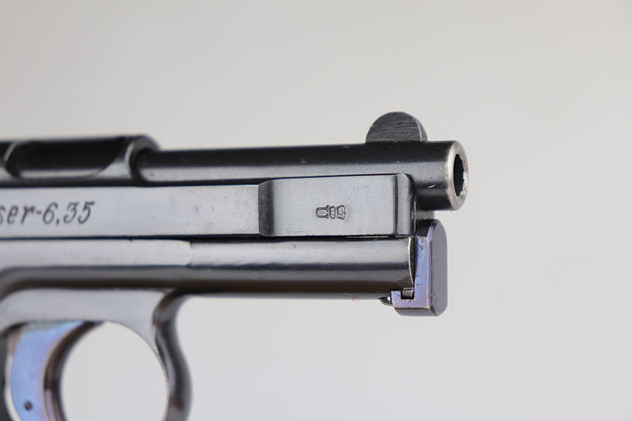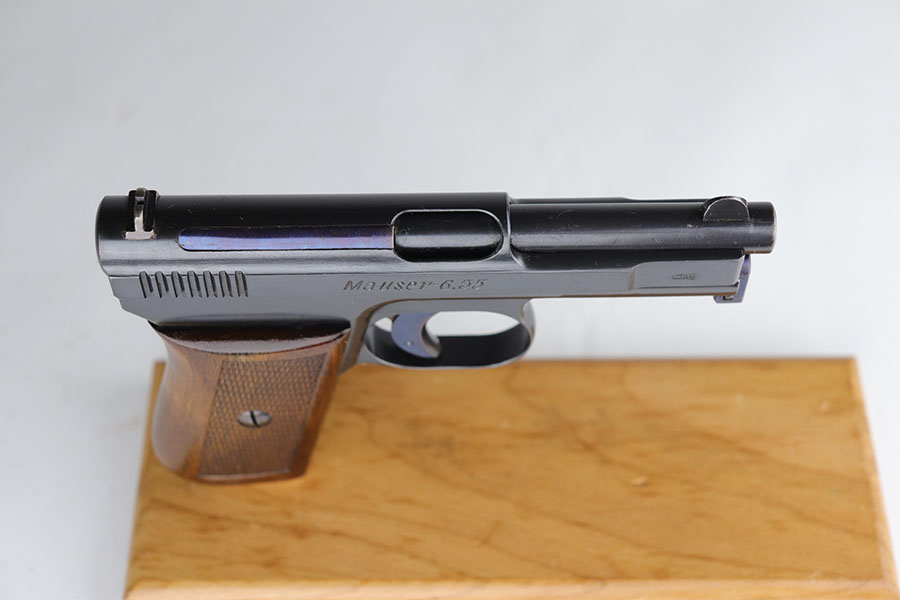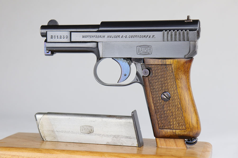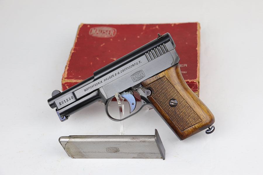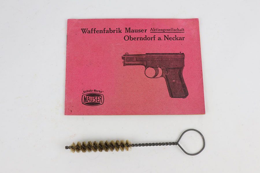 7/13/20 – This is a mint Mauser Model 1910 in original Mauser box with cleaning rod and manual. The pistol is all matching and original with no bluing loss to mention. Beautiful fire blue on some small parts. Minty grip and bore. Correct magazine. The box does show a couple of minor tears and obvious handling wear but that’s to be expected.