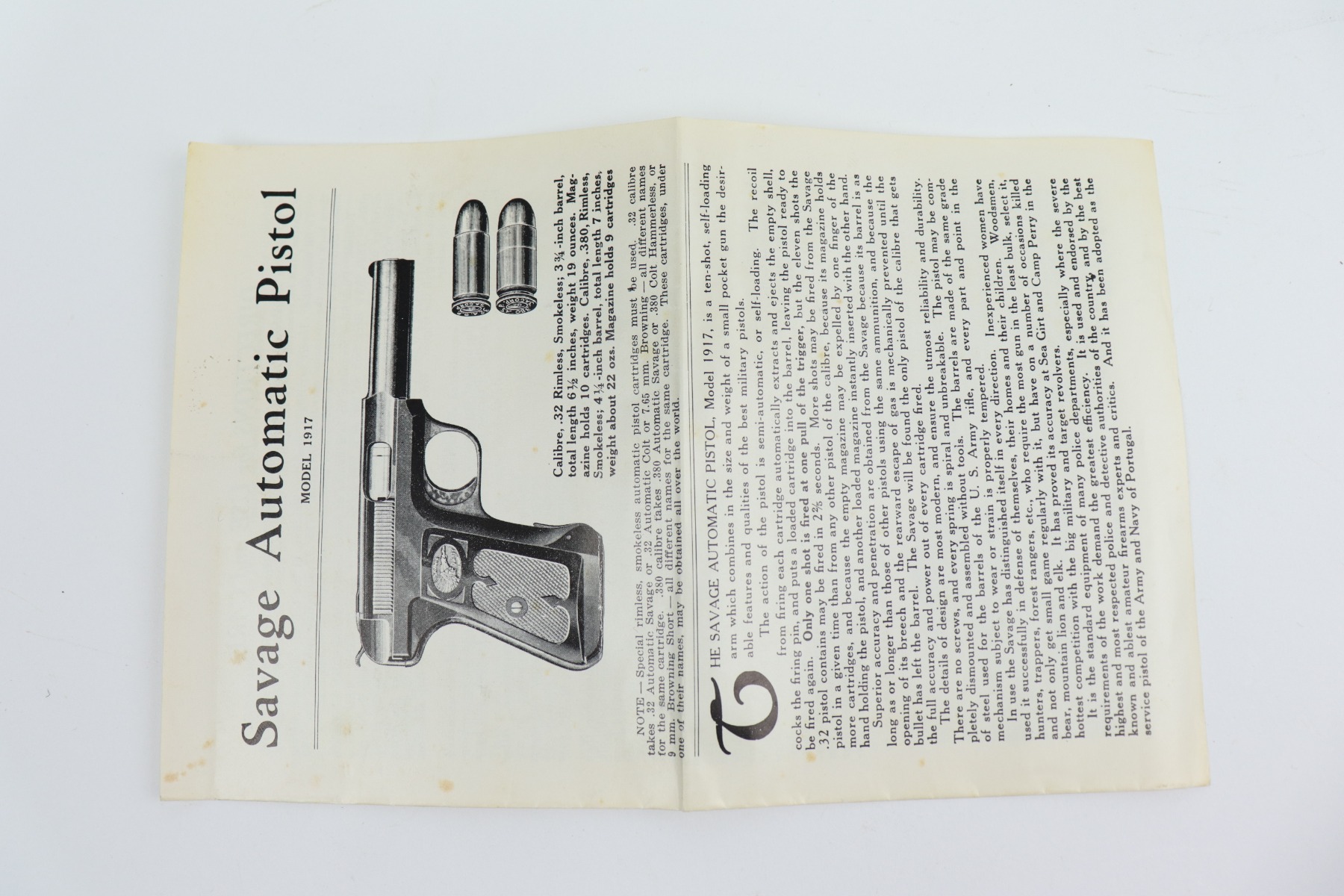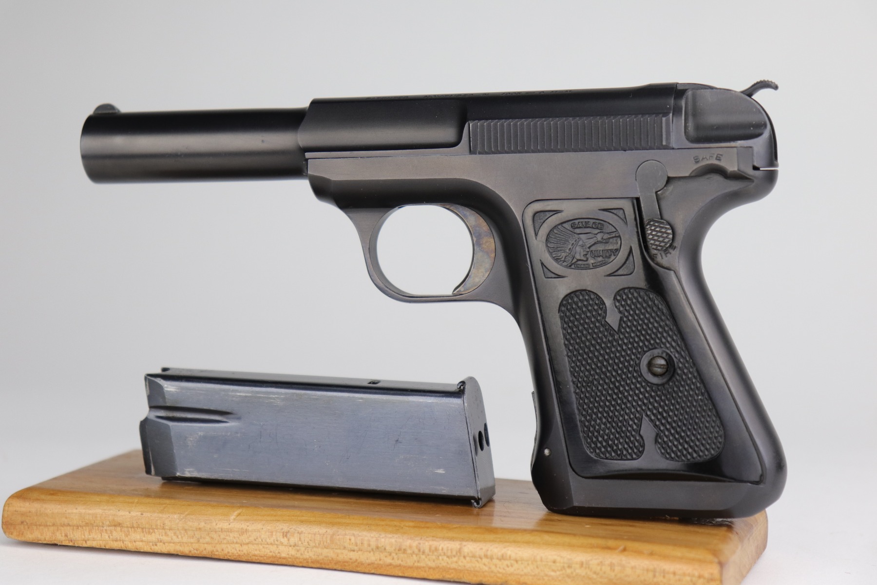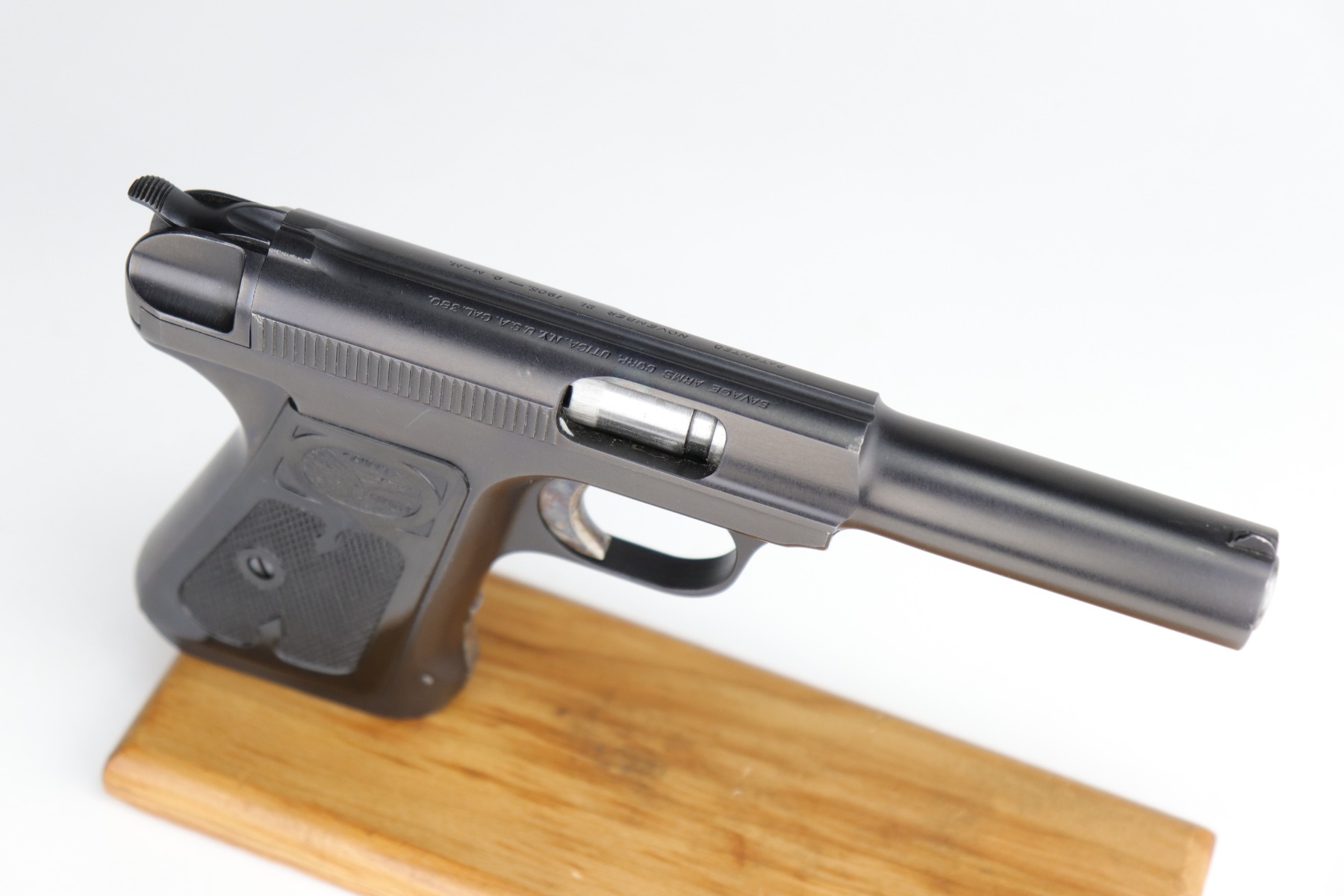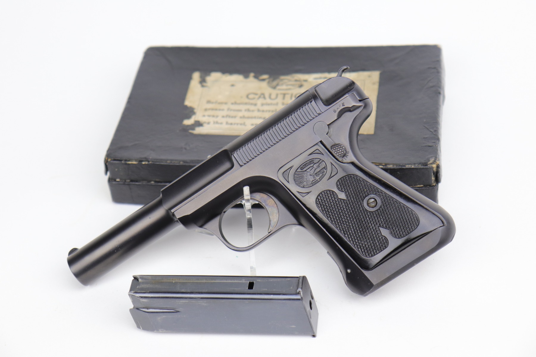 10/8/20 – This is a original Savage Model 1907 in mint condition. It comes with an original box, owners manual, one magazine, and the original wrapping paper. The paper has “Abercrombie and Fitch”, likely the retailer this gun was originally shipped to. These guns were made between 1907-1920. The models 1907, 1915 & 1917 are all single-action pistols, but do have some minor differences. The 1907 uses molded hard rubber grips that do not use a screw for placement, and the mag catch operates by using the pinky to depress the bottom portion of the lever. This particular example is mint. The only sign of wear is one small spot of discoloration on the back strap. Excellent grips. The bore is near-mint.