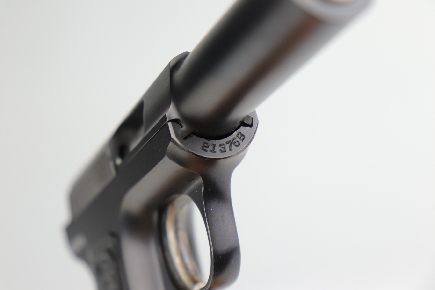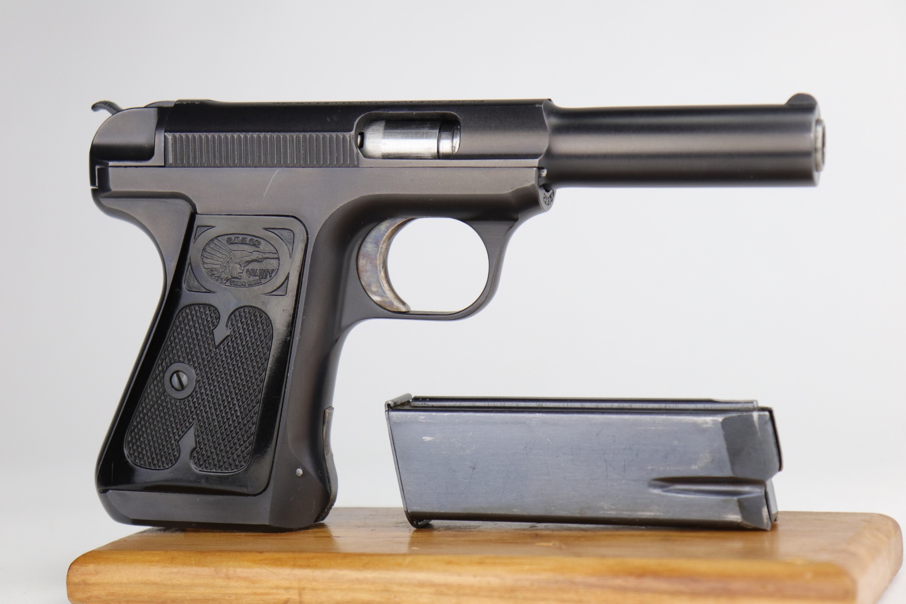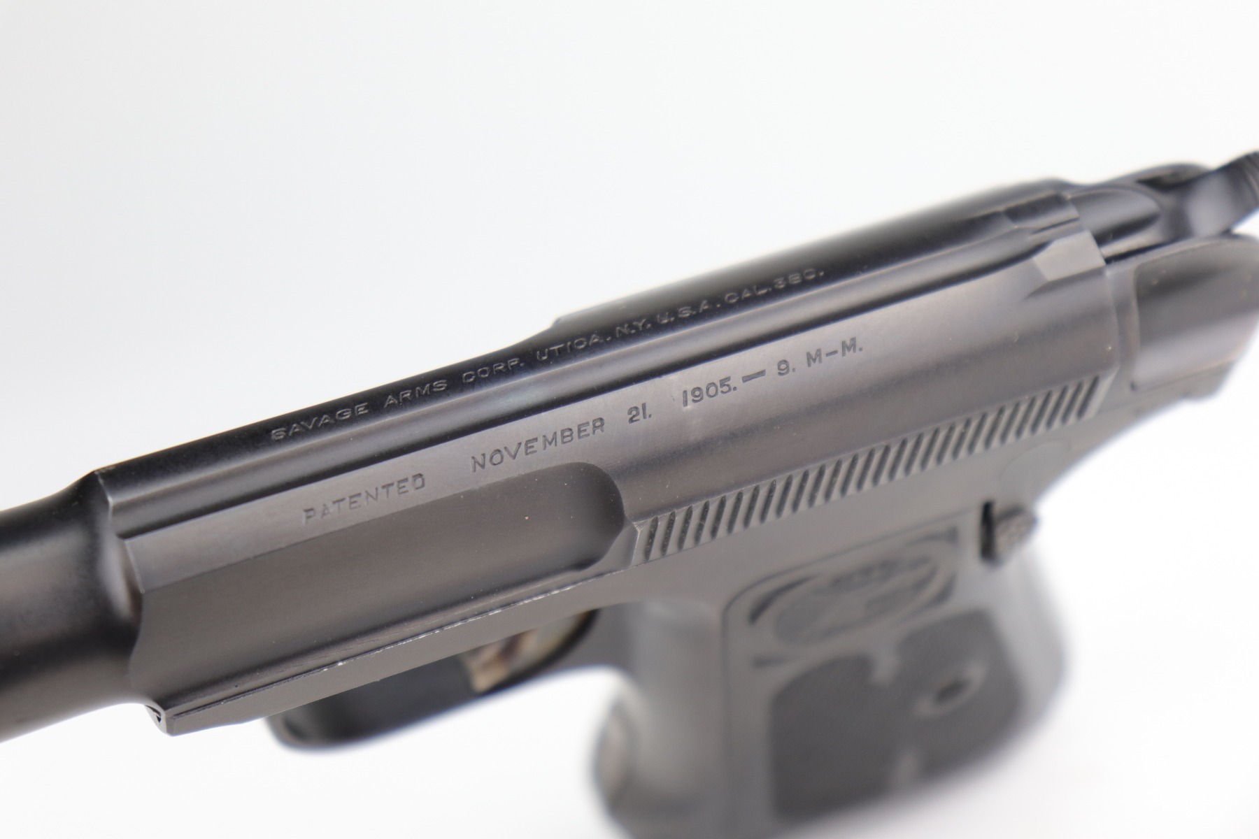10/8/20 – This is a original Savage Model 1907 in mint condition. It comes with an original box, owners manual, one magazine, and the original wrapping paper. The paper has “Abercrombie and Fitch”, likely the retailer this gun was originally shipped to. These guns were made between 1907-1920. The models 1907, 1915 & 1917 are all single-action pistols, but do have some minor differences. The 1907 uses molded hard rubber grips that do not use a screw for placement, and the mag catch operates by using the pinky to depress the bottom portion of the lever. This particular example is mint. The only sign of wear is one small spot of discoloration on the back strap. Excellent grips. The bore is near-mint.