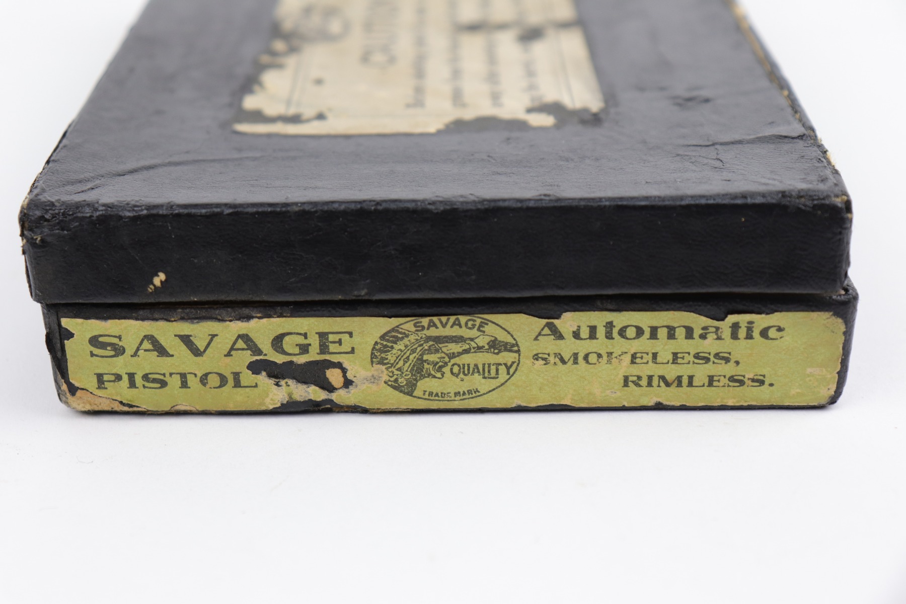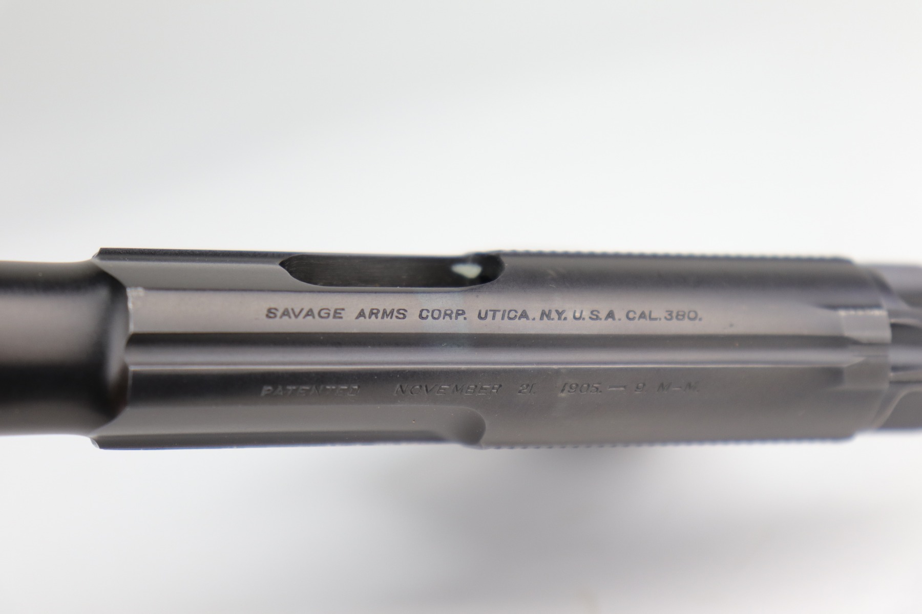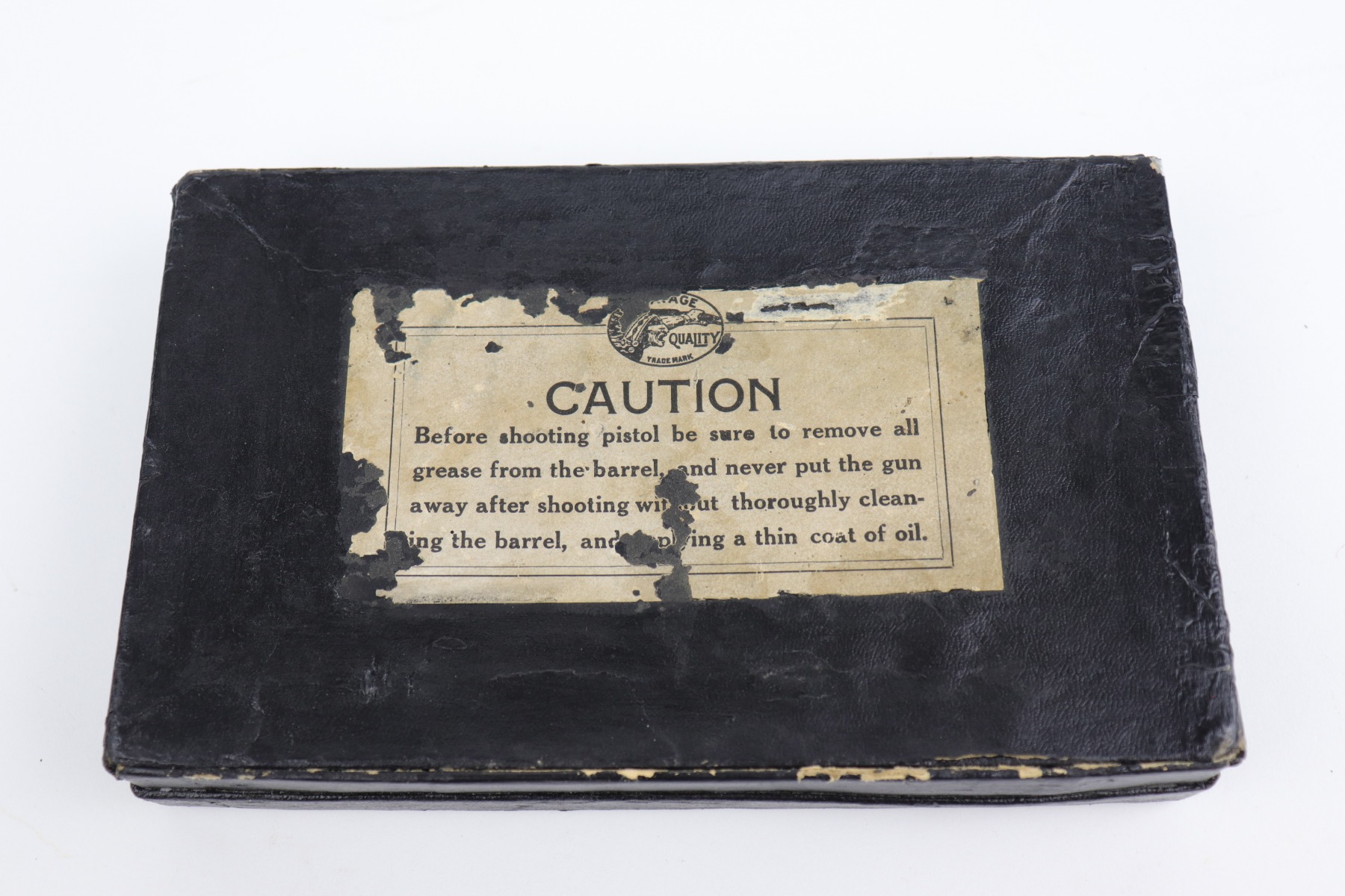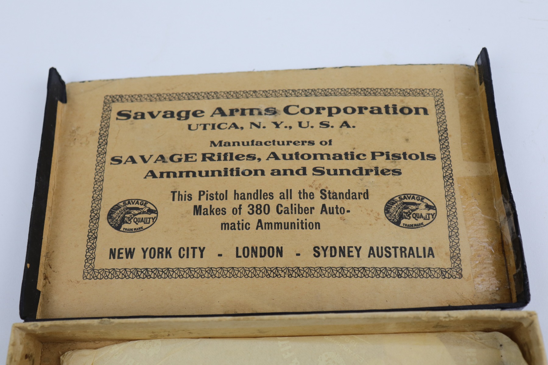 10/8/20 – This is a original Savage Model 1907 in mint condition. It comes with an original box, owners manual, one magazine, and the original wrapping paper. The paper has “Abercrombie and Fitch”, likely the retailer this gun was originally shipped to. These guns were made between 1907-1920. The models 1907, 1915 & 1917 are all single-action pistols, but do have some minor differences. The 1907 uses molded hard rubber grips that do not use a screw for placement, and the mag catch operates by using the pinky to depress the bottom portion of the lever. This particular example is mint. The only sign of wear is one small spot of discoloration on the back strap. Excellent grips. The bore is near-mint.