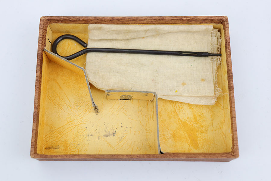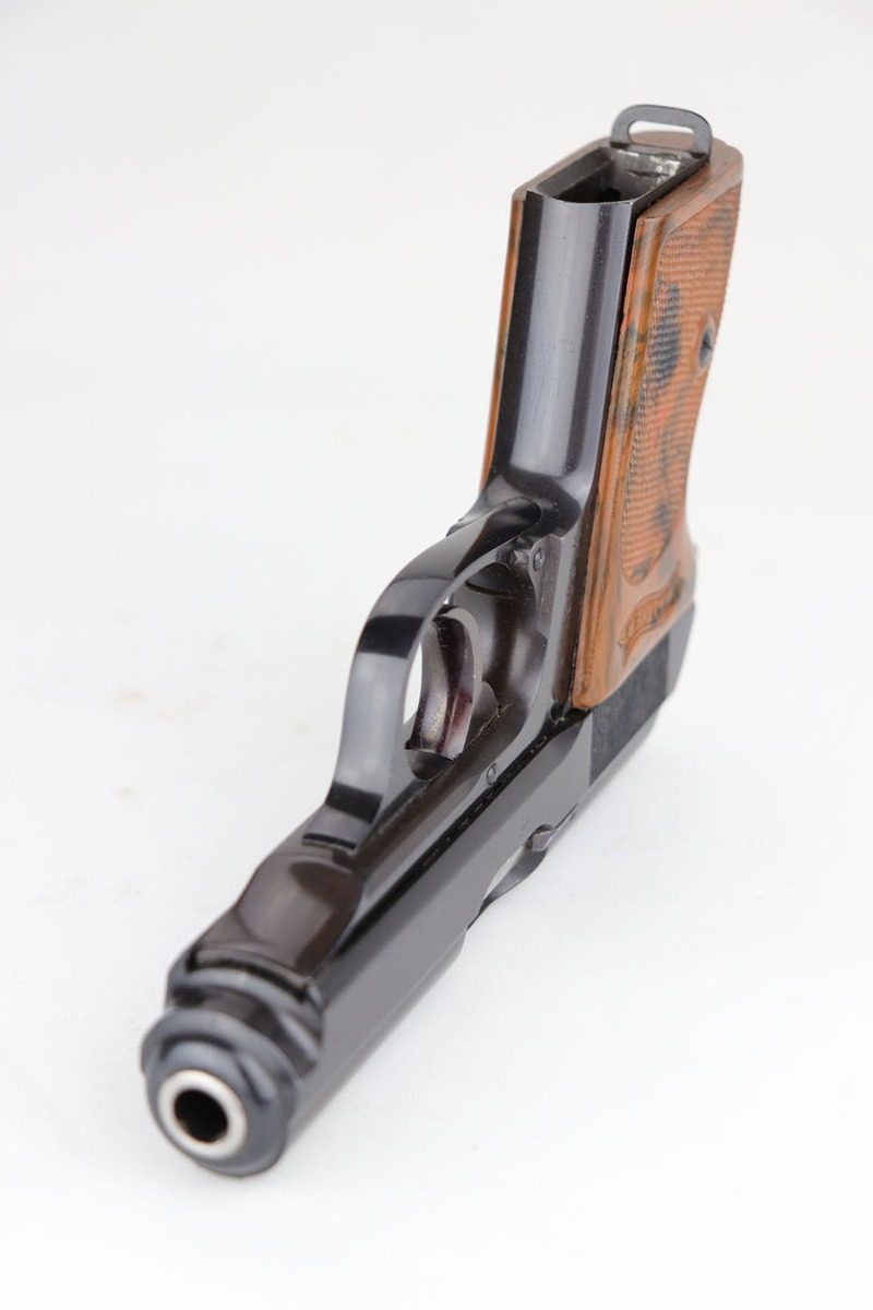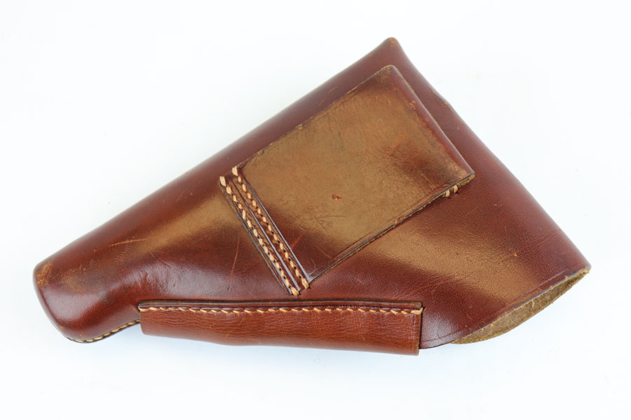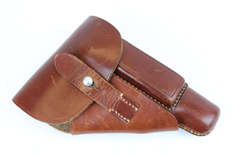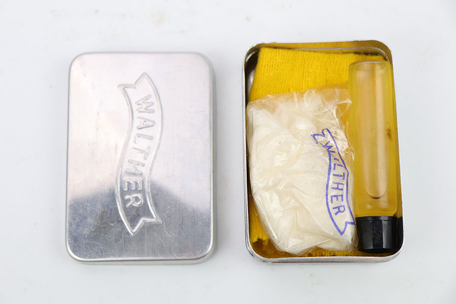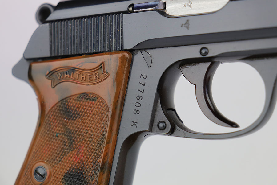 4/28/20 – This is a mint Walther PPK in its original matching box, and includes mint holster, manual, cleaning rod, spare magazine and cleaning tin. The pistol has just a hint of box wear on the muzzle and safety, but otherwise looks brand new. Minty grip and finger extension magazine, both with nice hints of red color that make them stand out. The box is also in great shape and has the serial of the pistol on the label. The holster is Akah marked and about as nice as they come. Manual dated to 1939 on the box.