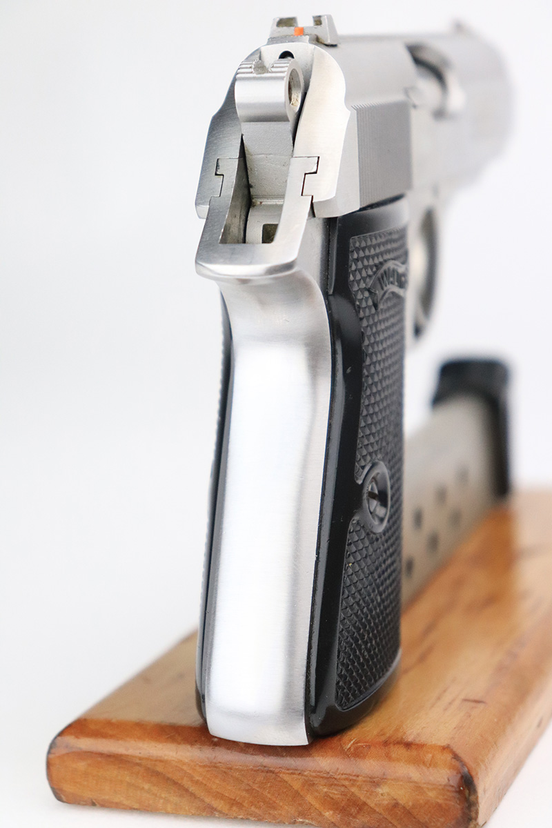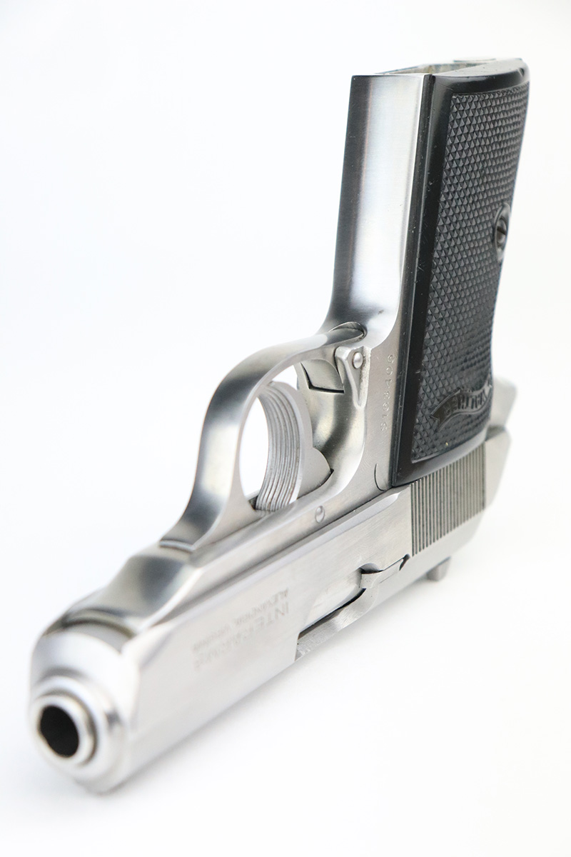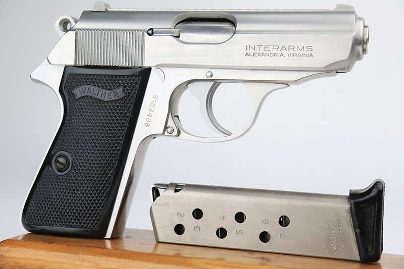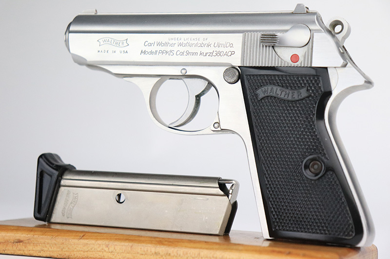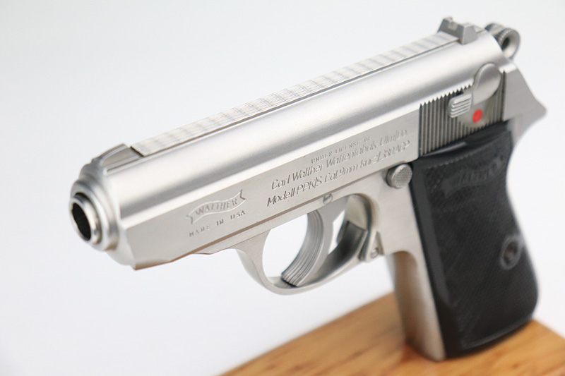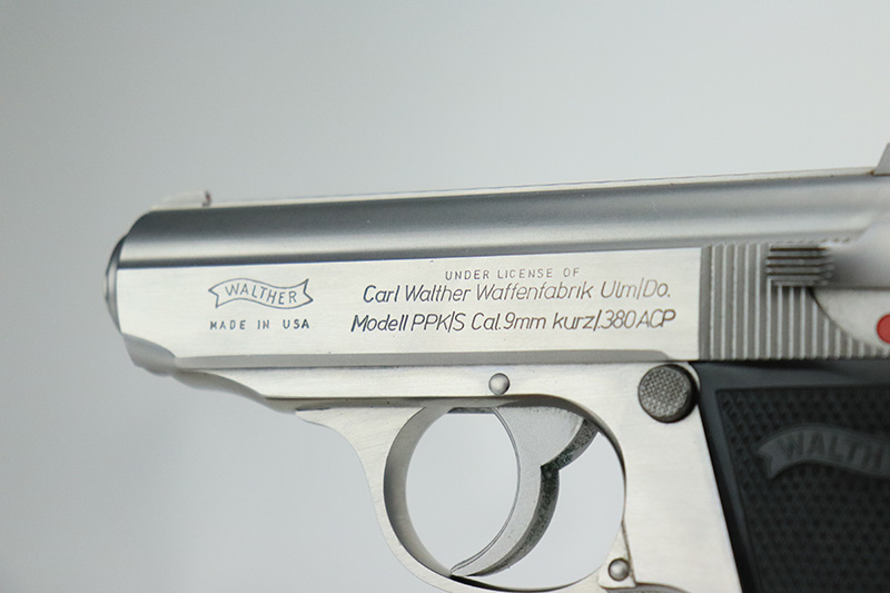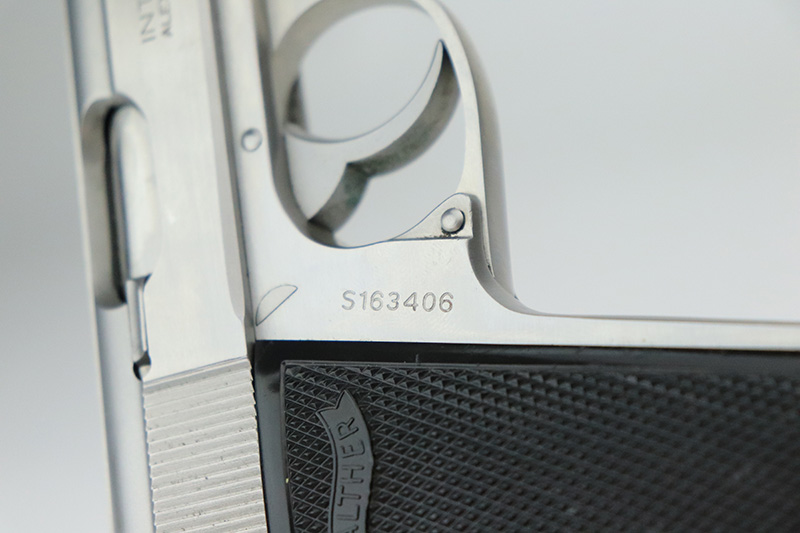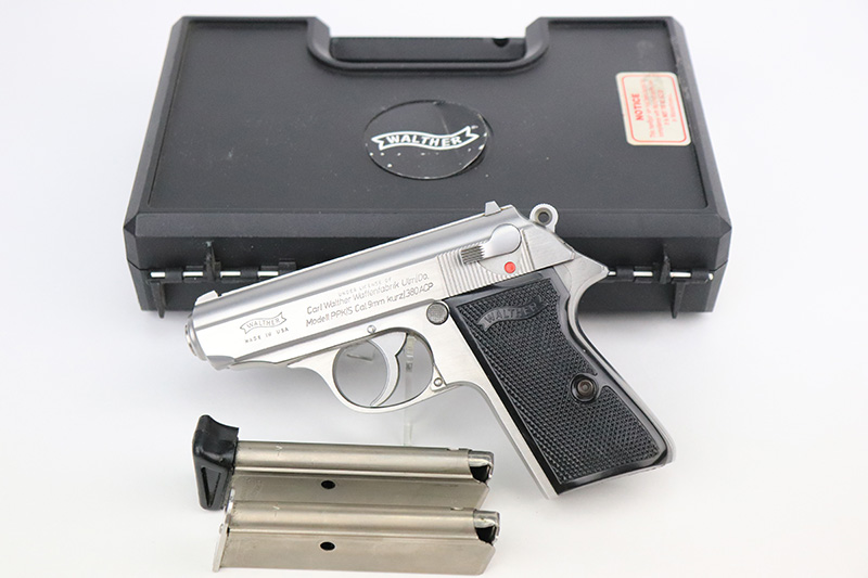 9/16/22 – This is a mint example of a Walther PPK/S chambered in 9mm Kurz or .380 ACP. Stainless finish. From the serial number, we believe it was manufactured in the 1980’s. It comes with its original matching-numbered hard case, owners manual, one finger extension magazine, and one flat bottom magazine. The gun is in mint, like-new condition with almost no signs of wear or use – there are just a couple of tiny handling marks here and there. Comes with excellent black plastic grips. The bore is near-mint.