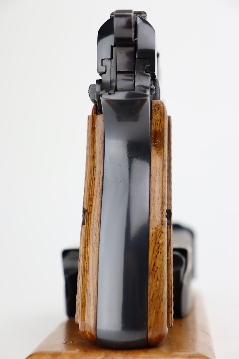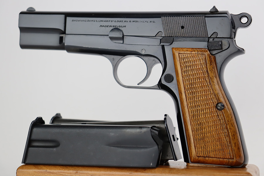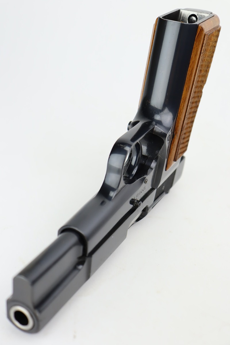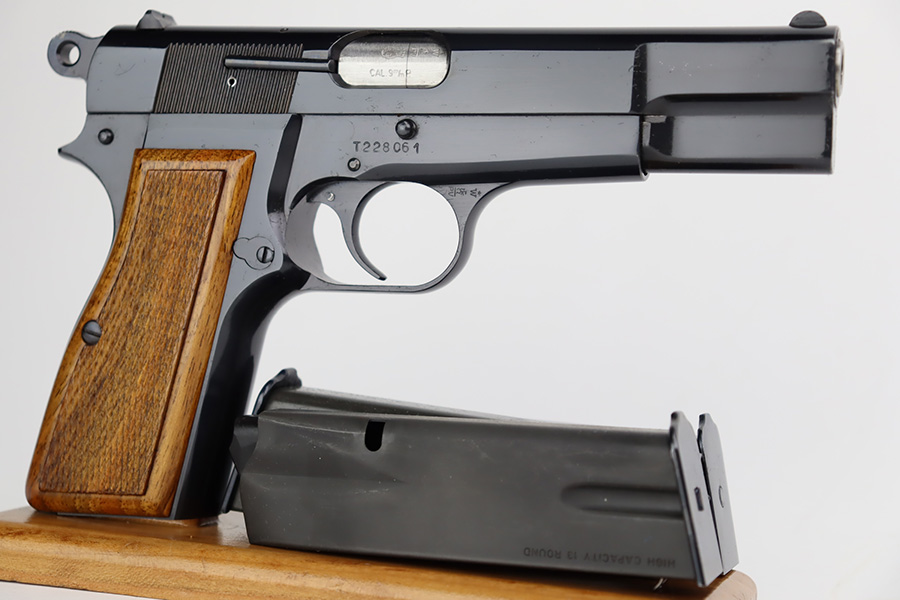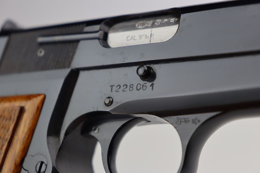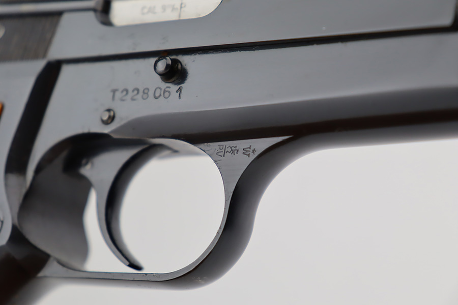9/8/23 – This is a mint example of a rare Browning Hi Power with T-Series serial. The “T Series” guns are regarded by collectors as being the last run of FN’s high polish guns with very quality fit and finish from the factory. The gun is in mint condition, appears unused. Just a few minuscule surface scuffs but no real bluing loss to mention. Mint grips and bore. Comes with manual and two spare magazines. C&R eligible.