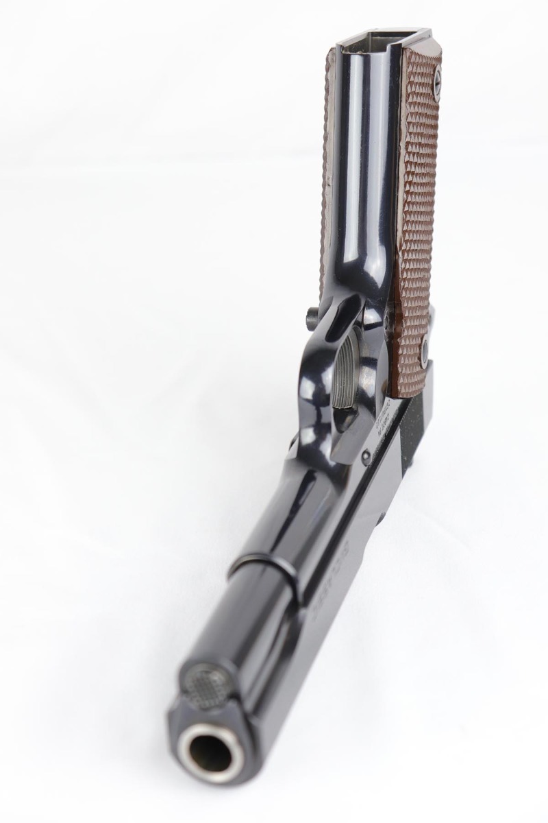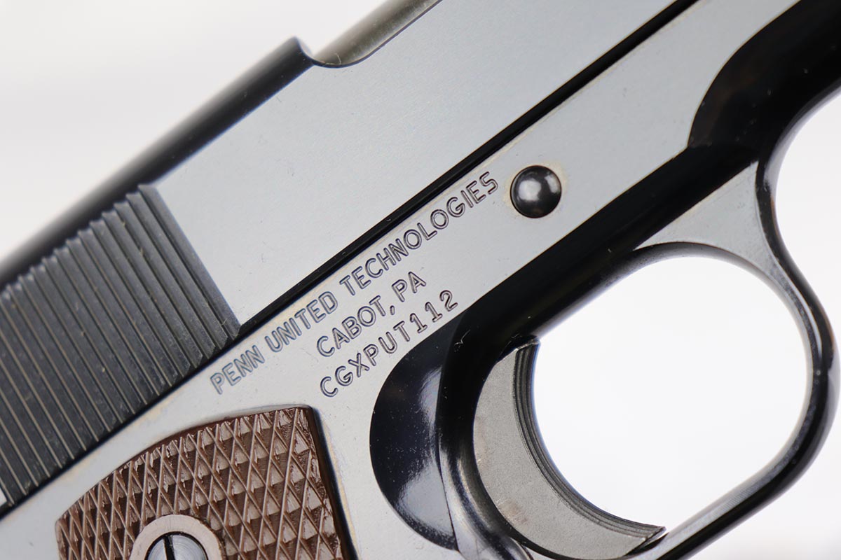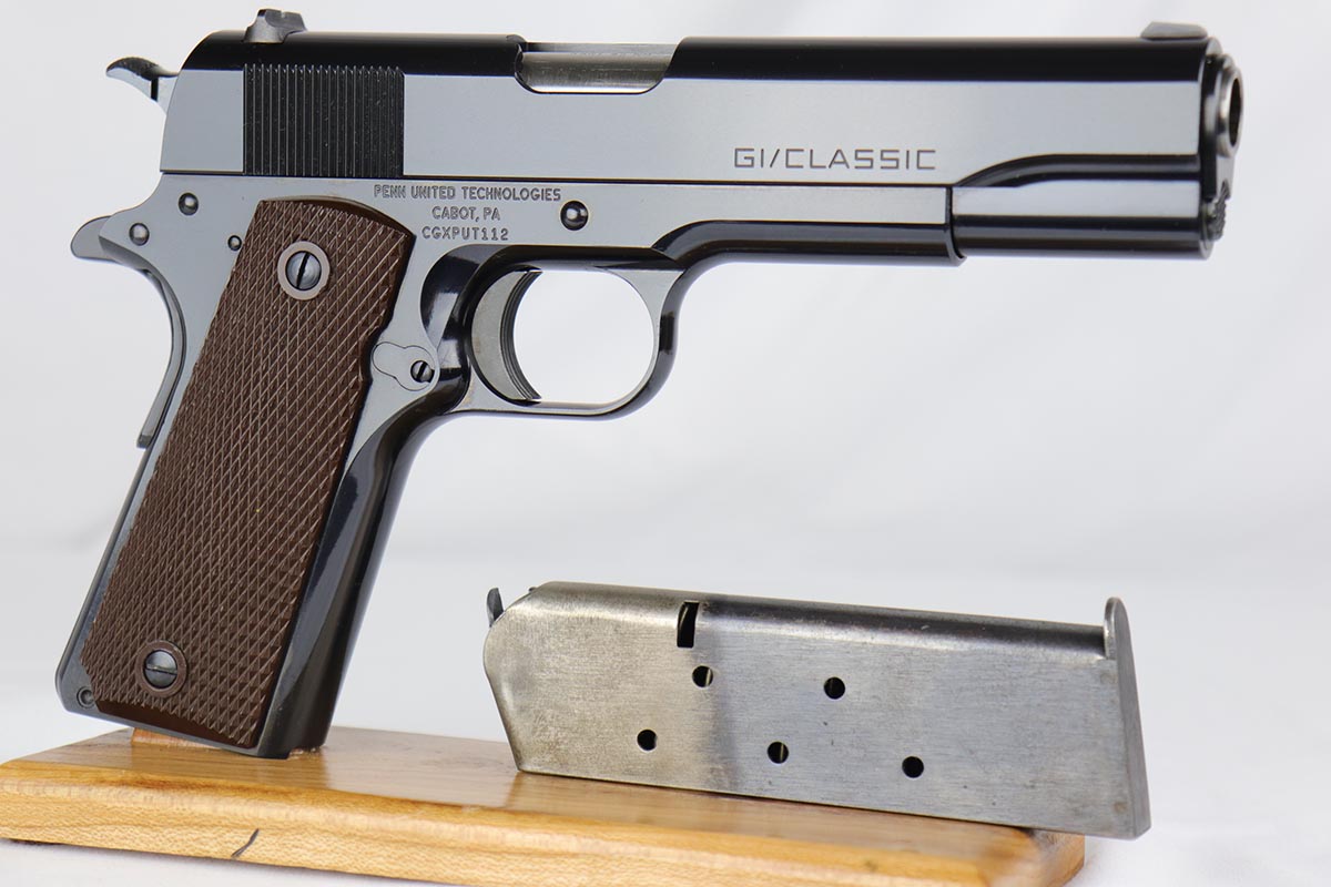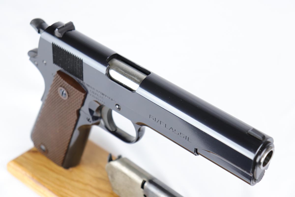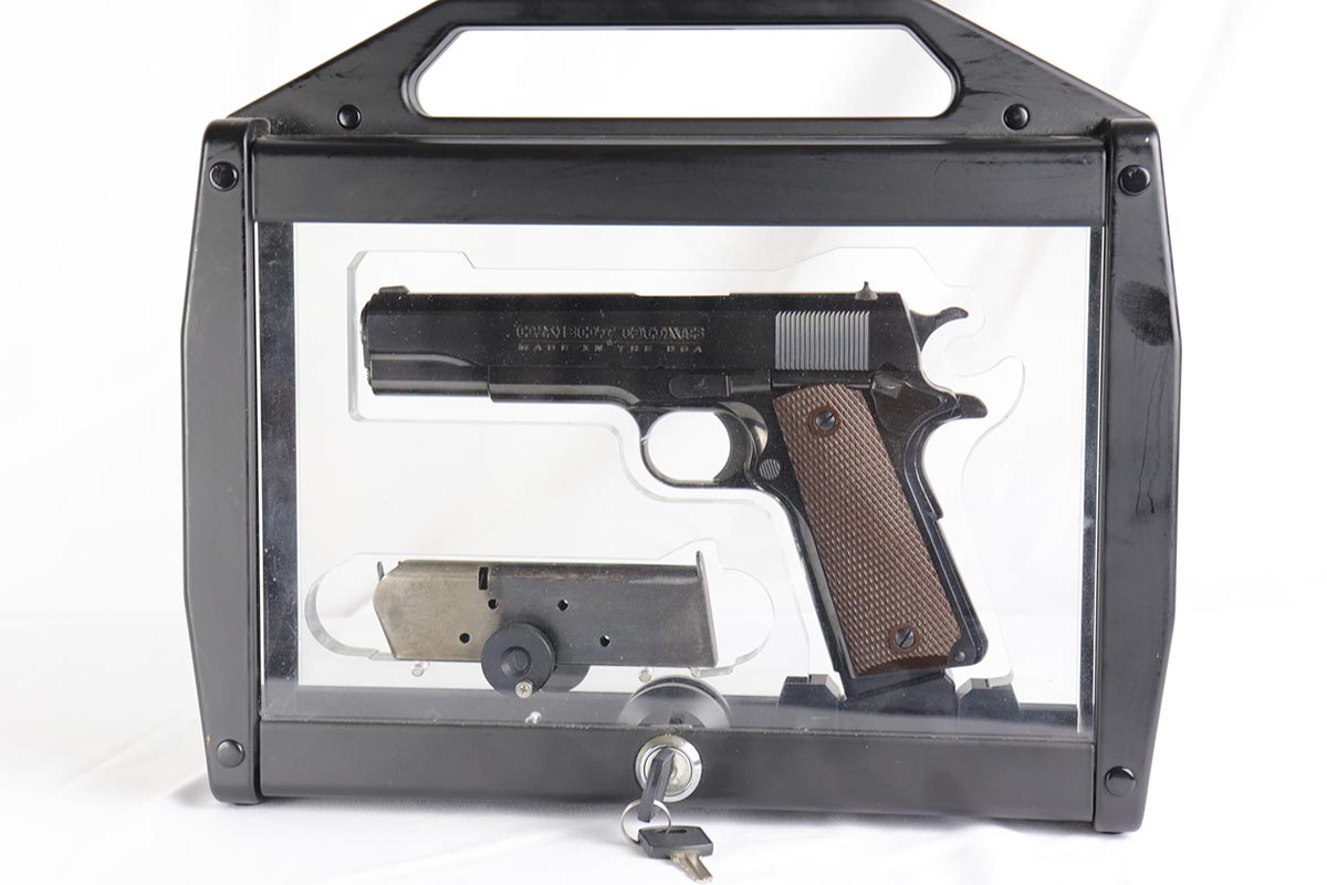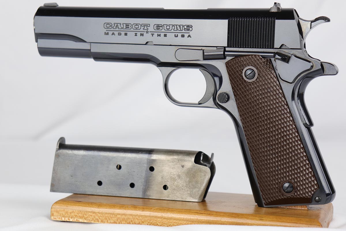 10/29/18 – This is a mint condition Cabot GI/Classic in the original display/carry case. Quoted from another site: “Built to near-unreasonably perfect Cabot specifications and to aerospace fit tolerances, the GI/Classic is the purest embodiment of John Moses Browning’s original 1911 design. Truly a piece of living American history, the GI Classic is Cabot’s tip of the proverbial cap to the genius that inspired an American icon. The GI/Classic represents Cabot’s homage to American inventor and father of the modern firearm – John Moses Browning. His model 1911 pistol has armed American servicemen in overseas engagements throughout World War I, World War II, Korea, and Vietnam. It has become nothing less than an iconic emblem of Americana. Even today, civilian shooters, law enforcement agencies, and specialty units of the armed forces of the United States turn to the .45ACP caliber 1911 as their sidearm of choice. A 100 year pedigree of durability and reliability is hard to improve upon, but Cabot has done just that – we’ve approached the classic 1911 design through the lens of modern manufacturing techniques, unmatched quality control, and an attention to detail which borderlines on the obsessive. Each GI/Classic is a clone reproduced from the original ordnance prints issued to American armories for production after the design was adopted by the Army as the Standard US Service Pistol, Model 1911 in March of 1911. Cabot has improved upon the perfection of the timeless design by ensuring that each GI/Classic produced follows the original ordnance specifications to within two-ten-thousandths of an inch, precision achievable only by employing the highest quality CNC machine tools operated by the highest trained personnel. As with all of our products, every individual piece of the GI/Classic is American made and passes through rigorous quality control measures.”