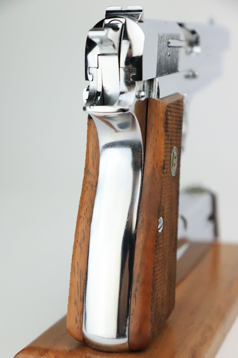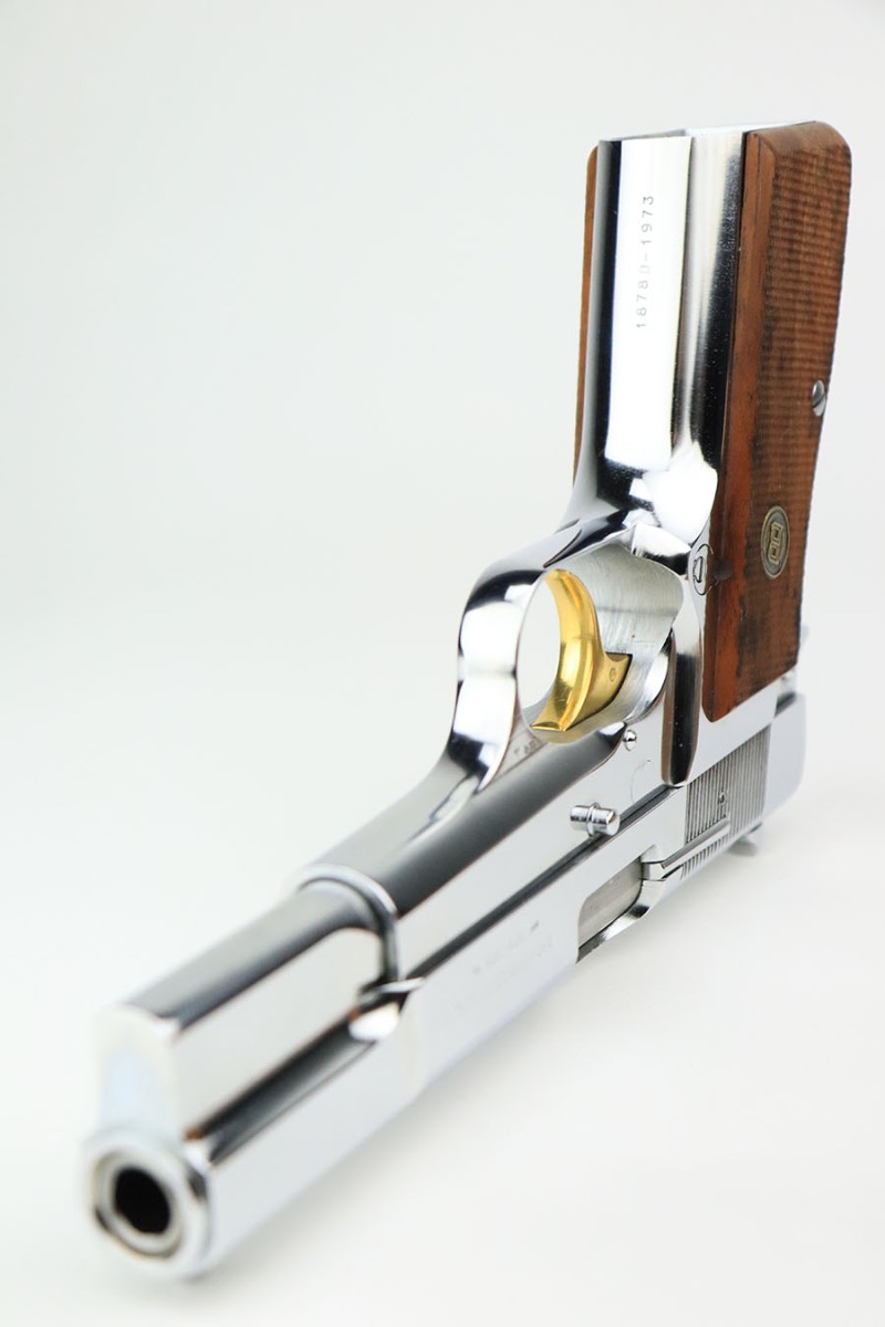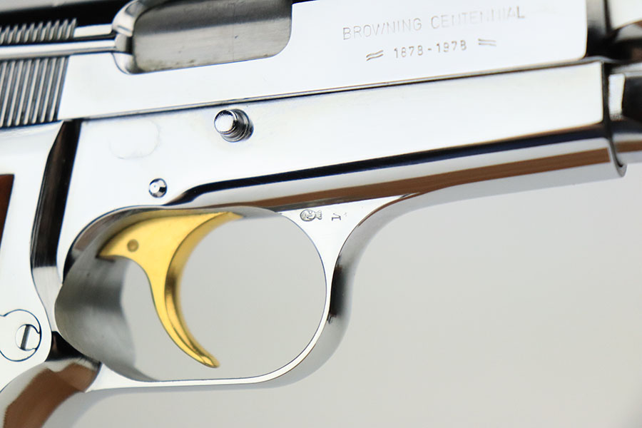 10/6/22 – This is a mint Browning Hi Power Centennial, one of only 3,700 made in 1978. Factory nickel finish in mint condition. Mint walnut grips and a mint bore. 13rd mag. Comes with the original case and owners manual.