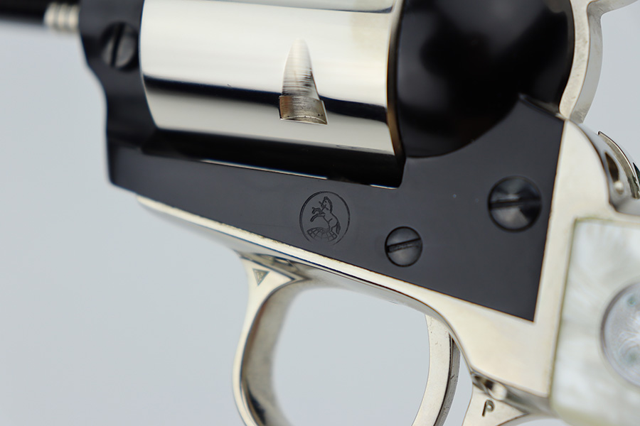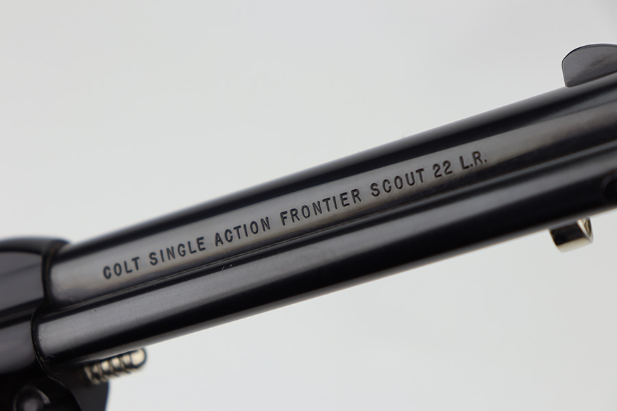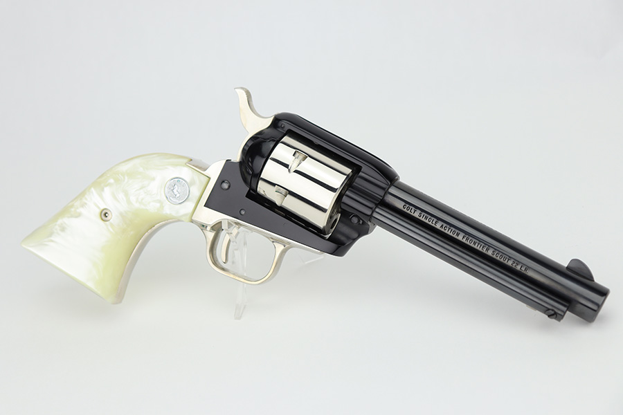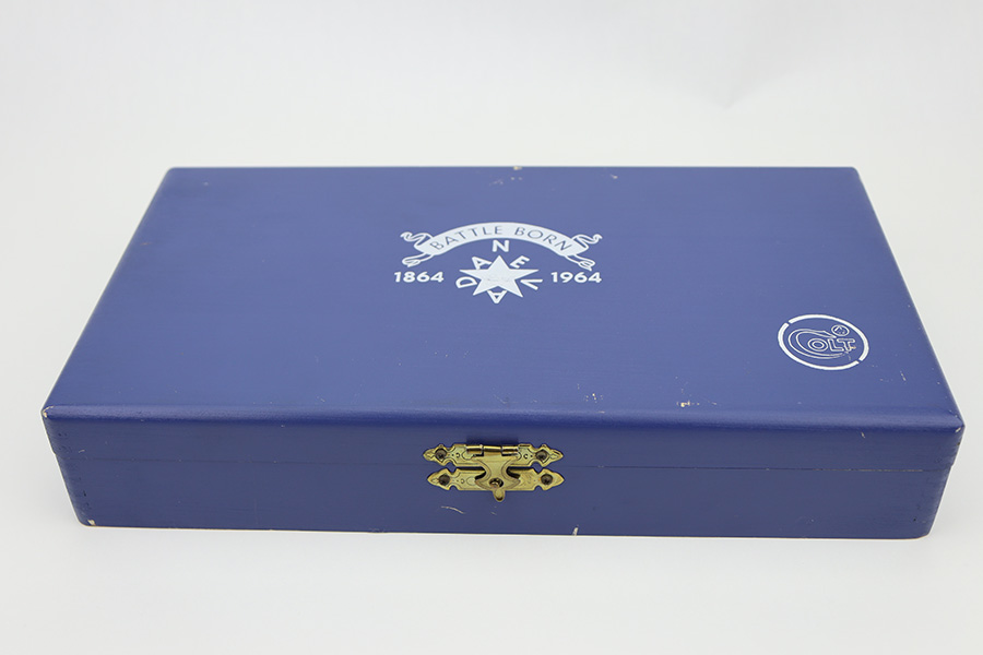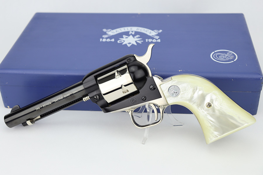 2/20/24 – This is an unfired example of a Colt Frontier Scout Revolver from 1964, chambered in .22 LR. This particular gun is a “Battle Born” Nevada Commemorative. The left side of the barrel reads “1864 – Nevada ‘Battle Born’ – 1964”. The frame and barrel are blued with nickel-plated accent parts. Fitted with beautiful pearl-colored grips. It comes in a blue wood presentation case that reads “Battle Born, Nevada, 1864-1964”. The gun is in mint, unfired condition with no signs of use. Mint bore.
