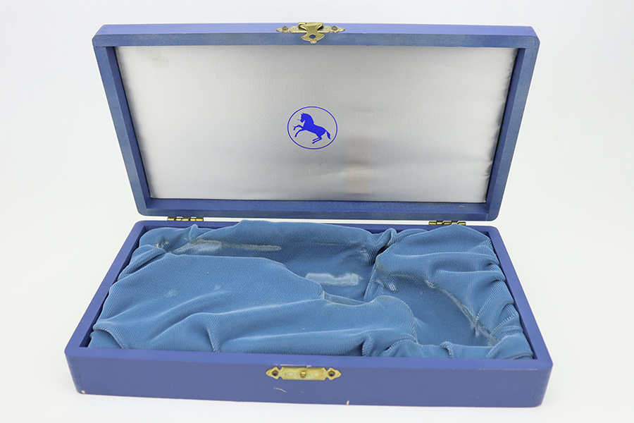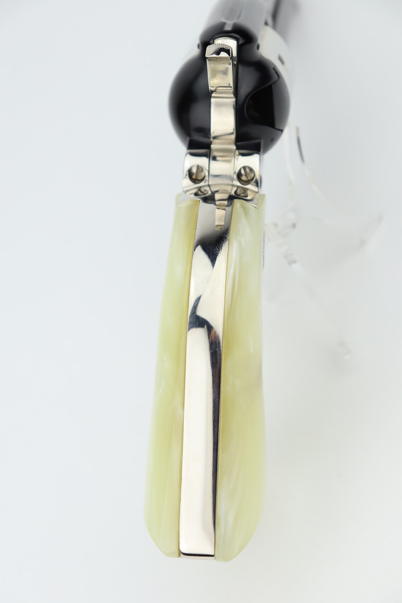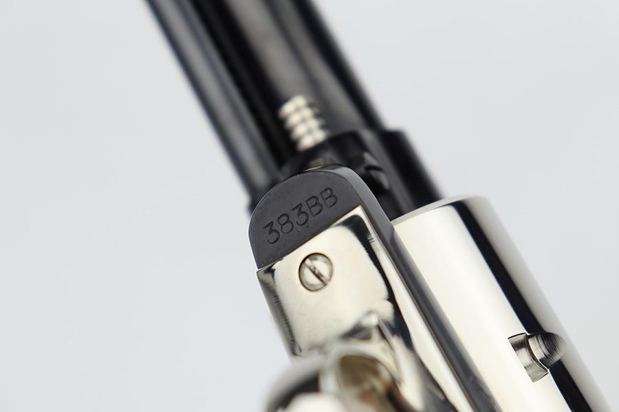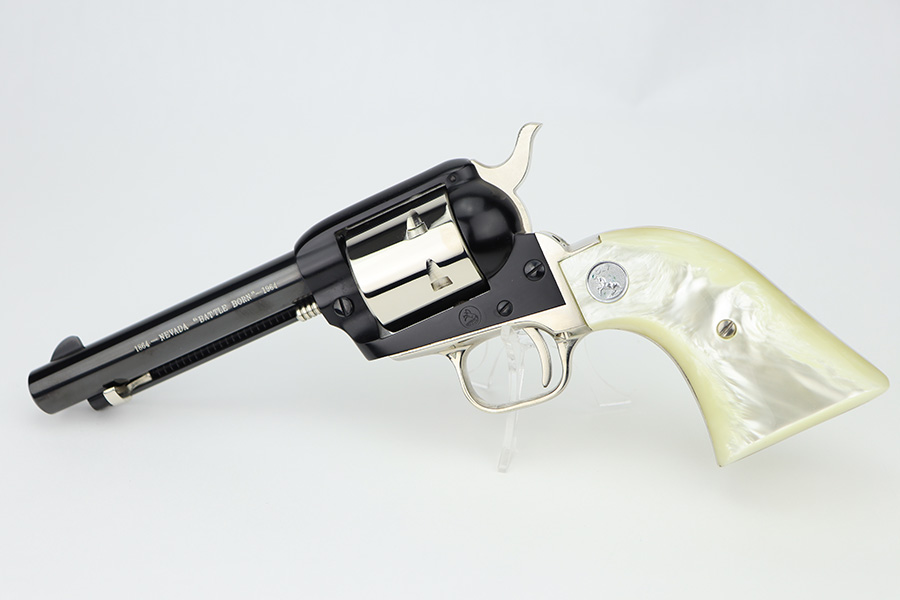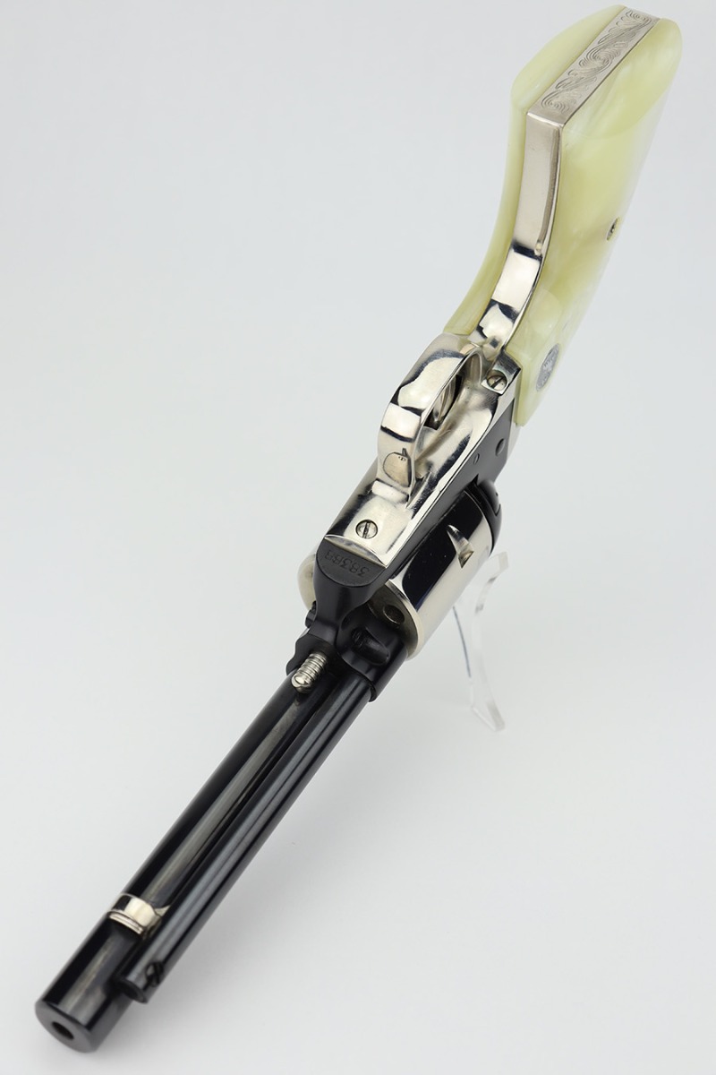 2/20/24 – This is an unfired example of a Colt Frontier Scout Revolver from 1964, chambered in .22 LR. This particular gun is a “Battle Born” Nevada Commemorative. The left side of the barrel reads “1864 – Nevada ‘Battle Born’ – 1964”. The frame and barrel are blued with nickel-plated accent parts. Fitted with beautiful pearl-colored grips. It comes in a blue wood presentation case that reads “Battle Born, Nevada, 1864-1964”. The gun is in mint, unfired condition with no signs of use. Mint bore.