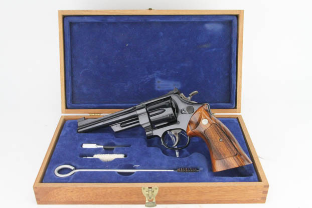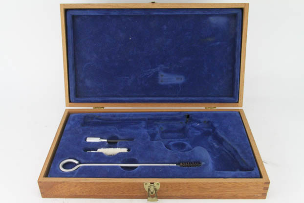 7/17/24 – This is a mint example of a Smith & Wesson Model 27-2 from 1978. Chambered in .357 Magnum with a 5 7/8 inch barrel. It comes with a wood presentation case and cleaning brush. The gun is mint with essentially no signs of wear or use – barely even a hint of a roll mark on the cylinder. Excellent case-hardening on the hammer and trigger. Fitted with minty checkered wood grips. Like-new bore. Smooth action.