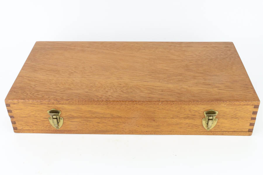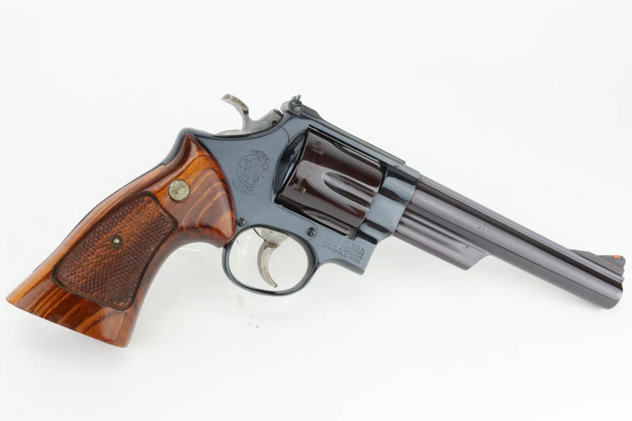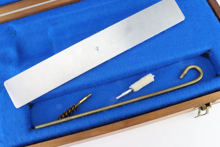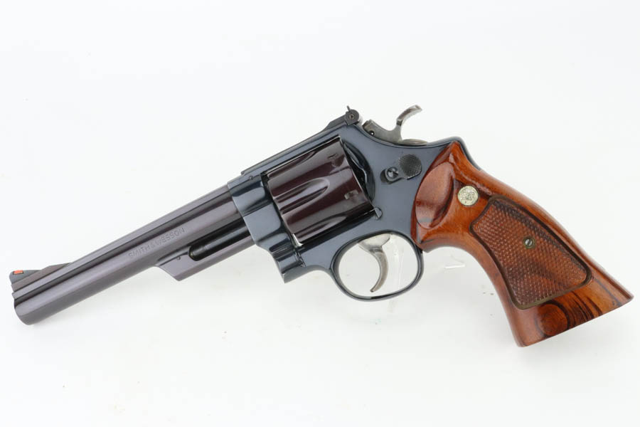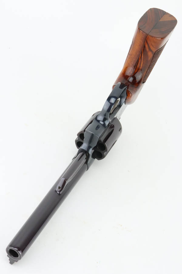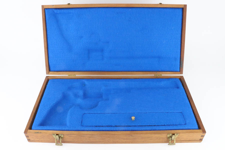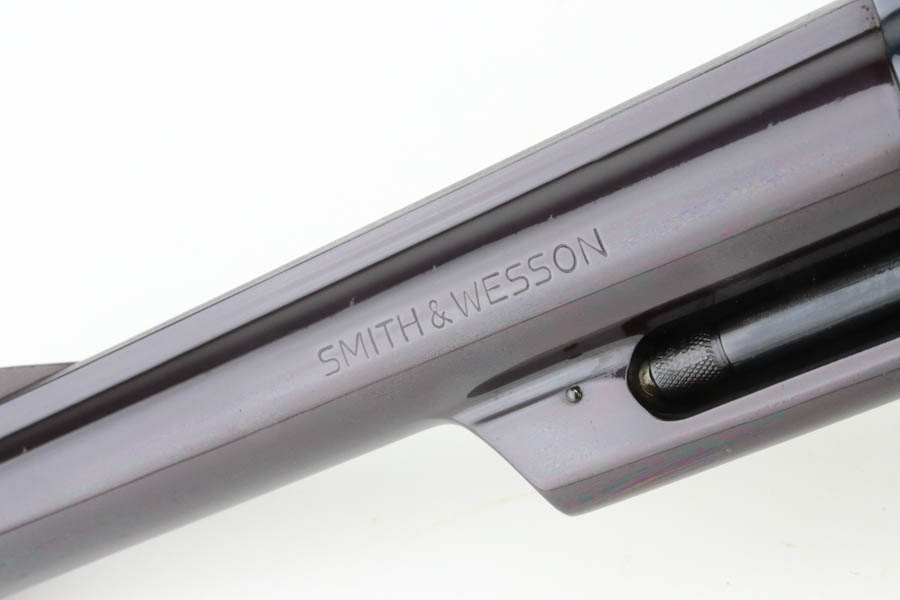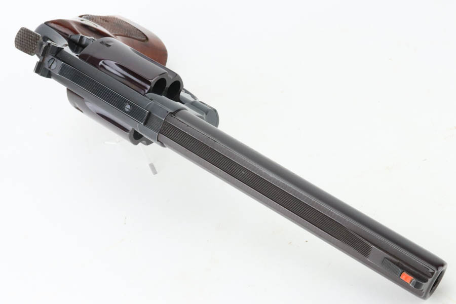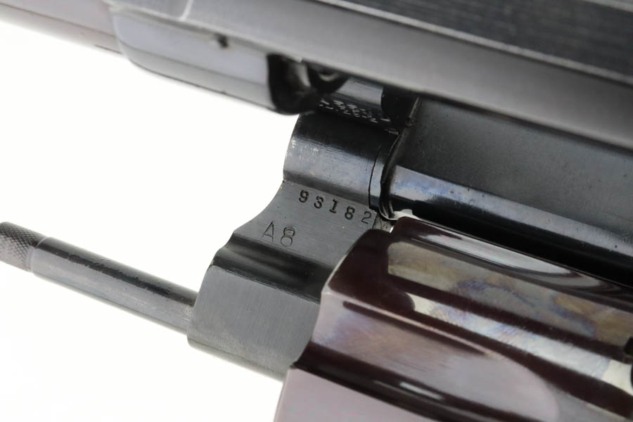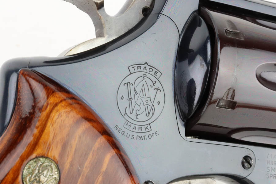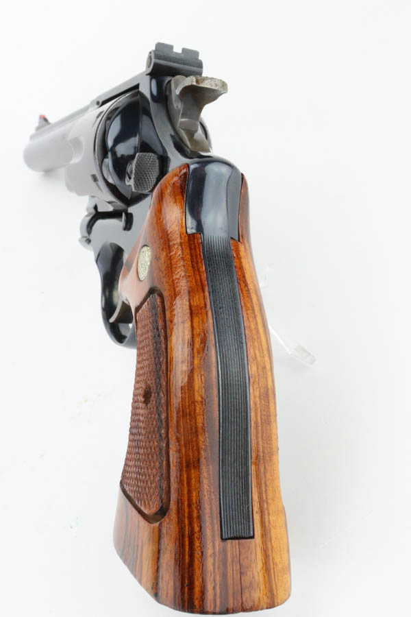 7/9/24 – This is a mint example of a Smith & Wesson Model 29-2, manufactured around 1977. Chambered in .44 Magnum with a 6.5 inch barrel. It comes with a wood presentation case with a cleaning rod. The gun is mint with no obvious signs of wear or use. The finish on the barrel and cylinder has a plum color to it. Fitted with mint hand-checkered Walnut grips. Mint bore.