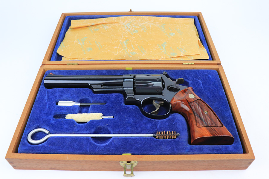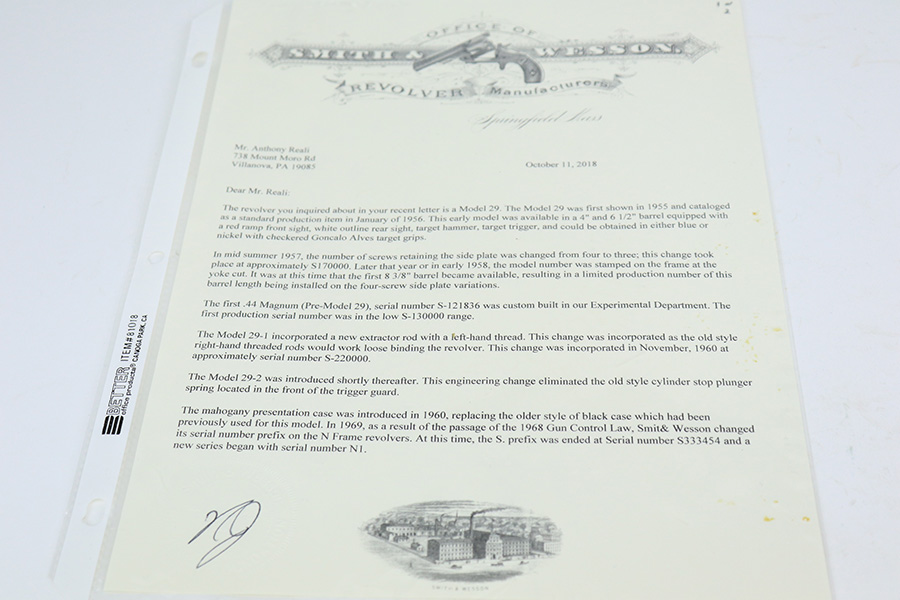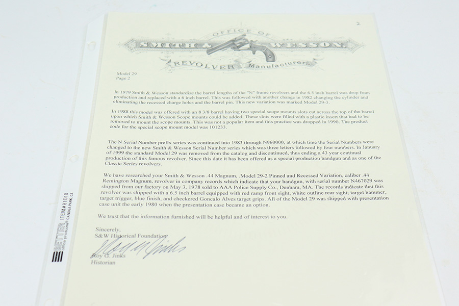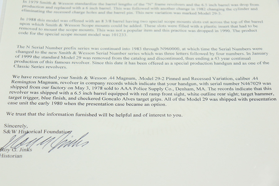 5/20/22 – This is a mint, cased Smith & Wesson Model 29-2 revolver from 1978. Accompanied by a S&W letter stating it was shipped in May of 1978 to the AAA Police Supply Company in MA. Proper 6.5in barrel with the checkered Goncalo Alves grips. Grips are excellent and unmarked but do have a few dings on the bottom. Beautiful case hardening on hammer and trigger of the gun. No wear on the firearm other than a very light turn line on the cylinder. FFL required.