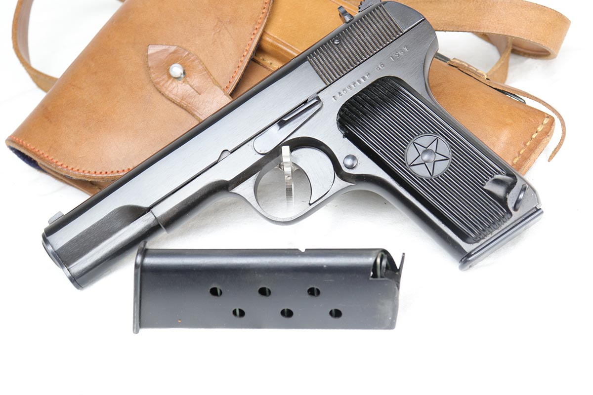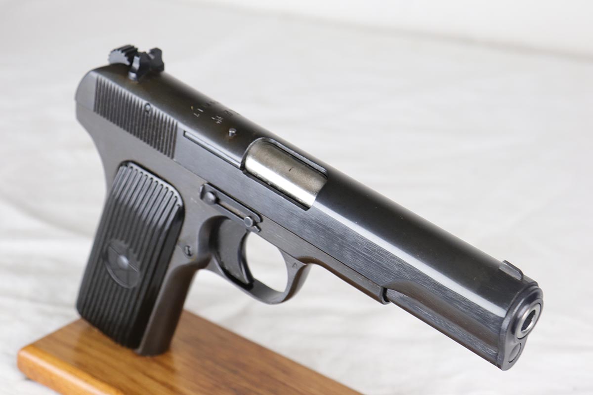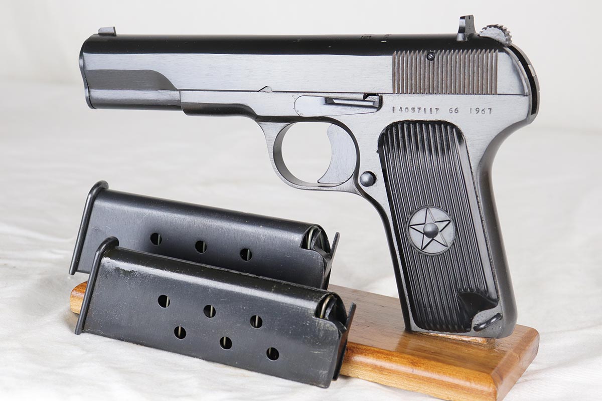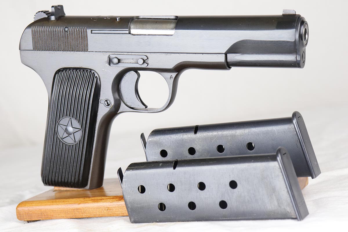 3/29/18 – This is a superb example of a Vietnam era Chinese copy of the Russian TT33 pistol. It is in 99% plus original condition with just a hint of handling wear. Unlike the majority of these guns, this one is dated 1967 and was probably brought back from Vietnam by one of the American servicemen, as it lacks any import marks. It is all matching except for two correct magazines and comes with an original Chinese made holster in excellent condition. Beautiful bore and minty grips. A great example of the Vietnam war bring-back.