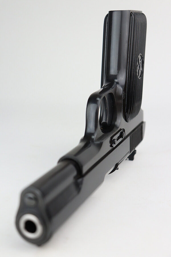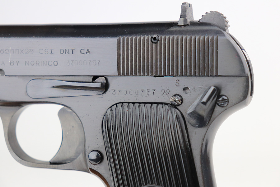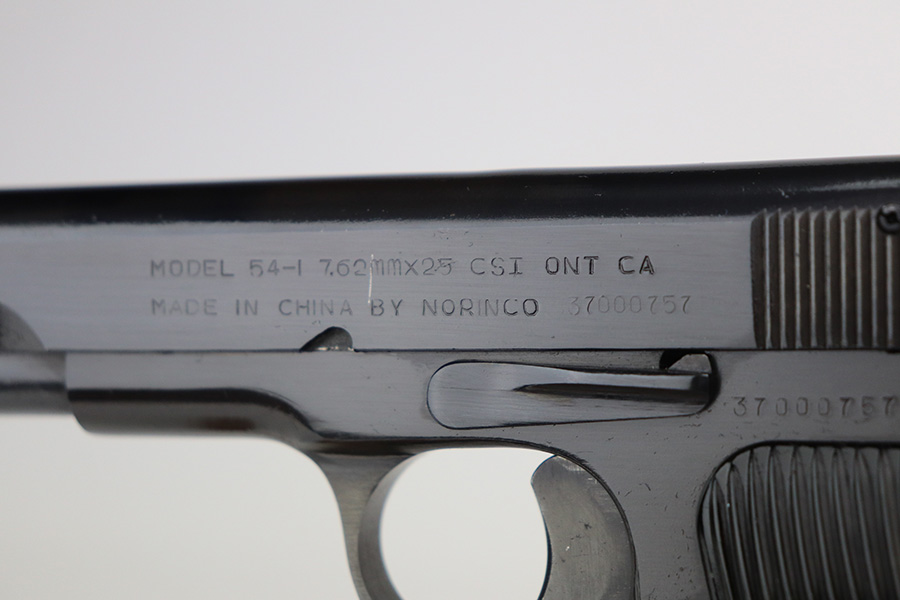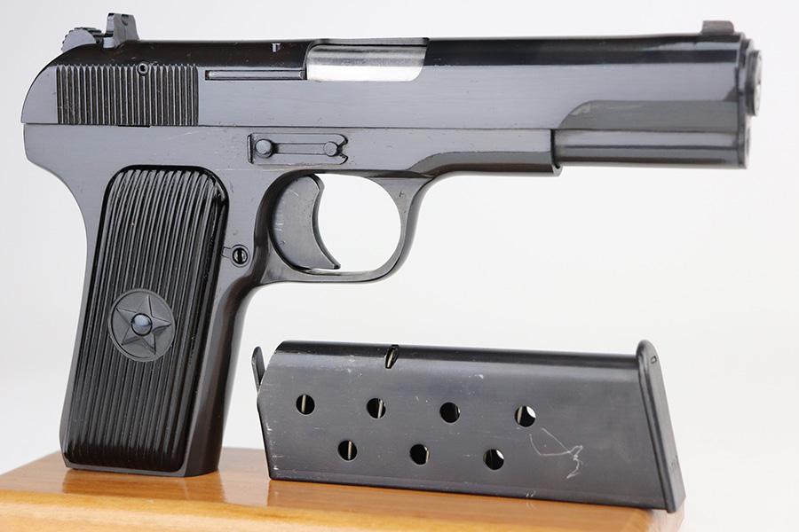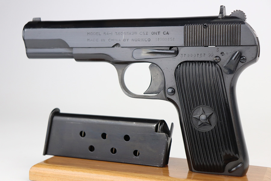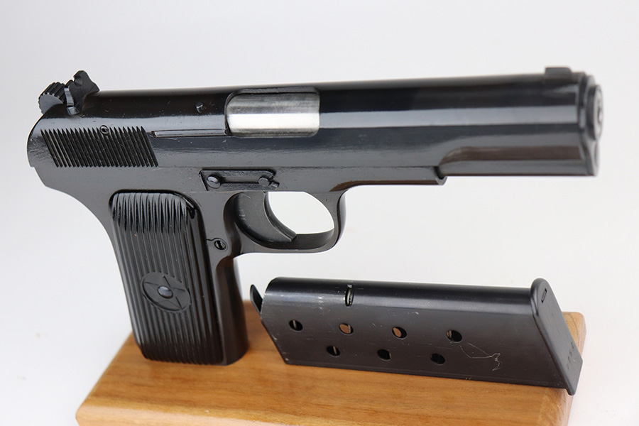 6/24/21 – This is a mint example of a Norinco Model 54-1, a Chinese copy of the Russian Tokarev TT-33. This one is all matching and comes with a period-correct holster and a matching-numbered magazine. The gun is in mint condition, retaining 99% of its bluing. There is just one light scratch on the left side of the slide. Excellent Chinese black bakelite grips. The bore is factory-new.