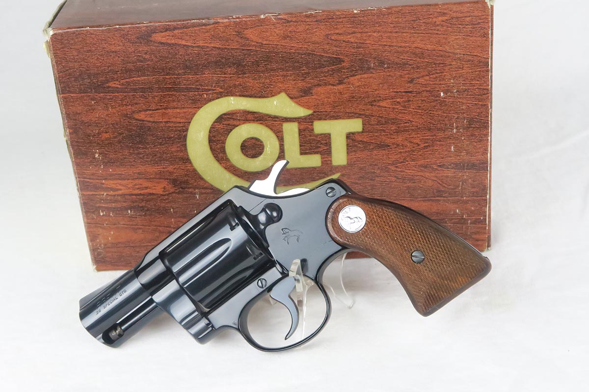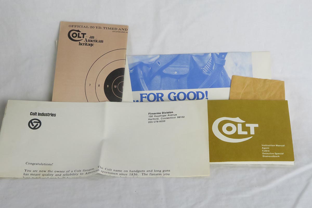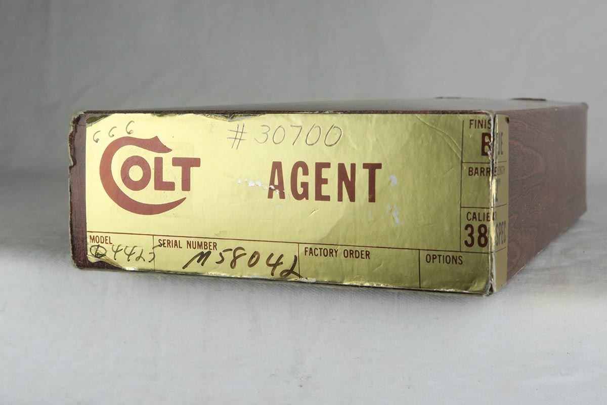 12/15/17 – This is a mint Colt Agent revolver in the original box. The finish on the gun is original and shows no wear, with barely even a roll mark. Excellent box, which is matching to the gun. Minty grips and bore. Action is as new. Manufactured in 1976 and chambered in .38 special. Comes with original Colt manual and some other original Colt-issued paperwork.