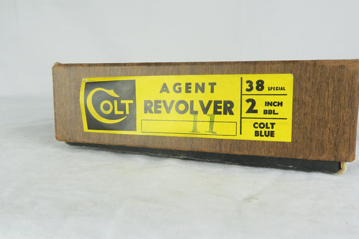 12/15/17 – This is a mint Colt Agent revolver in the original matching box.  It has a rare anodized finish and the grips are hand numbered to the gun.  The revolver has virtually no wear, and barely even has a roll mark.  Manufactured in 1971 and chambered in .38 special.  Mint bore and action is as new.