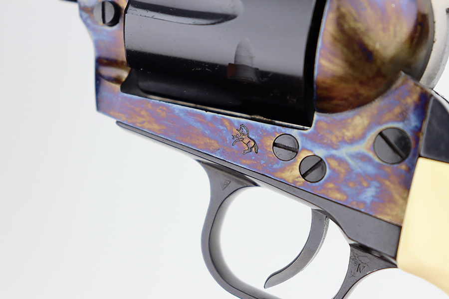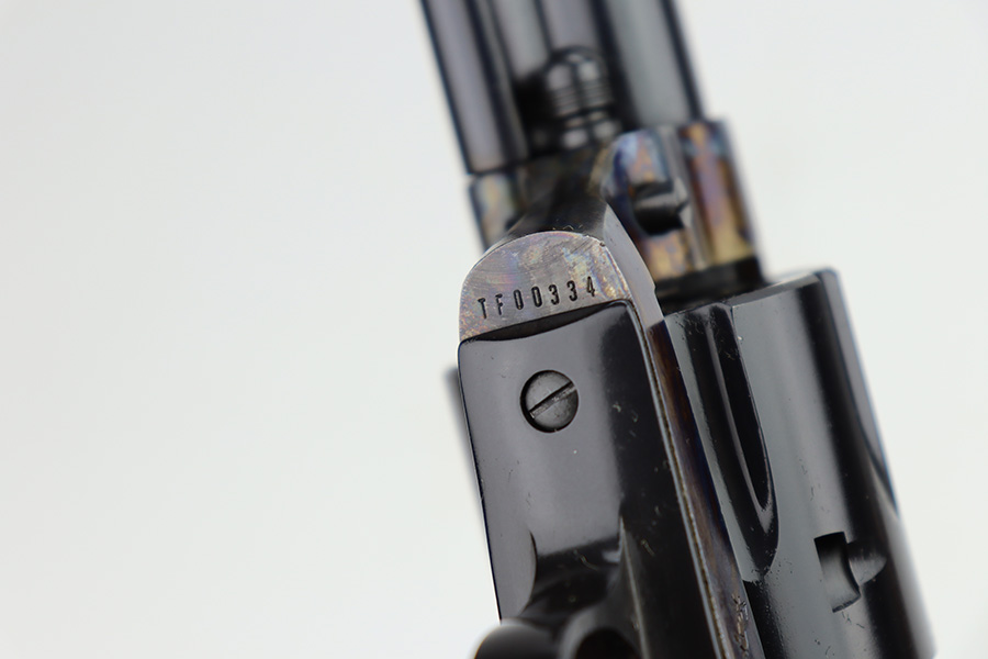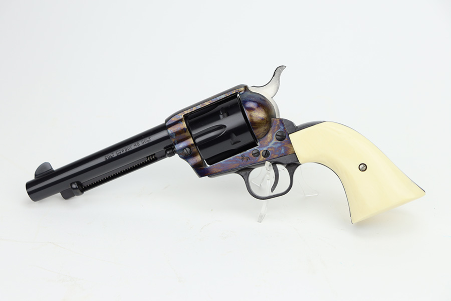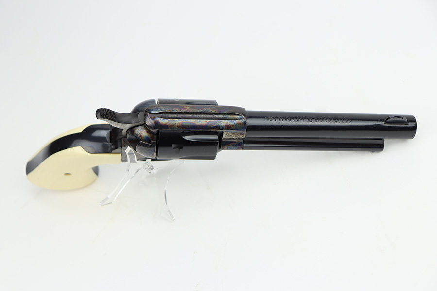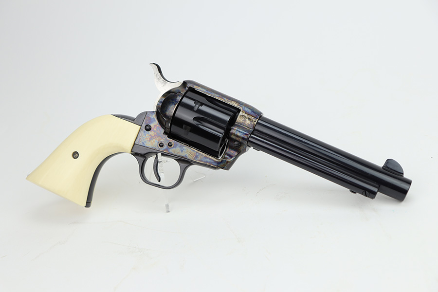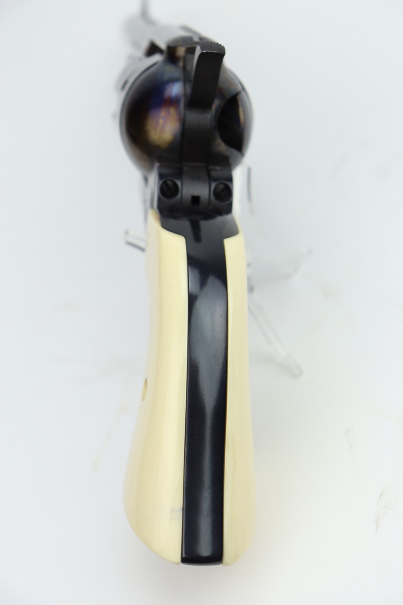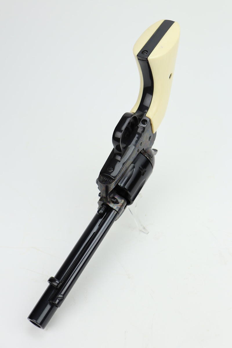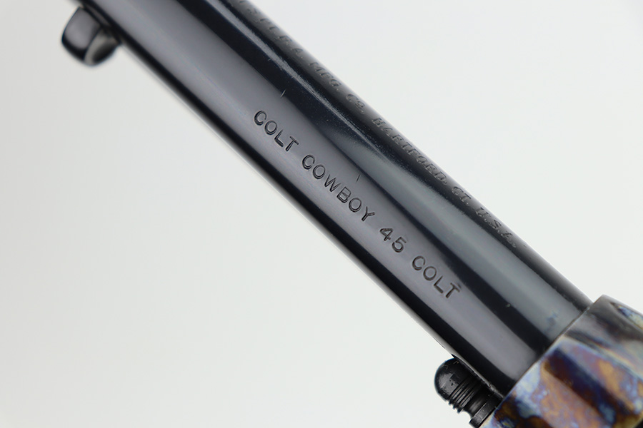 1/29/24 – This is a mint Colt Cowboy revolver from 2000. The gun appears to be in unfired or nearly unfired condition, with no turn line on the cylinder. 5.5in barrel with mint bore. Beautiful case hardened colors all throughout the receiver with blued barrel and polished hammer. Mint faux-ivory grips come with this one, as well. Designed similarly to the first generation single action army revolvers, these were only produced from 1999-2003.