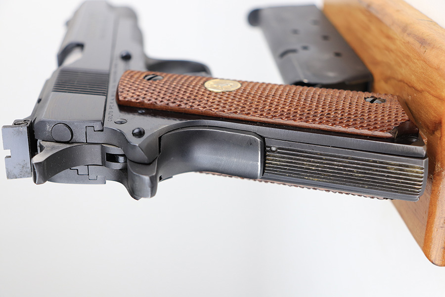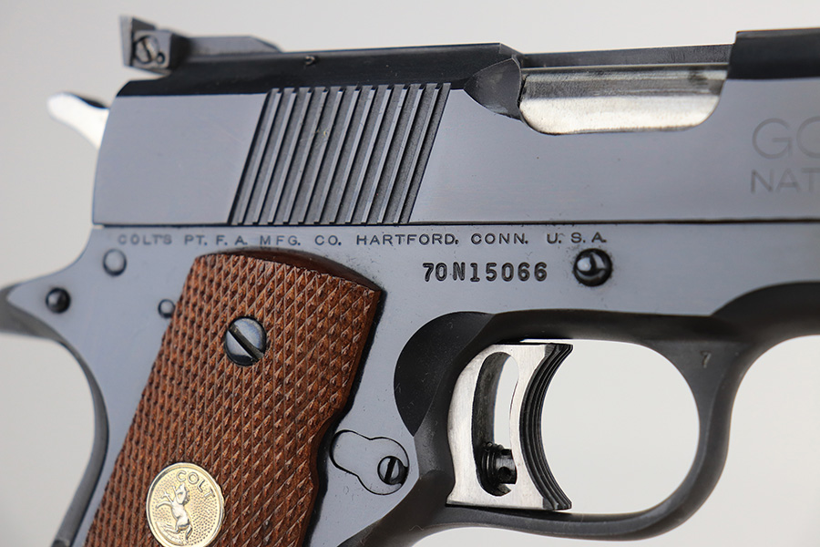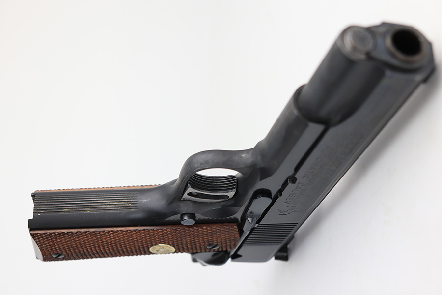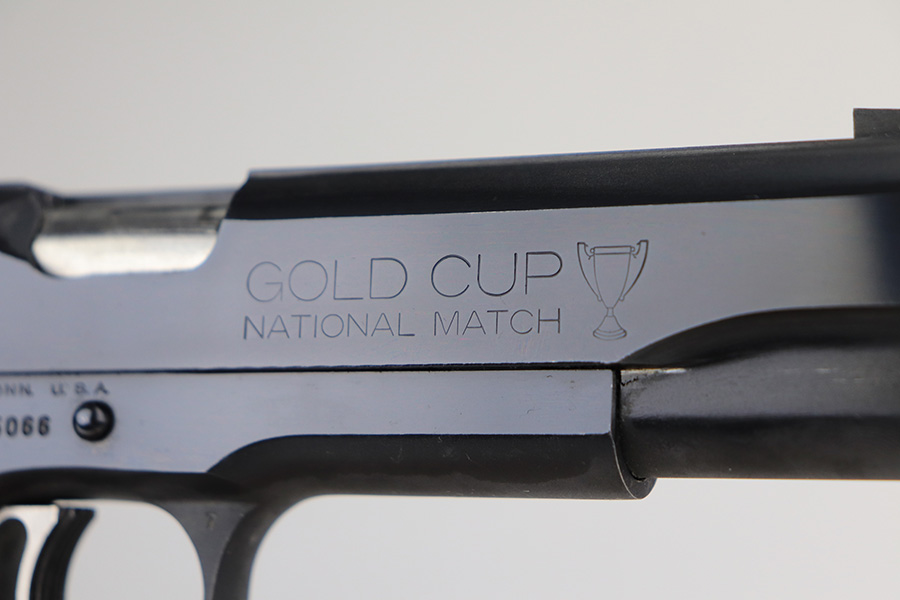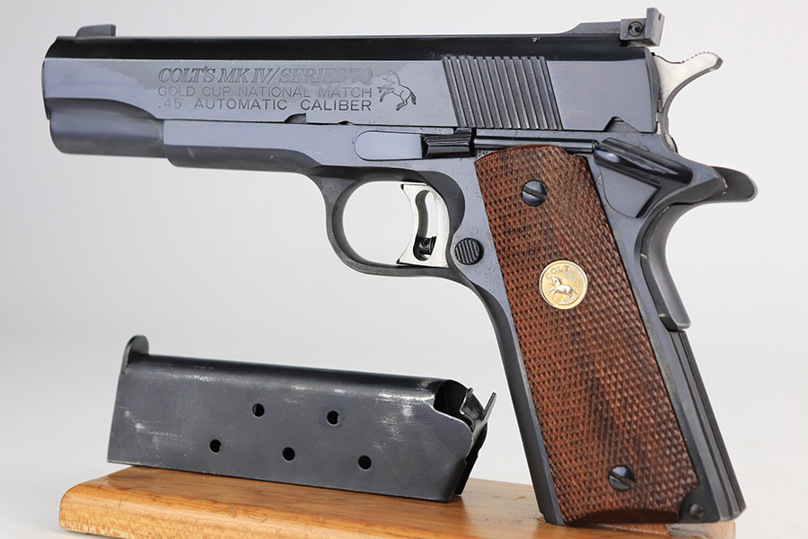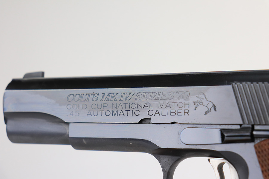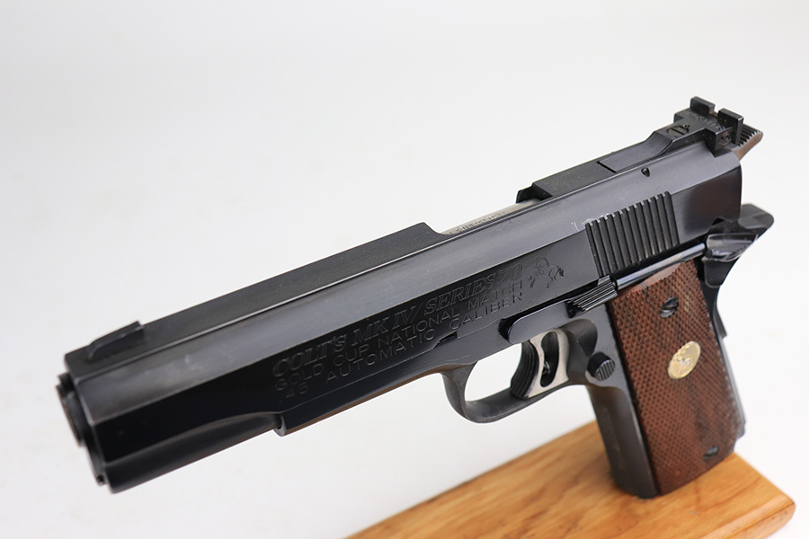 1/11/22 – This is a mint Colt Gold Cup National Match pistol from 1974. It’s a Mk IV Series 70 with 99+% of the original blue remaining. Just a tiny bit of high edge wear, but in nearly unfired condition with a mint bore and grips. From Colt’s website: “The Colt Gold Cup is known as the finest shooting semi-automatic in the world, and is the standard for competitive guns. The first Colt Gold Cup pistol was introduced in the late 1950’s to give competitive shooters a gun to take directly from the dealer’s showcase to the firing line. Colt Gold Cup pistols have been used to compete in local club matches through the National Matches at Camp Perry. This Gold Cup National Match features an Adjustable Wide Trigger, National Match® Barrel, Adjustable Target Sights, and many other refinements as standard.” NOTE: While the gun is nearly unfired condition, there is a line of discoloration on the left side of the slide. It’s not refinished but not sure what would’ve caused this.