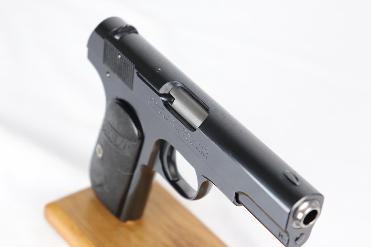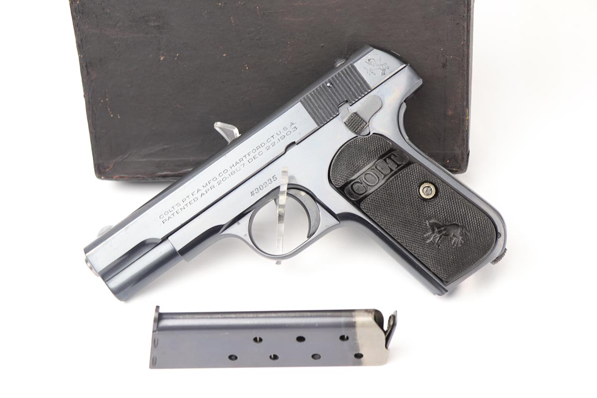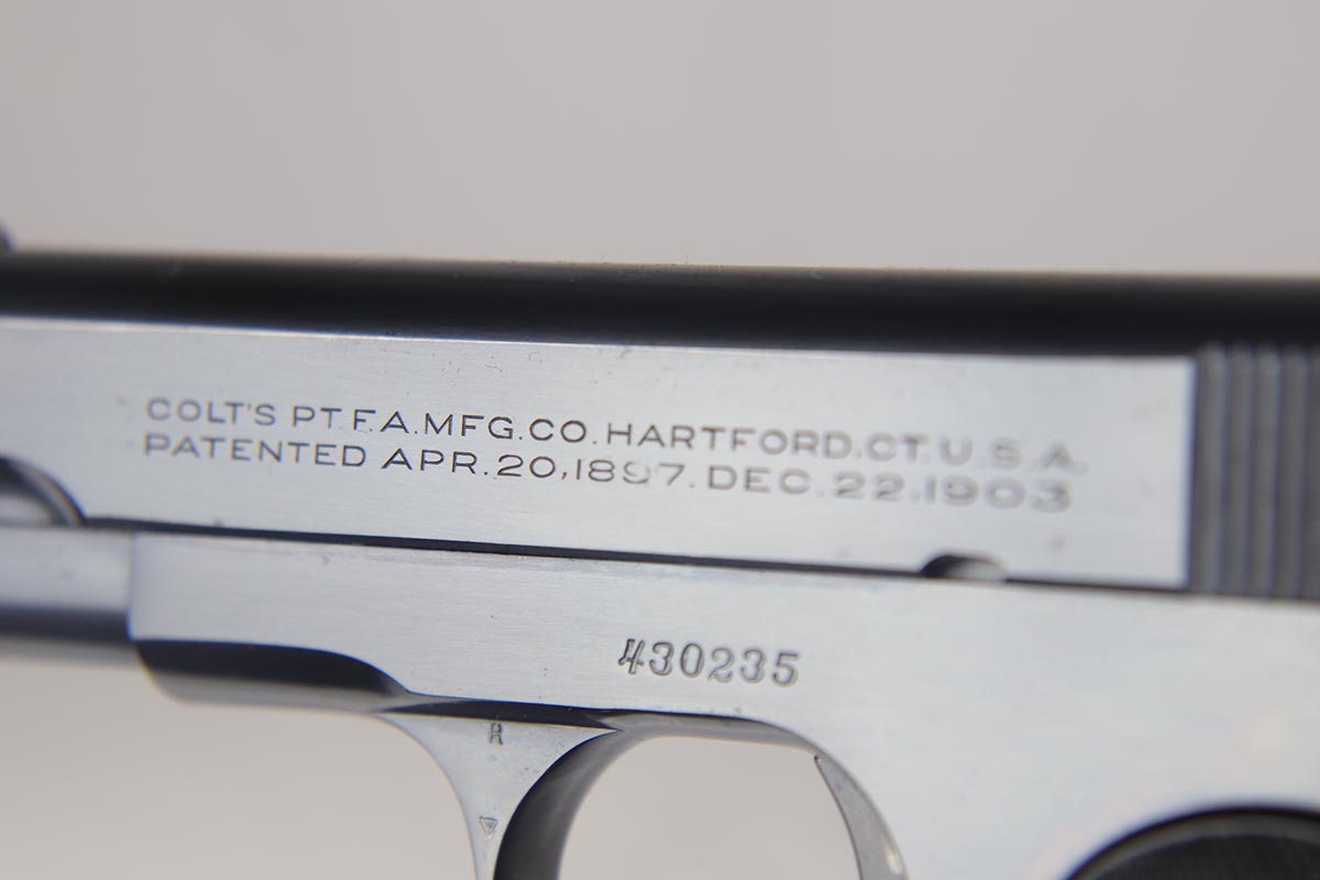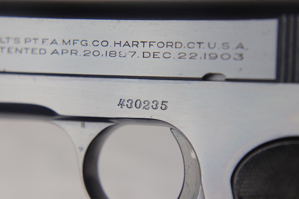 8/9/18 – This is a mint condition Colt M1903 in the original, matching hand-numbered box. Made in 1923, this pistol retains 99% original high-polish blue with only minor scuff marks on the back of the slide and light rub wear on high edges. Fantastic original grips, magazine and bore. The original box is in good condition but a previous owner did use glue to solidify the bond at the edges.