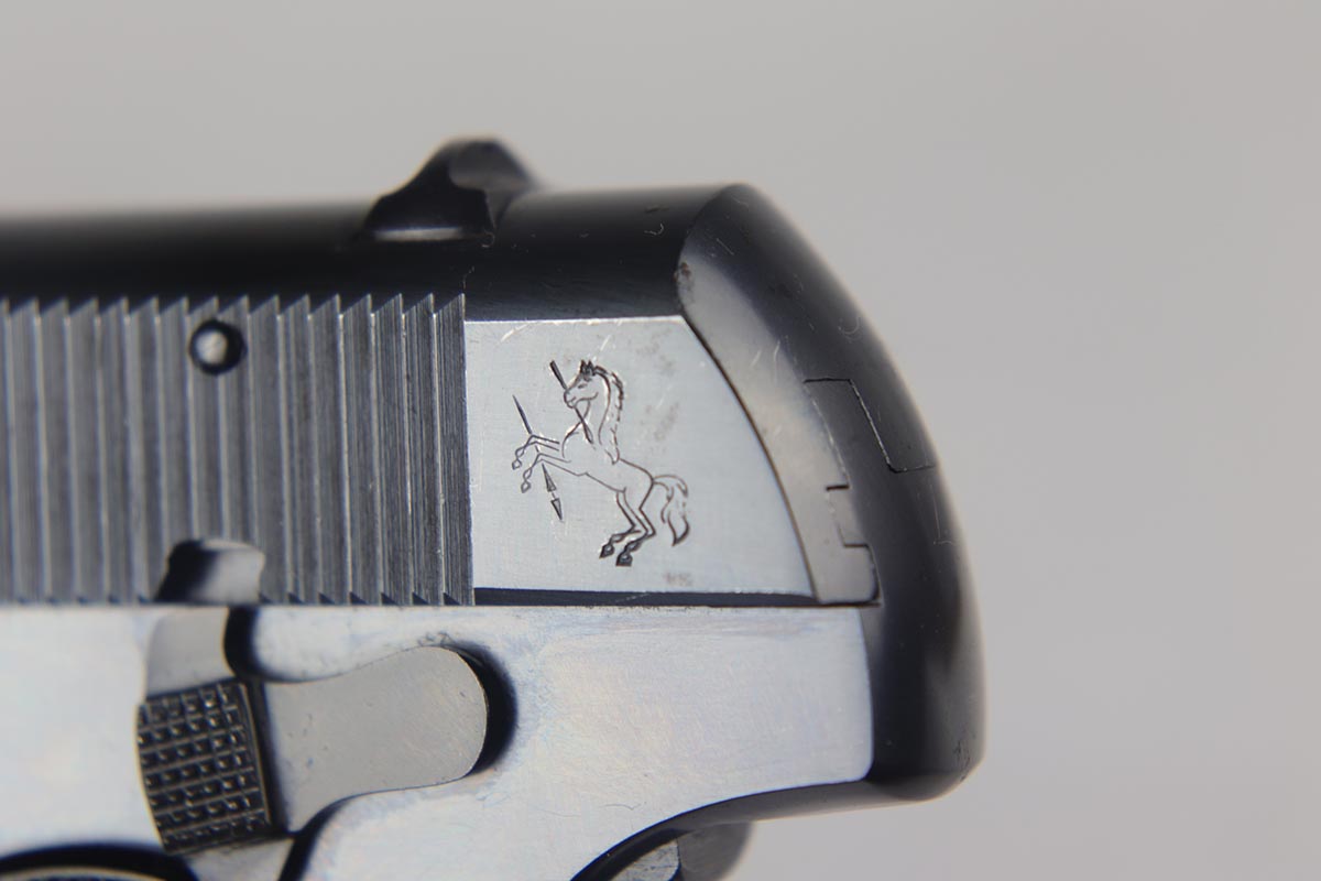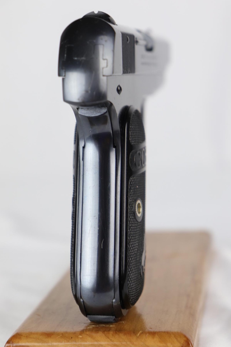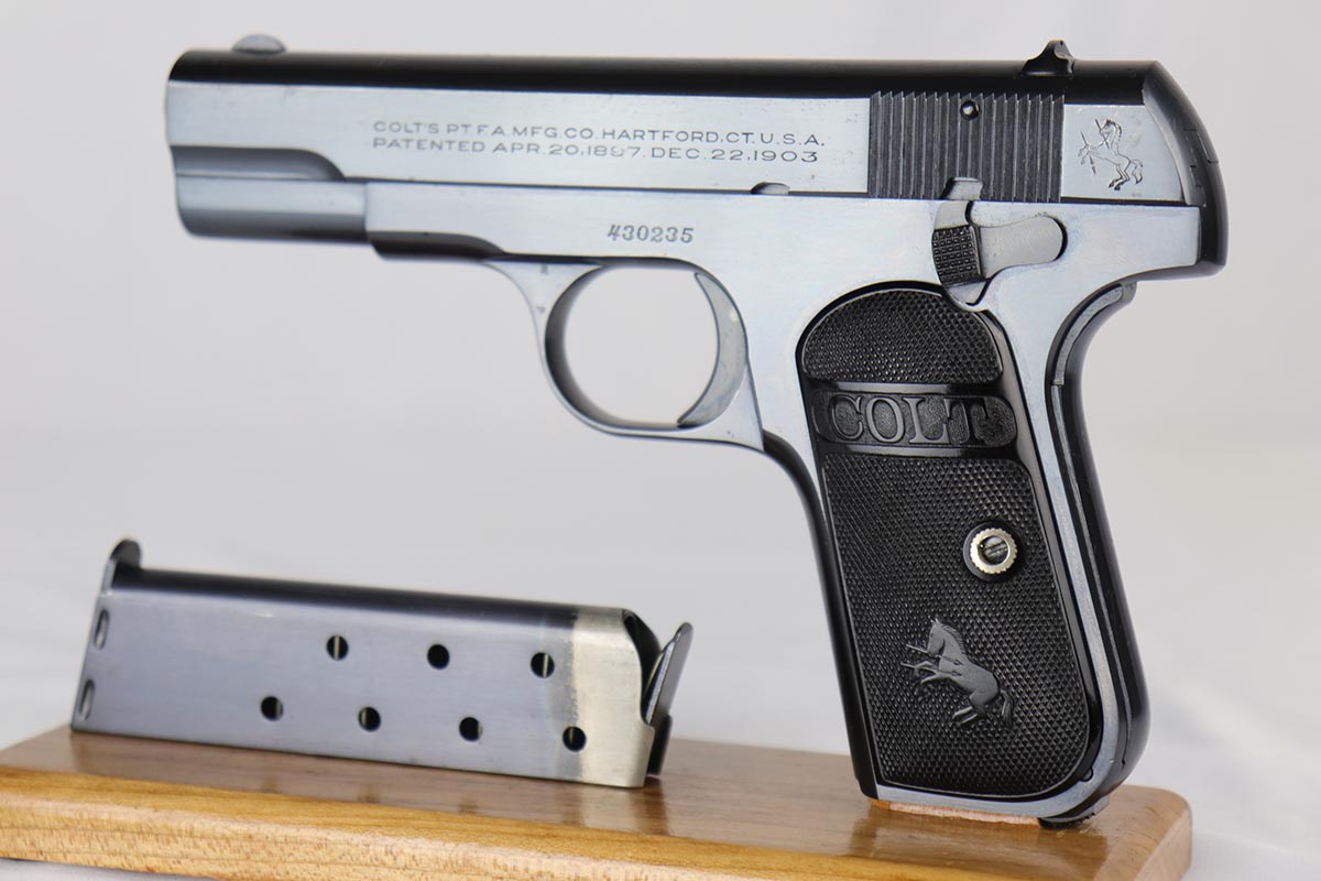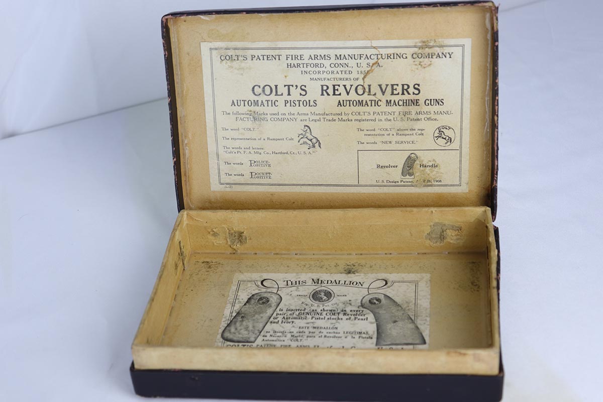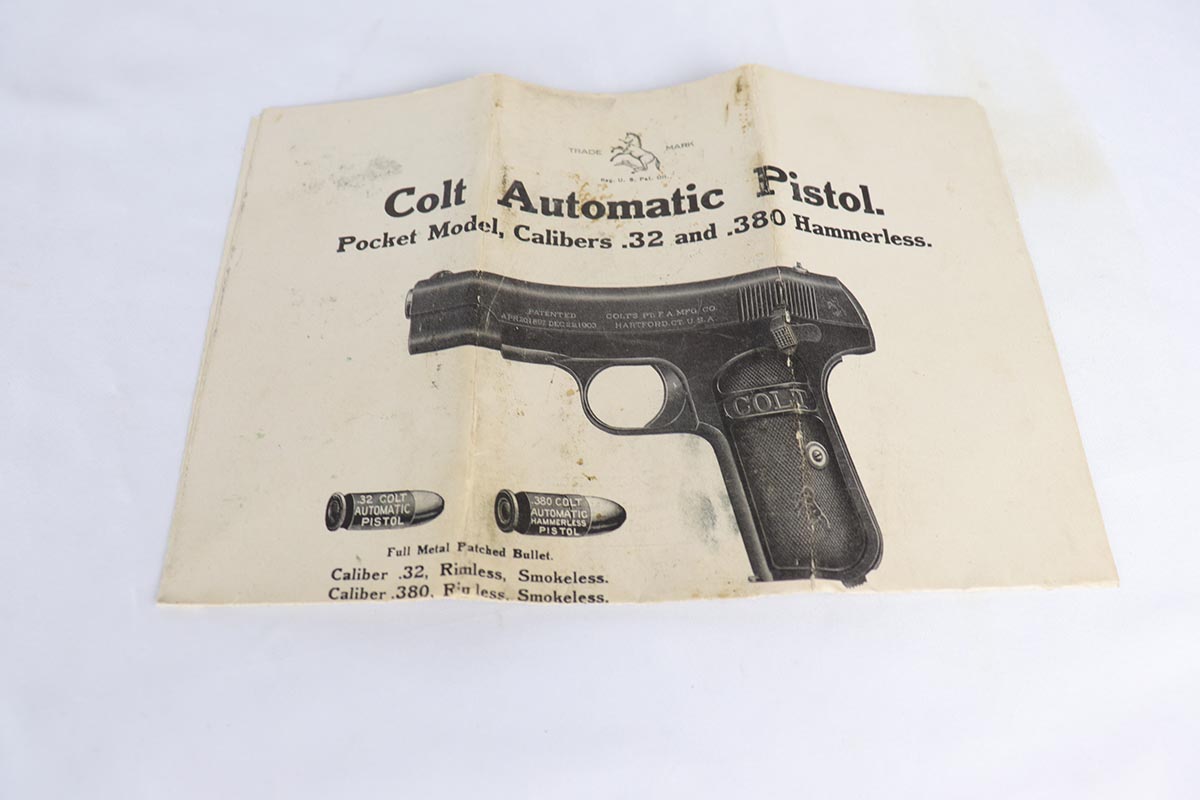 8/9/18 – This is a mint condition Colt M1903 in the original, matching hand-numbered box. Made in 1923, this pistol retains 99% original high-polish blue with only minor scuff marks on the back of the slide and light rub wear on high edges. Fantastic original grips, magazine and bore. The original box is in good condition but a previous owner did use glue to solidify the bond at the edges.