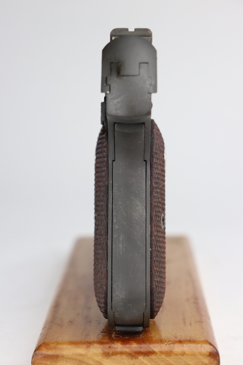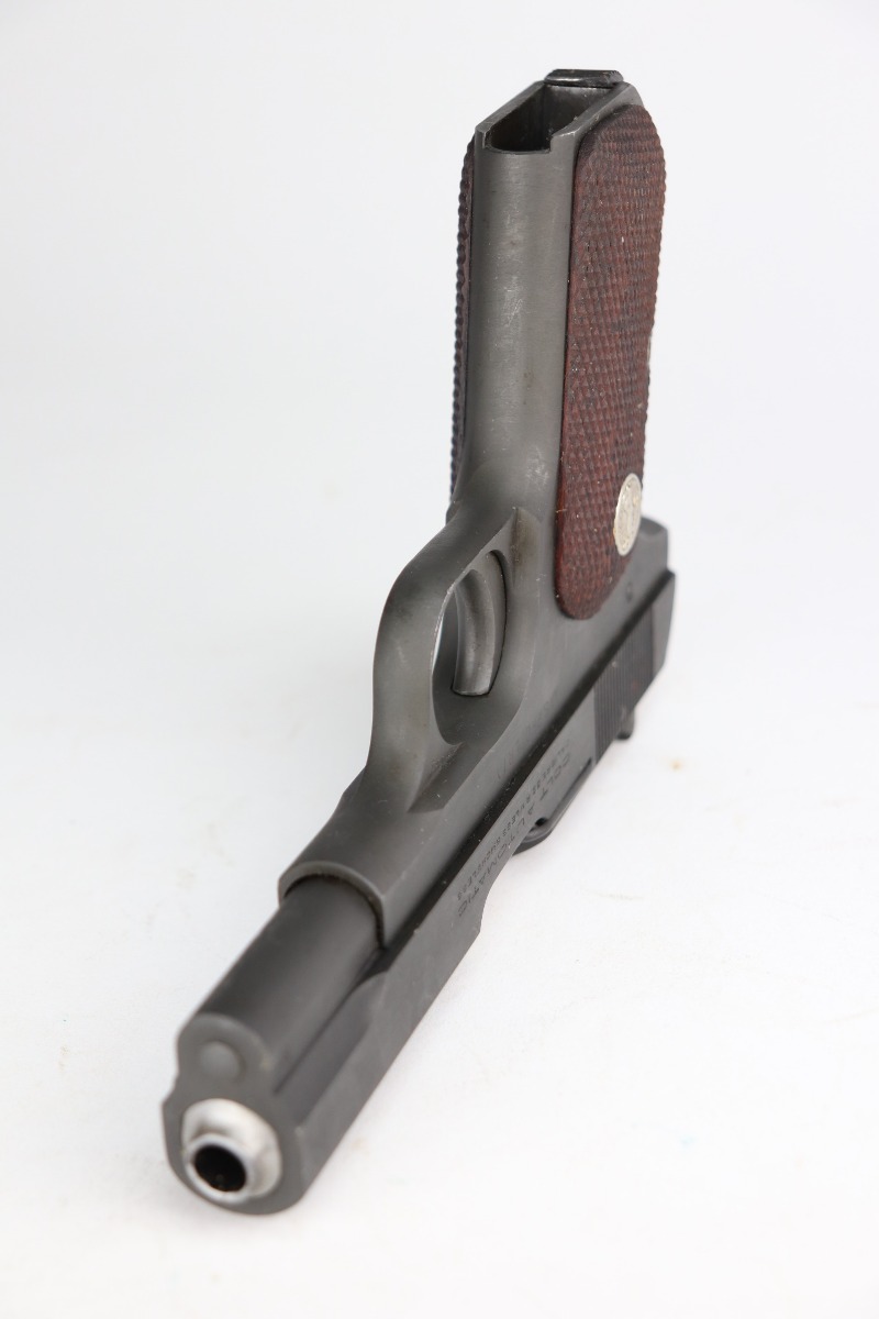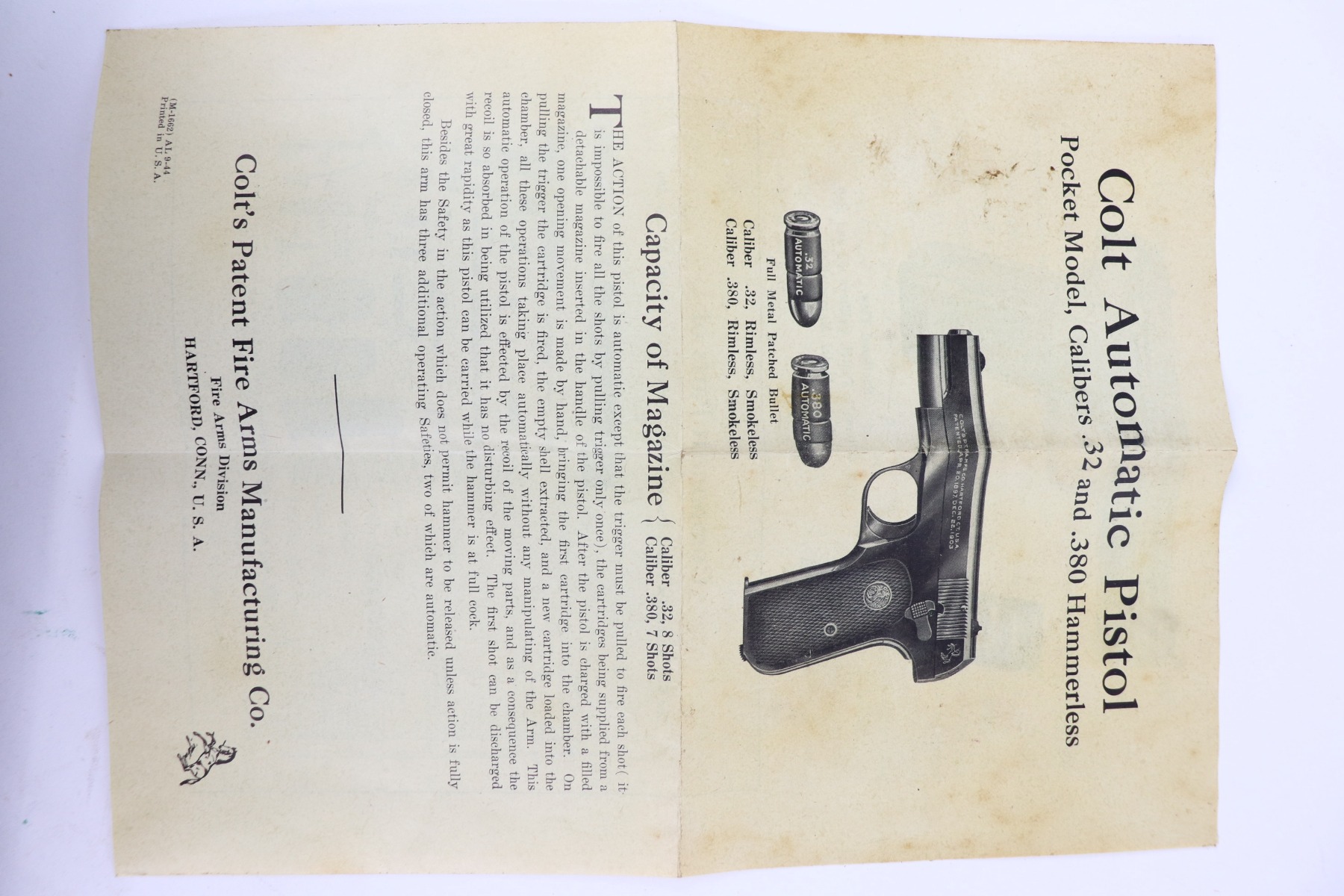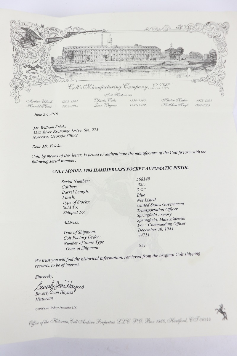 3/7/21 – This is a mint example of a Colt M1903 Pocket Hammerless issued to the US military in 1944. It comes with the original box (serialized to the gun), original packaging, cleaning rod, owners manual, and Colt factory letter. The gun is all correct and has a “US Property” marking on the right side of the frame. The gun is in mint condition. There is no noticeable finish loss, just some very light surface scuffs throughout. Comes with mint grips and two period-correct magazines. The bore is stone-mint.