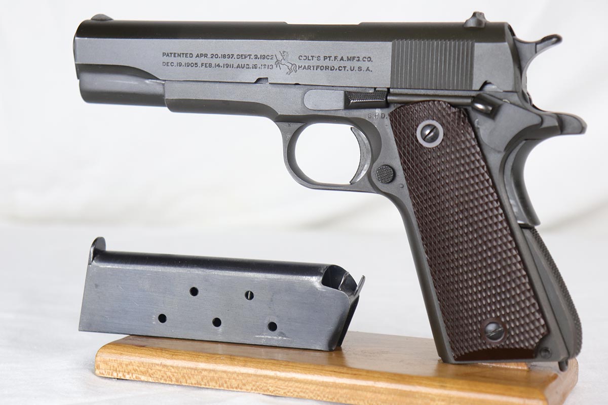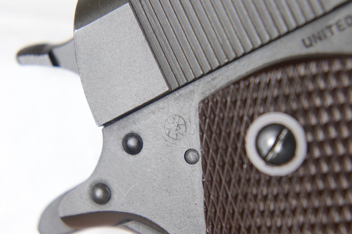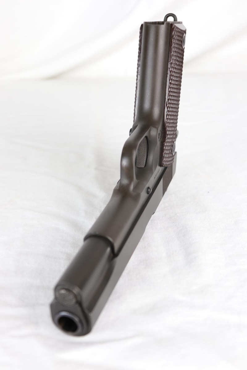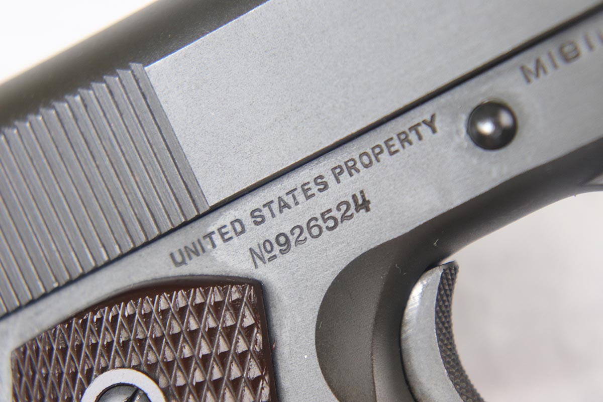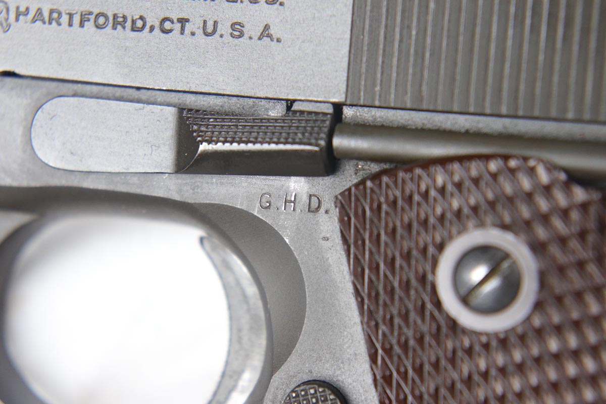 7/19/18 – This is a mint US Army issued Colt M1911A1, manufactured in 1943. It is all original and correct with 99+% original parkerized finish remaining. There is only a spot of wear where the frame meets the slide. Correct inspectors marks and ‘G’ marked Colt barrel. Slide is numbered to the frame. Minty grips and bore.