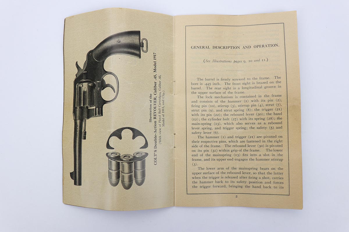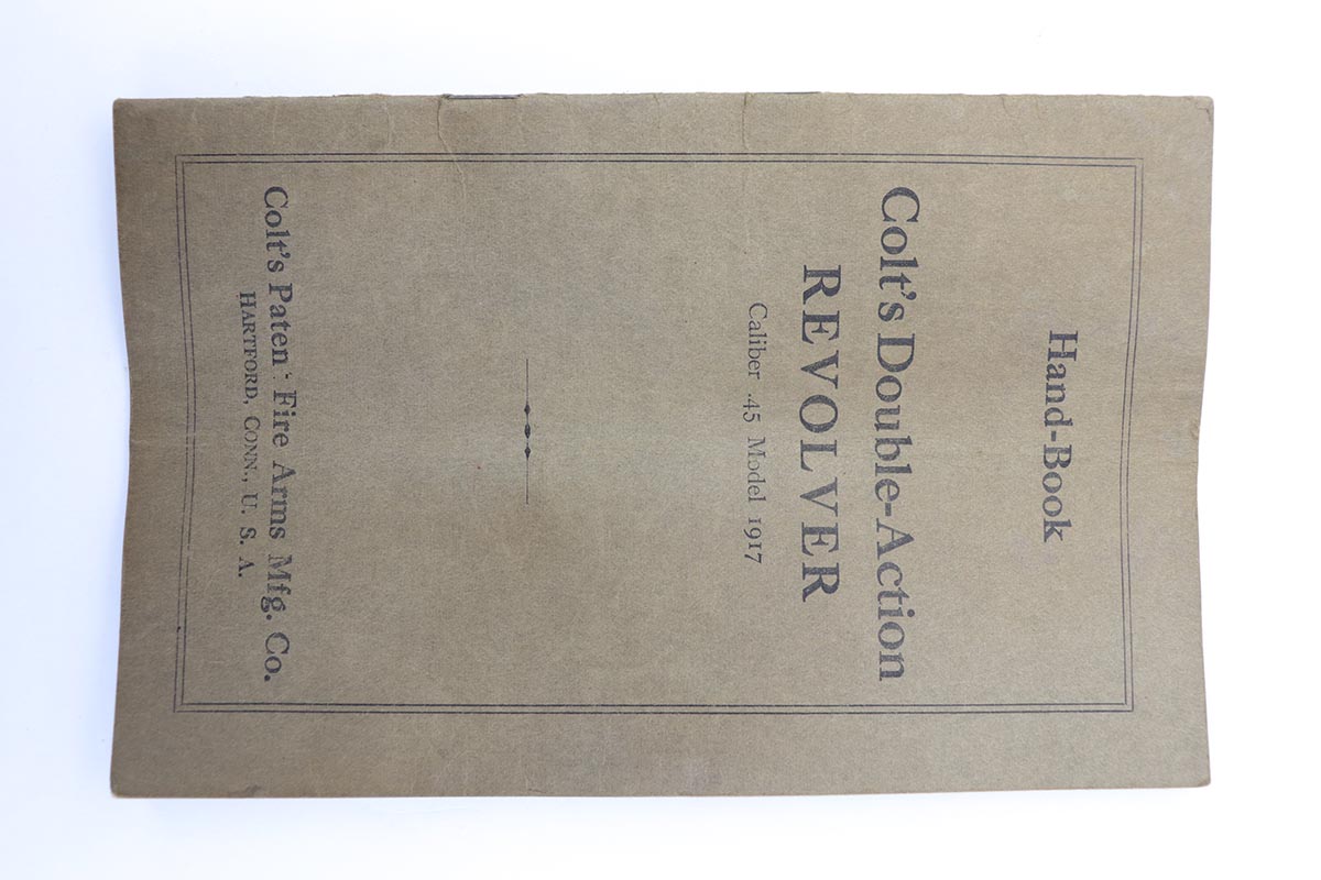 9/26/19 – This is the finest Colt M1917 revolver we have ever encountered, and it comes with an original lanyard and rare, original manual. The gun itself retains 99+% of that beautiful Colt bluing, with just a hint of wear on the edges of the grip frame and muzzle. Mint bore and grips, which are correctly hand-numbered and matching to the gun. The gun is all original and correct, and you will likely not see a better example for years at a time. Similarly, the original lanyard is in excellent condition, with no fraying or defects. The grouping is completed by an original manual, which shows some age and creases from folding, but is in fantastic shape considering the age and inherent fragility of it.