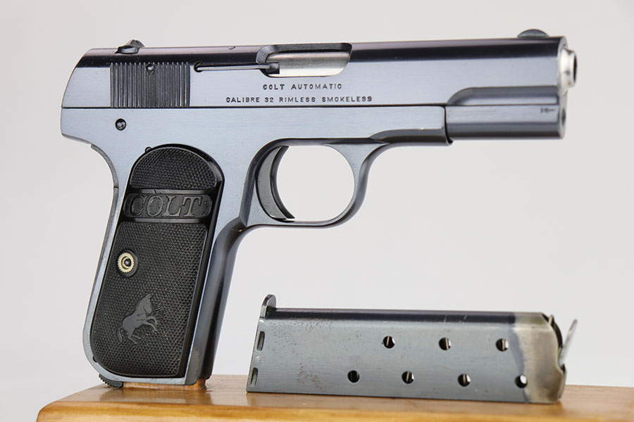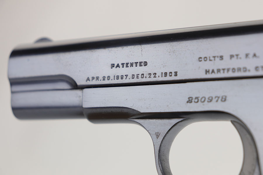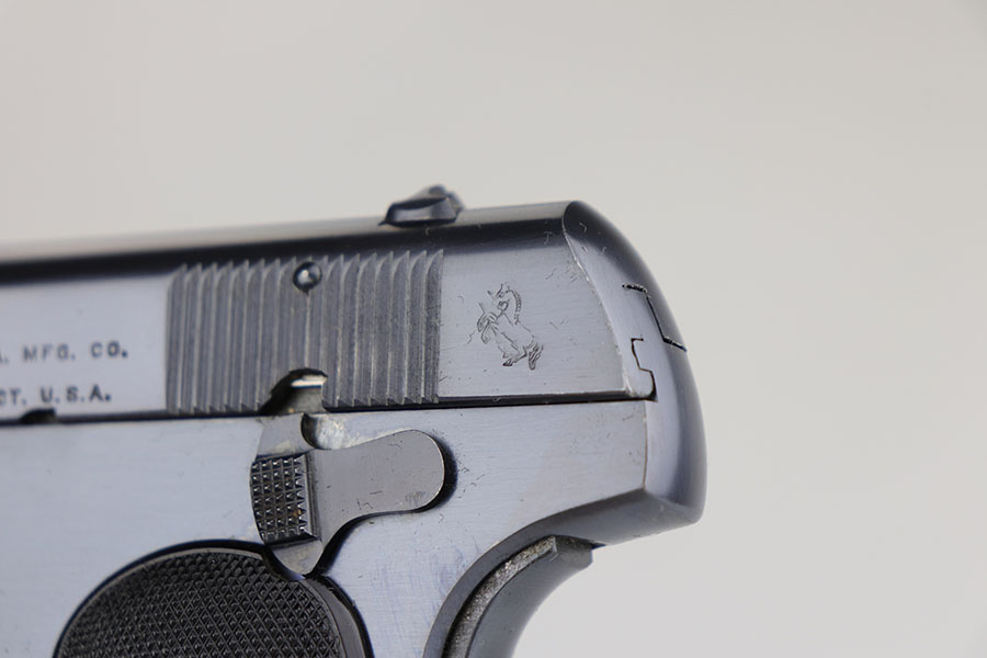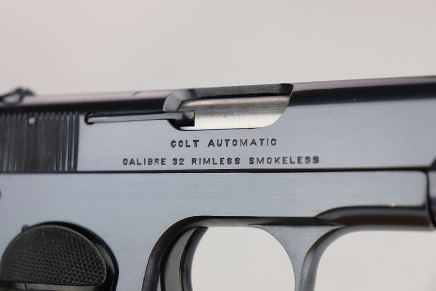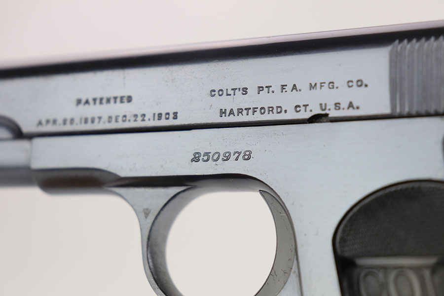 3/23/20 – This is a mint Colt Model 1903 that was manufactured in 1917. It has 99+% of the original, high-polish blue with just a little bit of patina on the edges of the slide. Mint bore and excellent grips. Correct magazine.