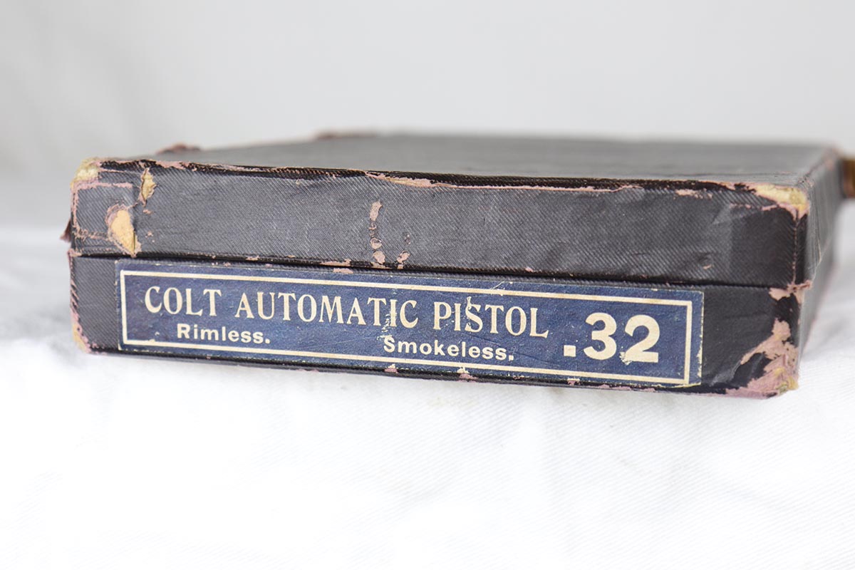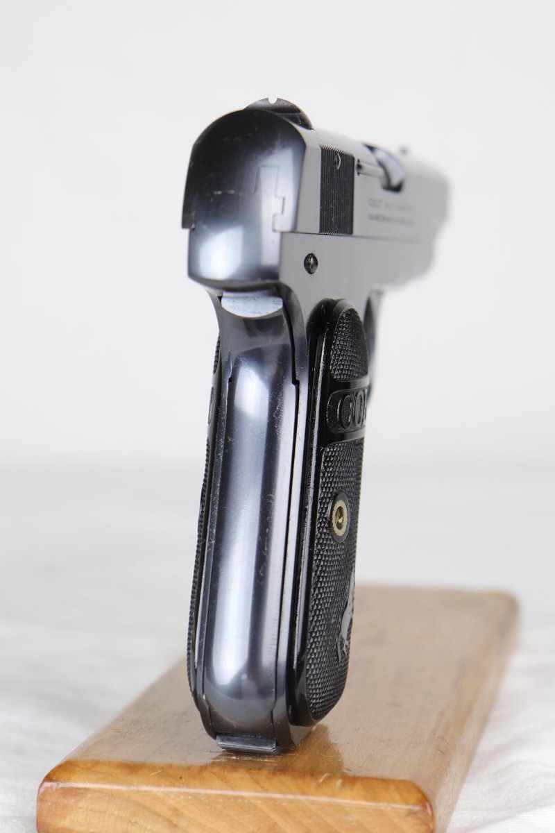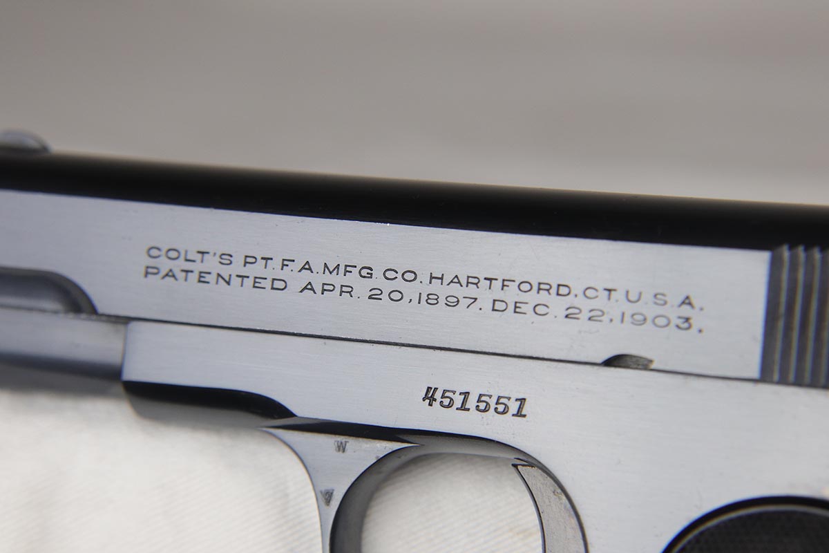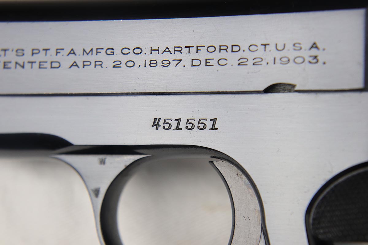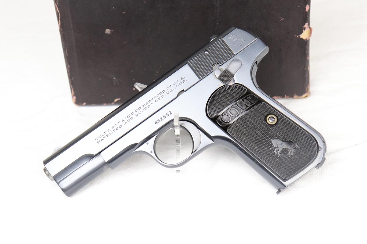 3/28/18 – This is a mint Colt model 1903 in the original matching box. Manufactured in 1924, this pistol has virtually no wear to mention. The original Colt box is hand numbered on the bottom to match the pistol, which is correct for this model. The box includes a factory letter that states the manufacture date, as well as some original Colt paperwork. The pistol has a minty magazine and grips. Bore has strong rifling with very minor frost.