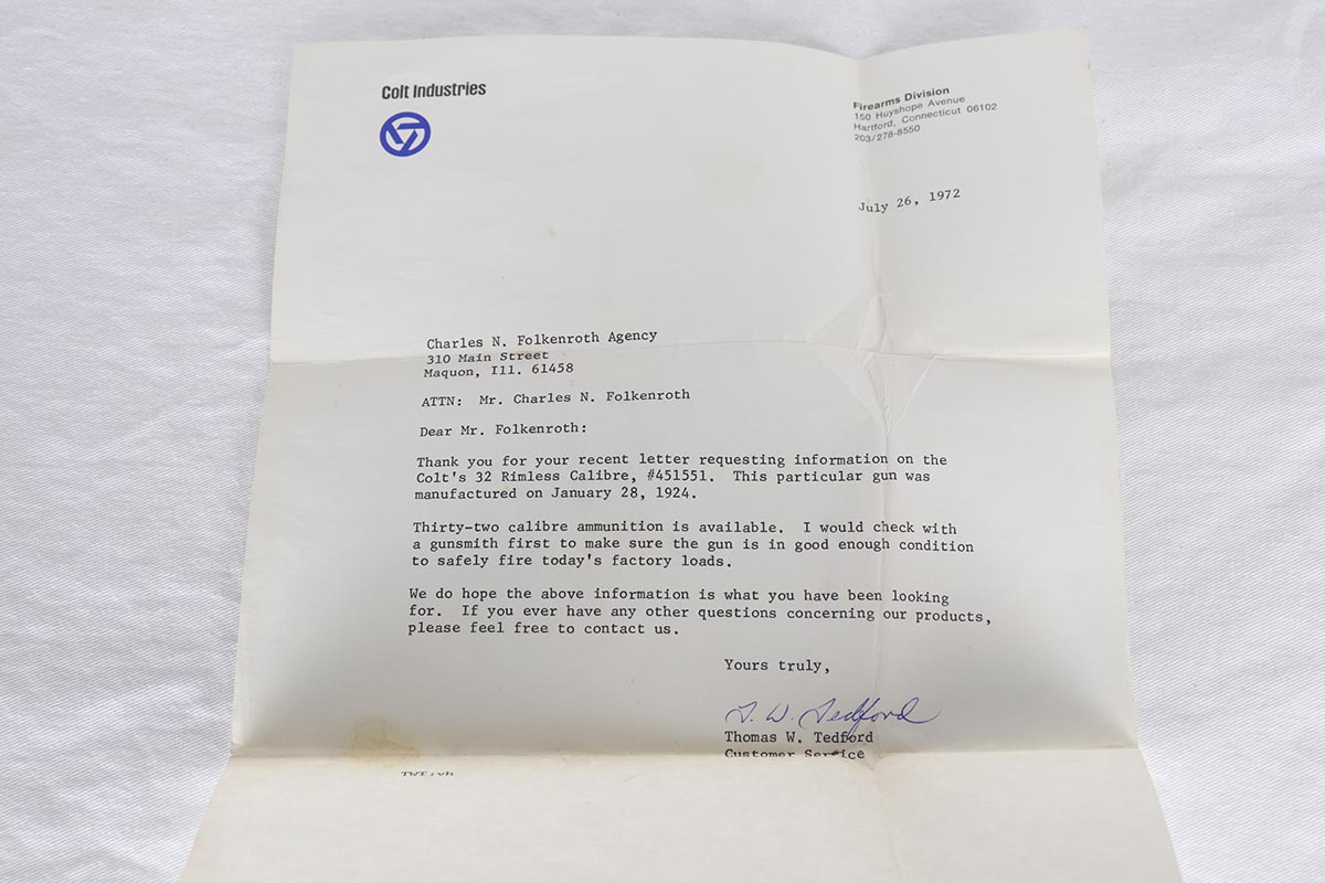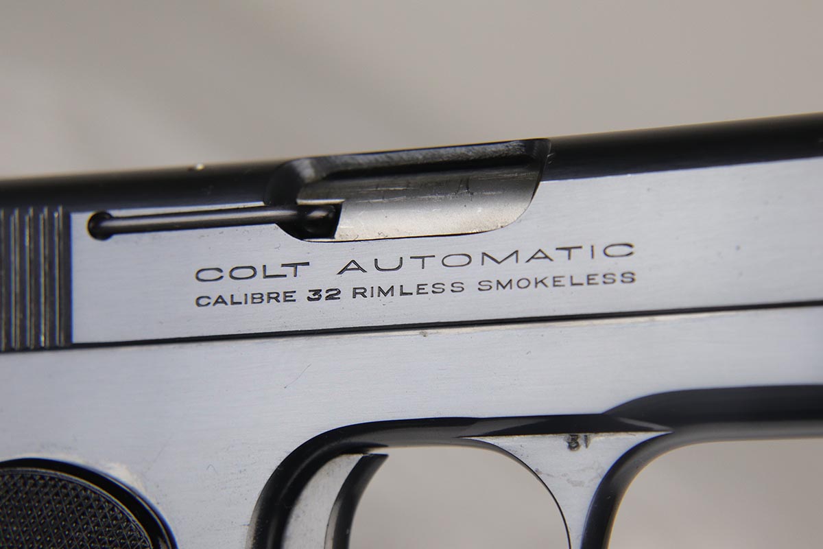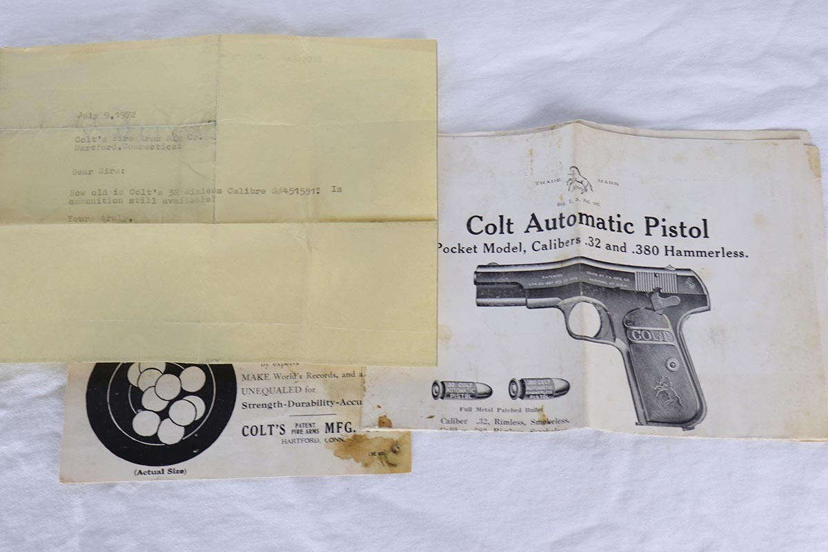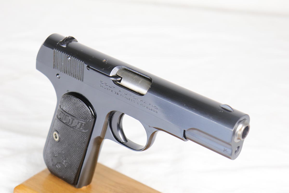 3/28/18 – This is a mint Colt model 1903 in the original matching box. Manufactured in 1924, this pistol has virtually no wear to mention. The original Colt box is hand numbered on the bottom to match the pistol, which is correct for this model. The box includes a factory letter that states the manufacture date, as well as some original Colt paperwork. The pistol has a minty magazine and grips. Bore has strong rifling with very minor frost.
