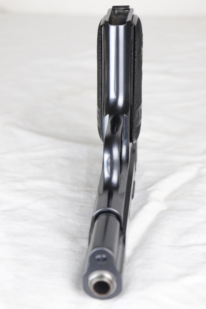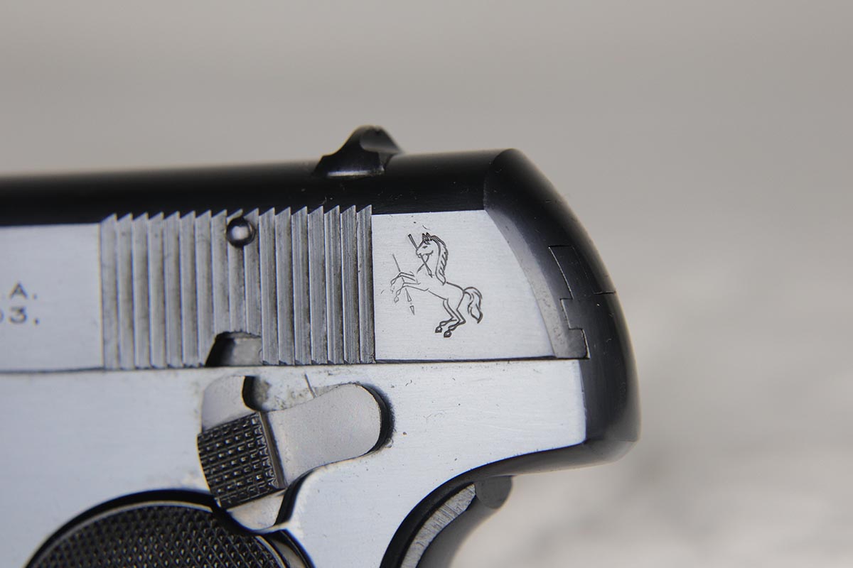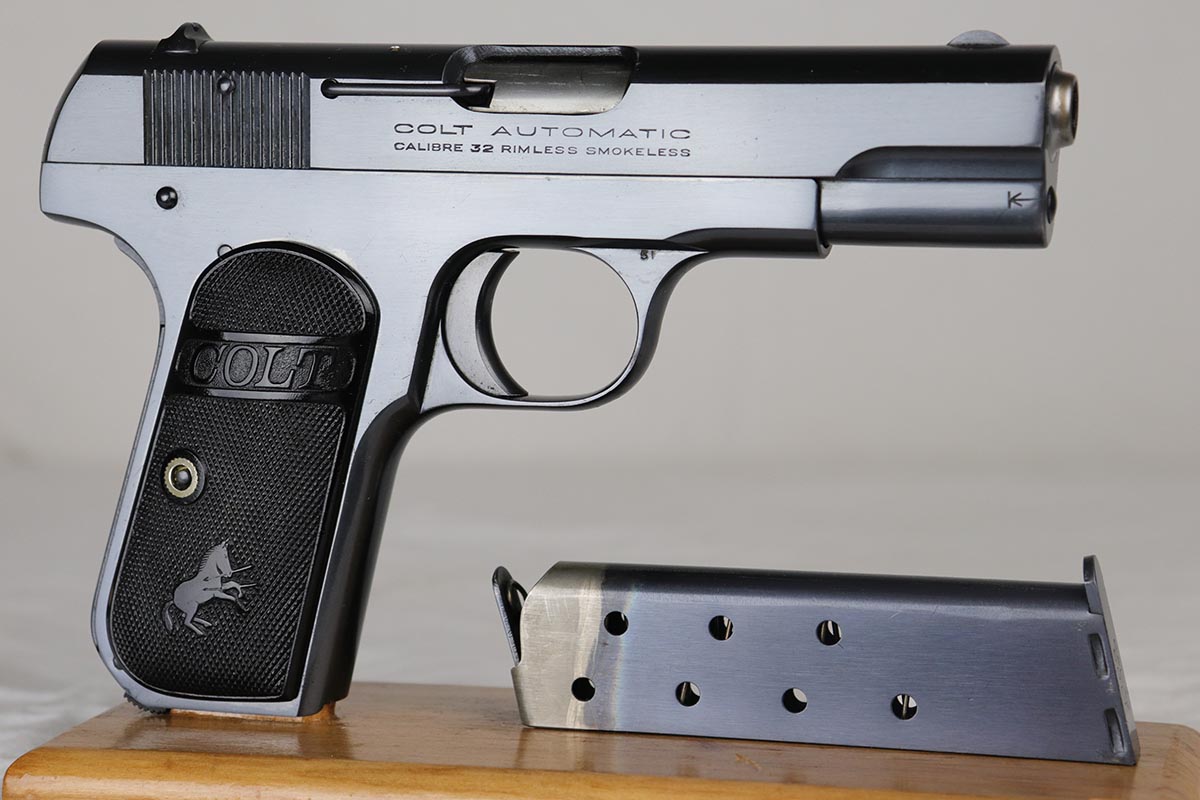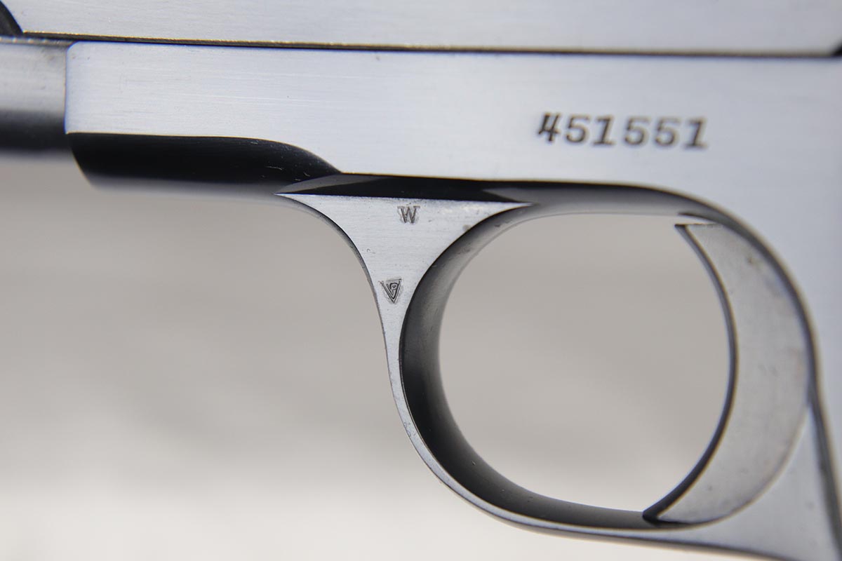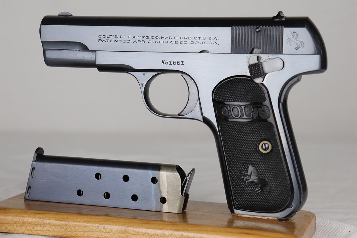 3/28/18 – This is a mint Colt model 1903 in the original matching box. Manufactured in 1924, this pistol has virtually no wear to mention. The original Colt box is hand numbered on the bottom to match the pistol, which is correct for this model. The box includes a factory letter that states the manufacture date, as well as some original Colt paperwork. The pistol has a minty magazine and grips. Bore has strong rifling with very minor frost.