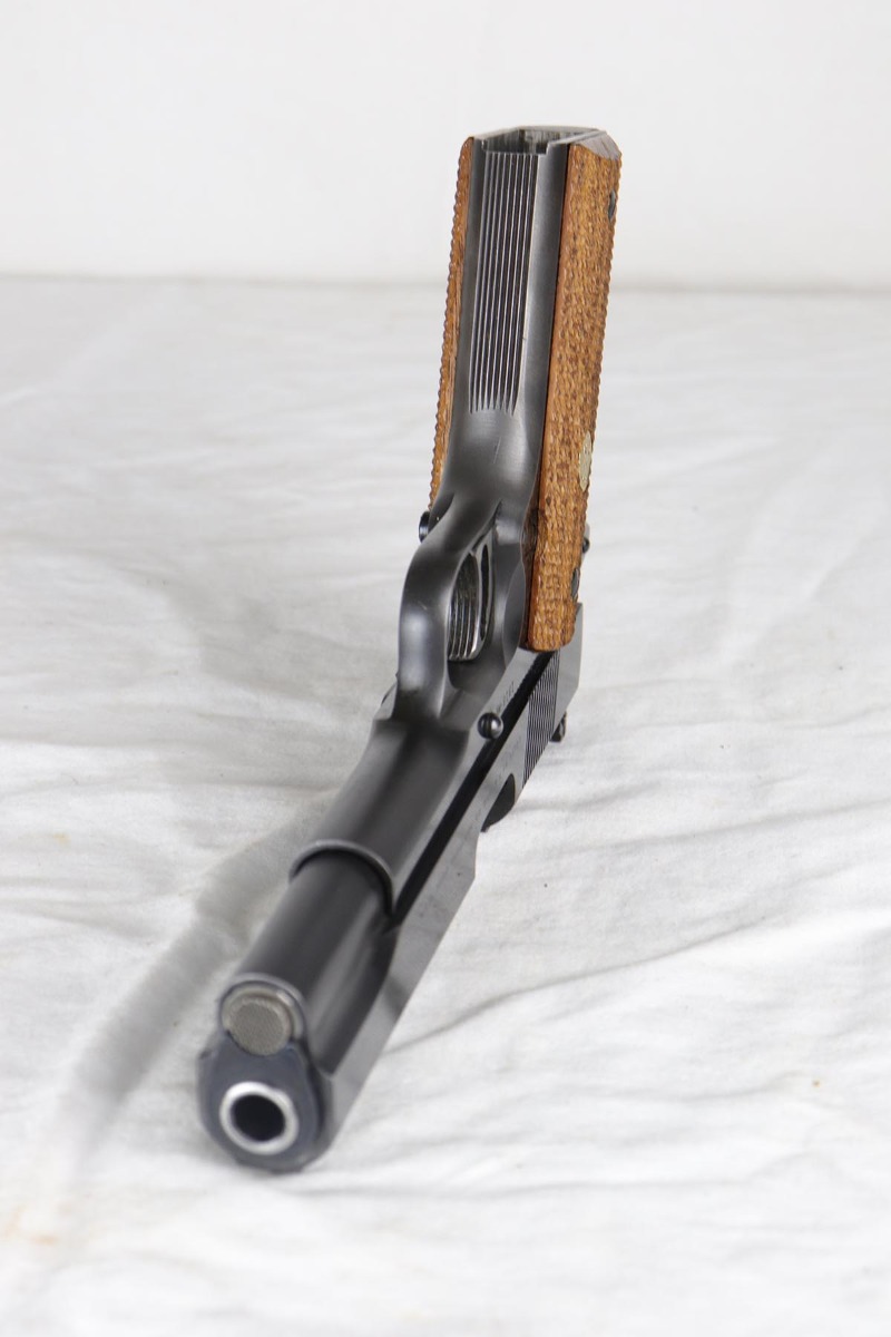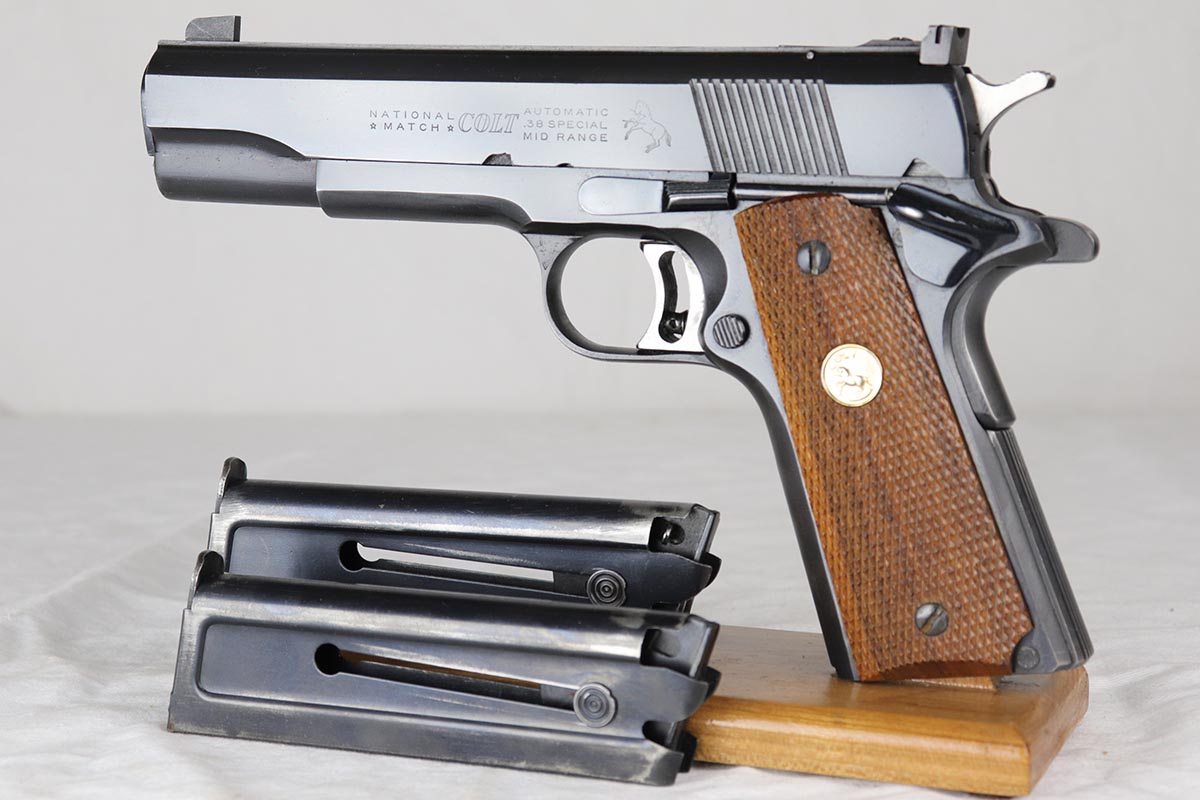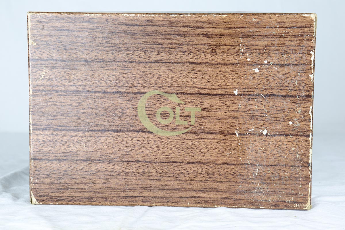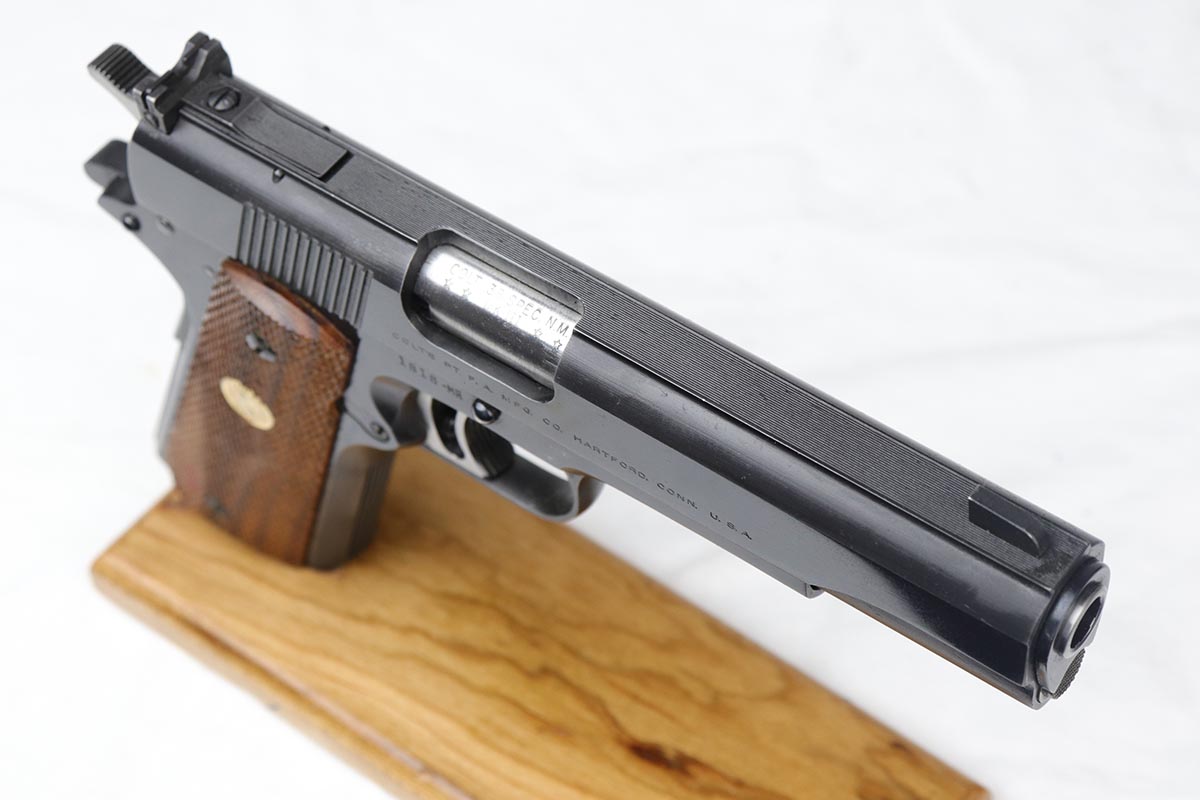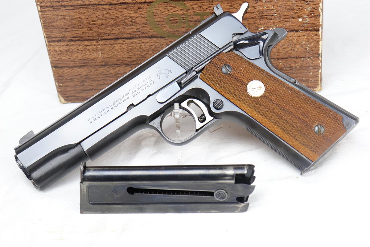 3/29/18 – This is a fantastic boxed example of an early 1960’s production Colt National Match “Mid-range” pistol, built in limited numbers on full size 1911 frame, and chambered in .38 special Wadcutter for competition shooting. Essentially, a high end factory accurized target pistol, a .38 wadcutter gold cup pistol was as close as one could get to the the dedicated target gun without having to spend thousands on post factory modifications. This particular gun is near new and retains around 99% of its original bluing, and comes with paperwork, extra mag and an original box serialized to the gun. Excellent bore and grips. It seems that it spent most of its life in the dark corner of the safe, being taken out only to admire its beautiful finish and to dry fire a couple of times a decade.