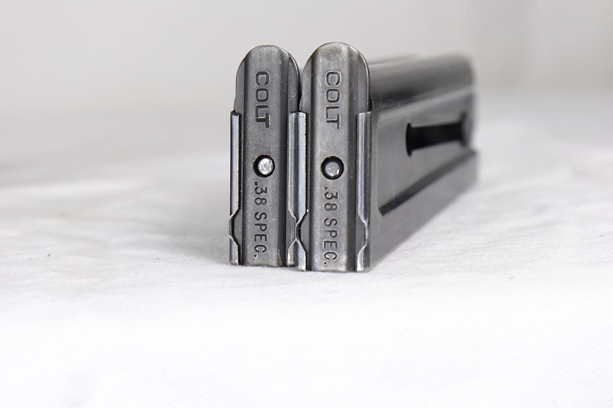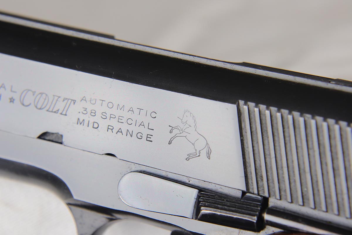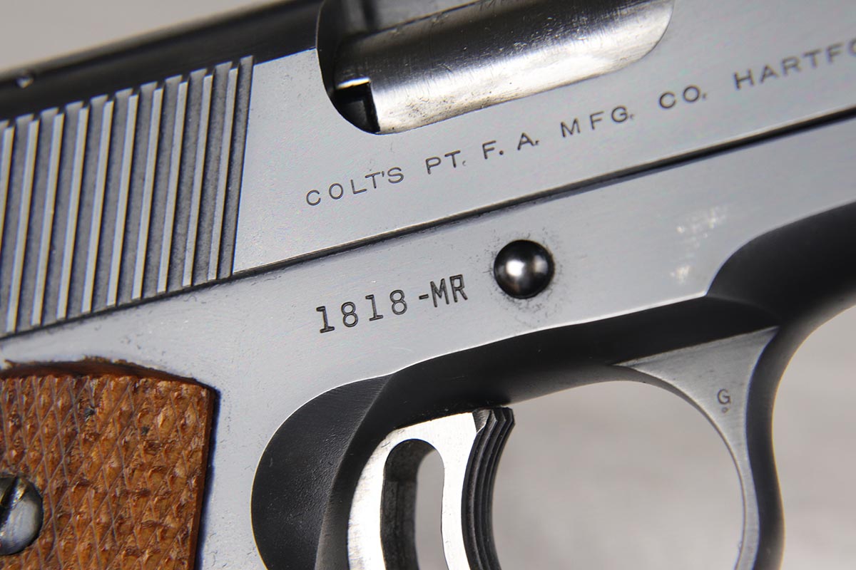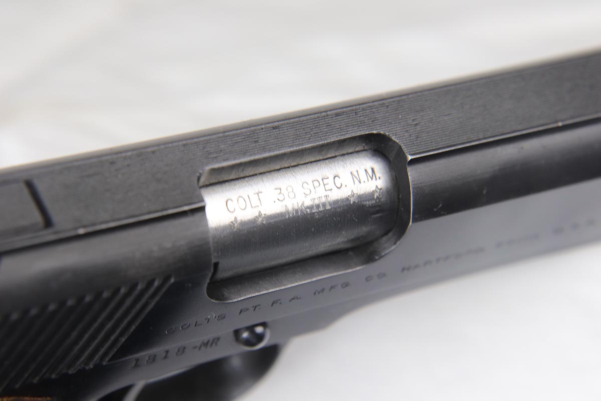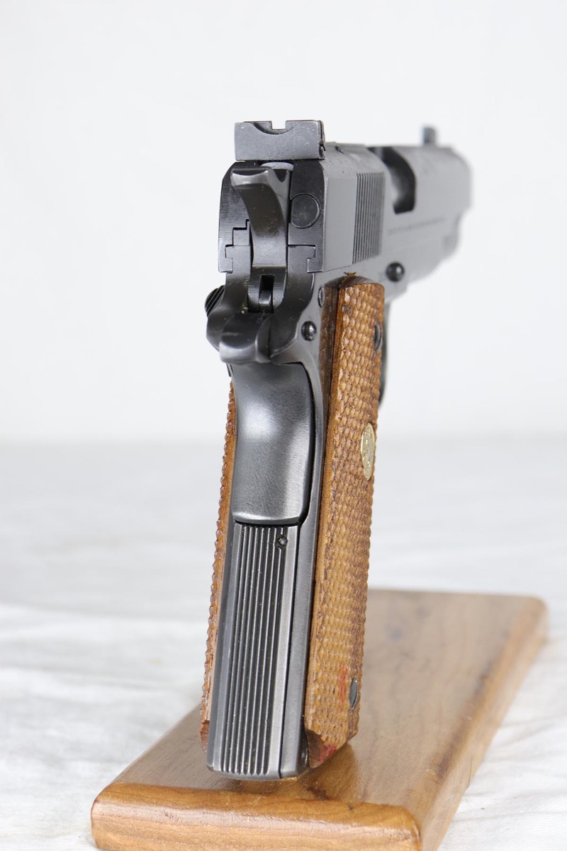 3/29/18 – This is a fantastic boxed example of an early 1960’s production Colt National Match “Mid-range” pistol, built in limited numbers on full size 1911 frame, and chambered in .38 special Wadcutter for competition shooting. Essentially, a high end factory accurized target pistol, a .38 wadcutter gold cup pistol was as close as one could get to the the dedicated target gun without having to spend thousands on post factory modifications. This particular gun is near new and retains around 99% of its original bluing, and comes with paperwork, extra mag and an original box serialized to the gun. Excellent bore and grips. It seems that it spent most of its life in the dark corner of the safe, being taken out only to admire its beautiful finish and to dry fire a couple of times a decade.
