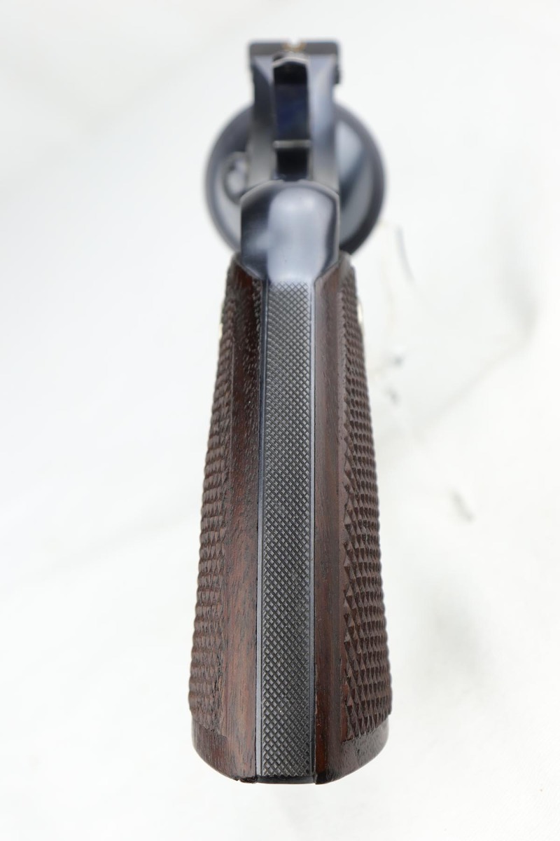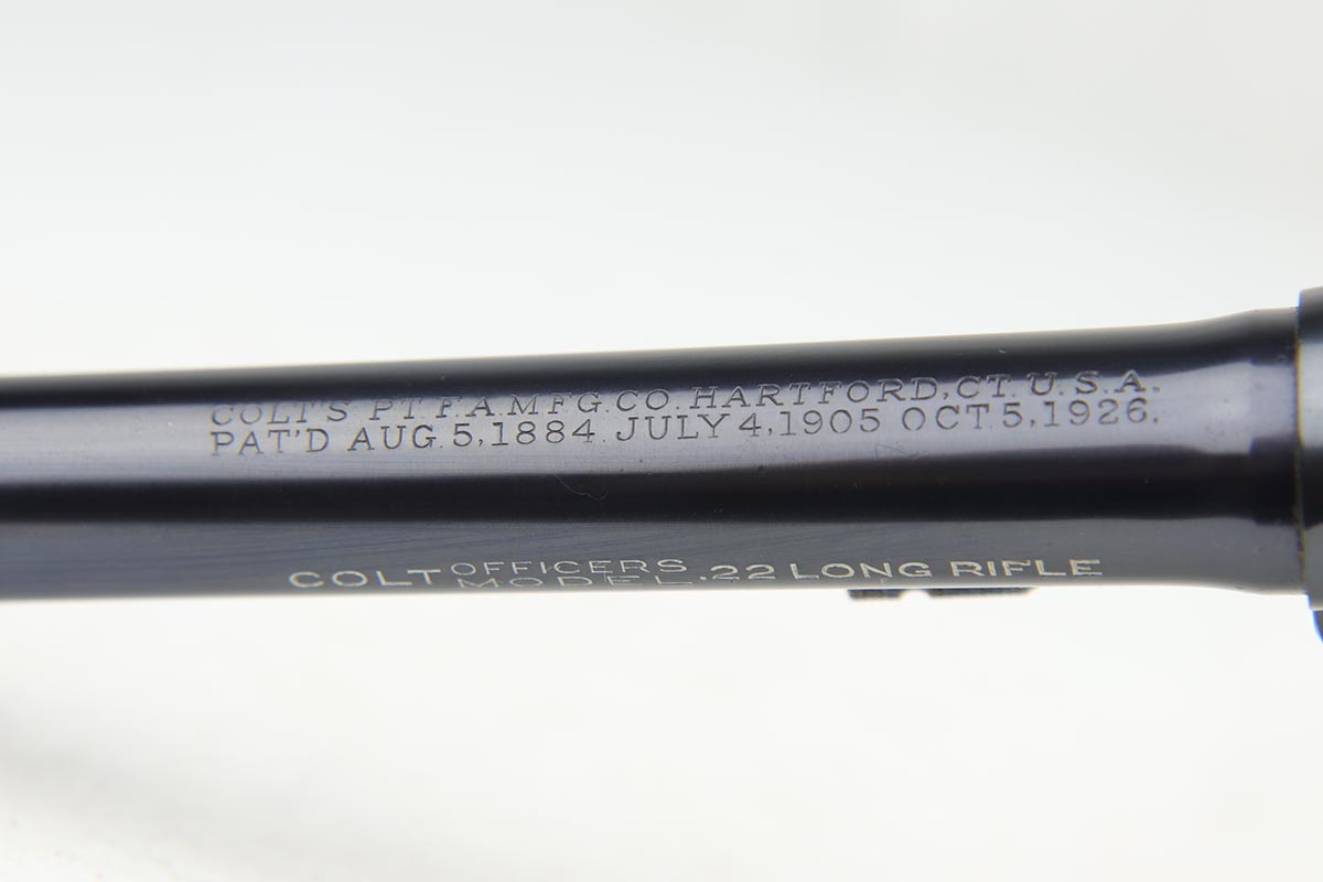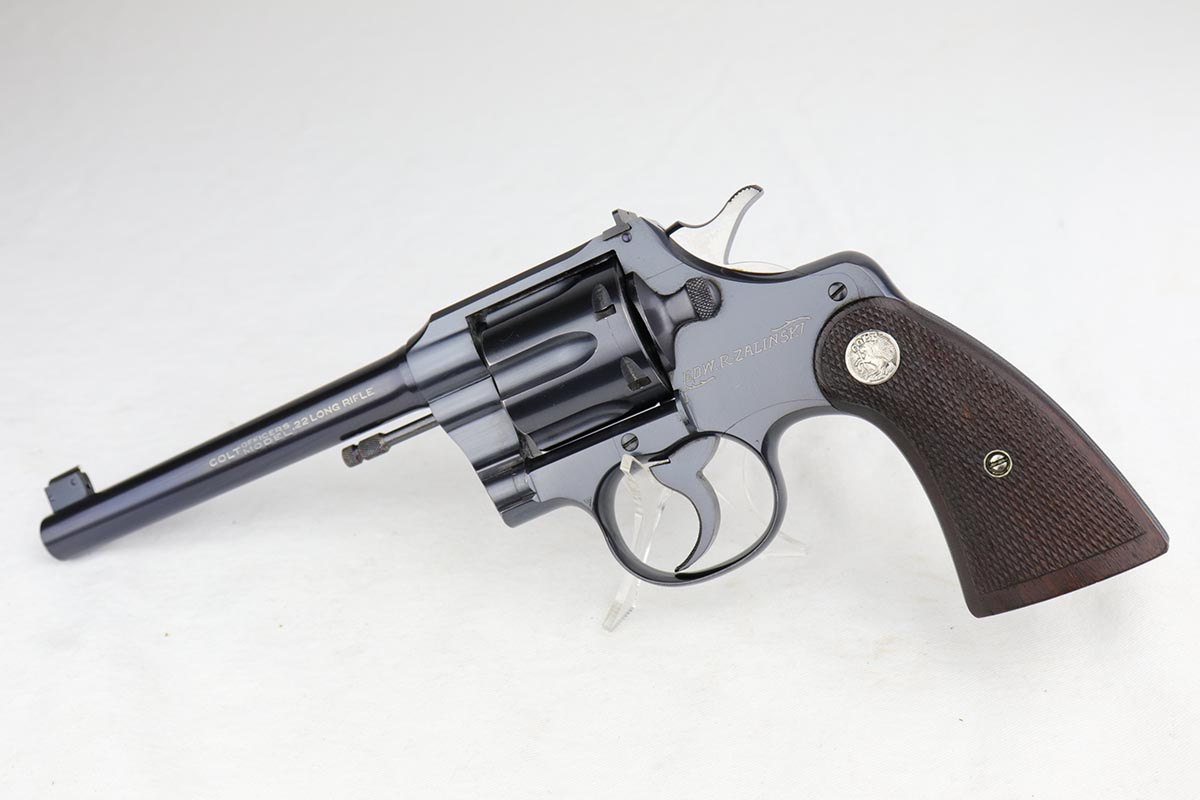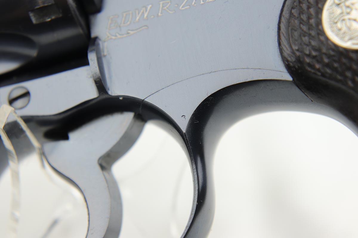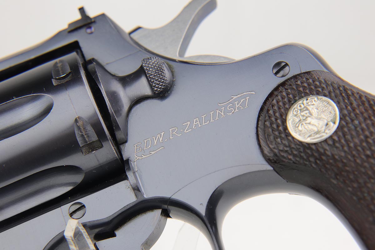 1/8/19 – This is a Colt Officer’s Model Target revolver in .22 LR in mint, original condition. Production of the Target Model began in 1930, and this gun is the 999th ever made. The gun shows only minor handling wear and has a mint bore. Fantastic grips, too. It has the name ‘EDW. R. ZALINSKI’ inscribed on the frame. There are a couple noted Zalinski’s from the time period, but we have no documentation or proof as to which one this belonged to.