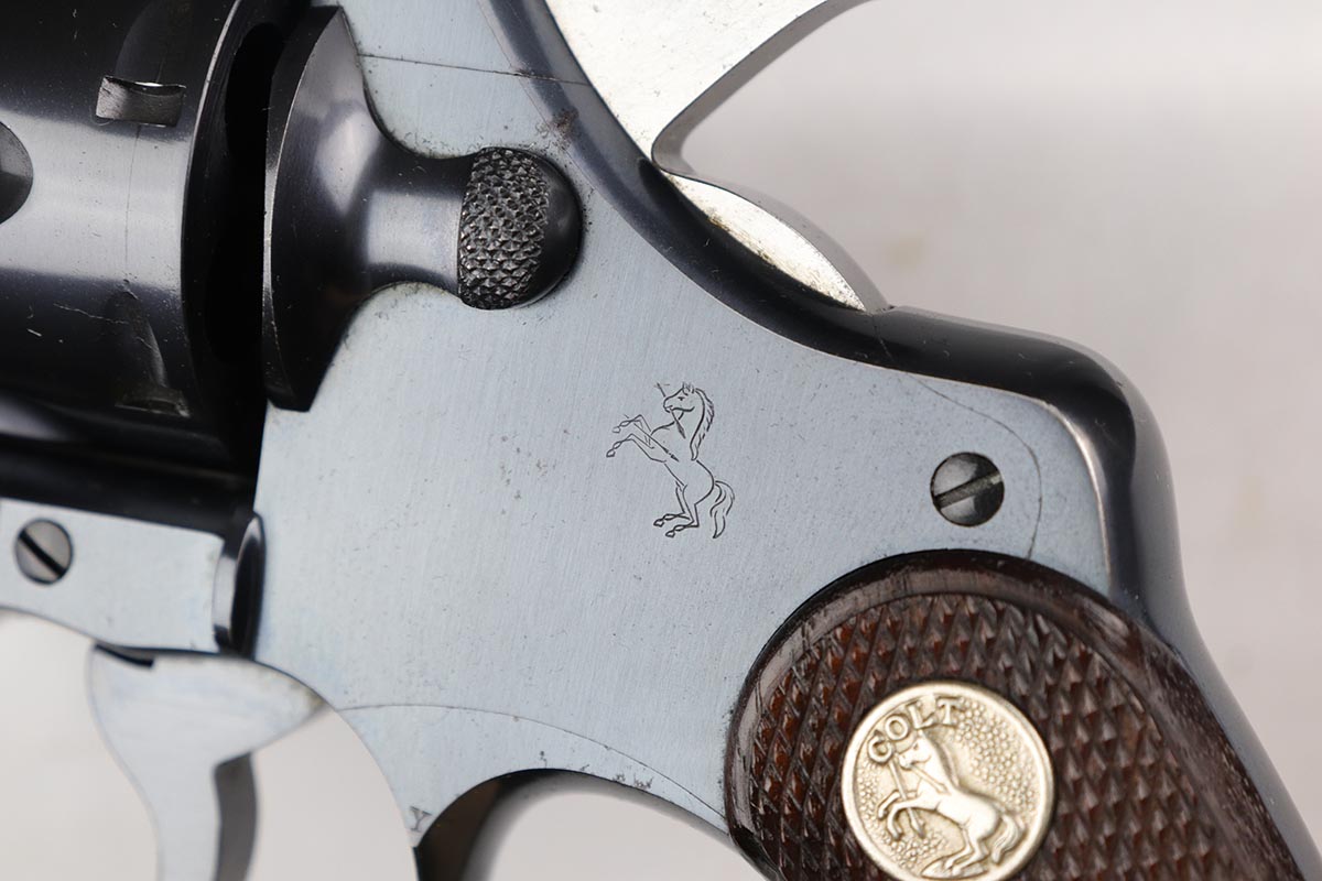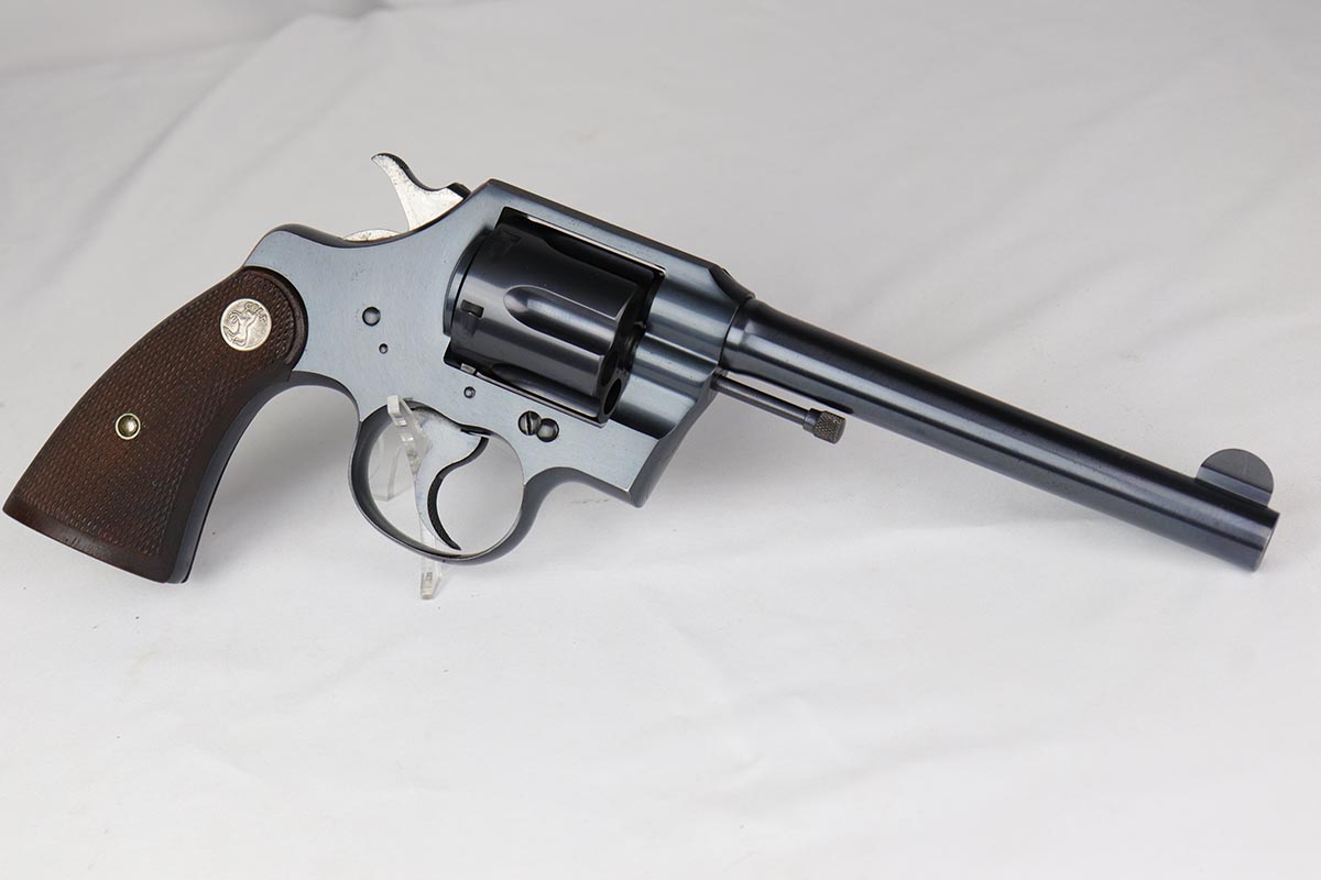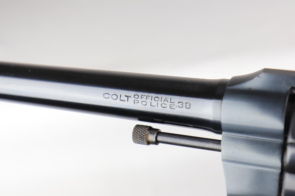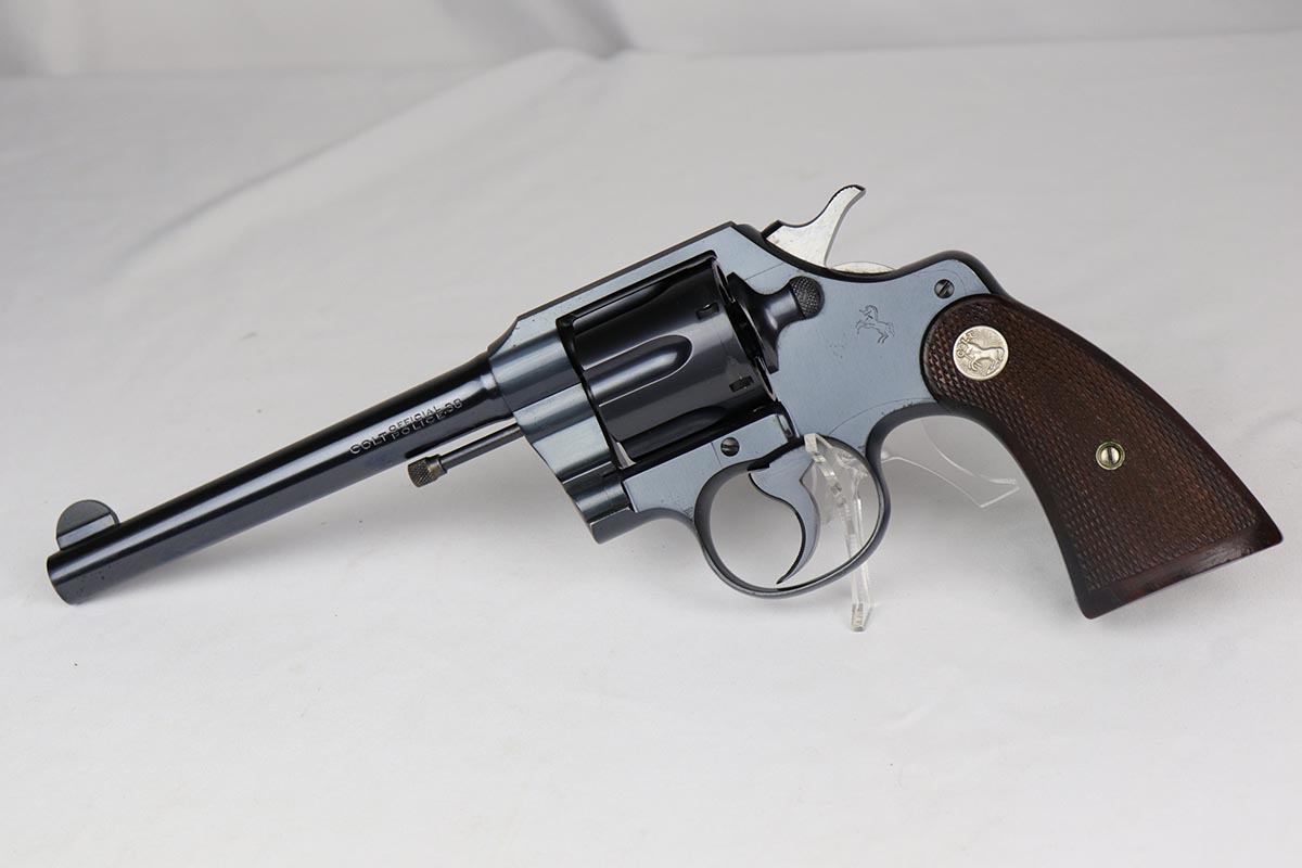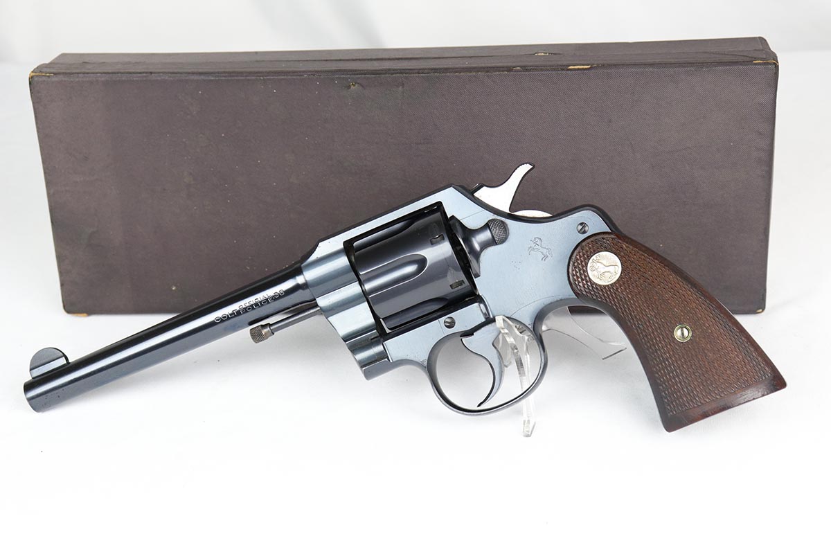 3/20/18 – This is a near-mint Colt Official Police in .38 caliber. The original finish rates at 99%, and comes in an excellent original box. The box is correctly hand numbered but to a different revolver. I don’t think this combination could be upgraded. The gun was made in Dec. of 1940 or January of 1941, just before the US involvement in WW2, so the quality of production is high. Bore is excellent. A 9+ out of 10. Excellent condition wood grips.