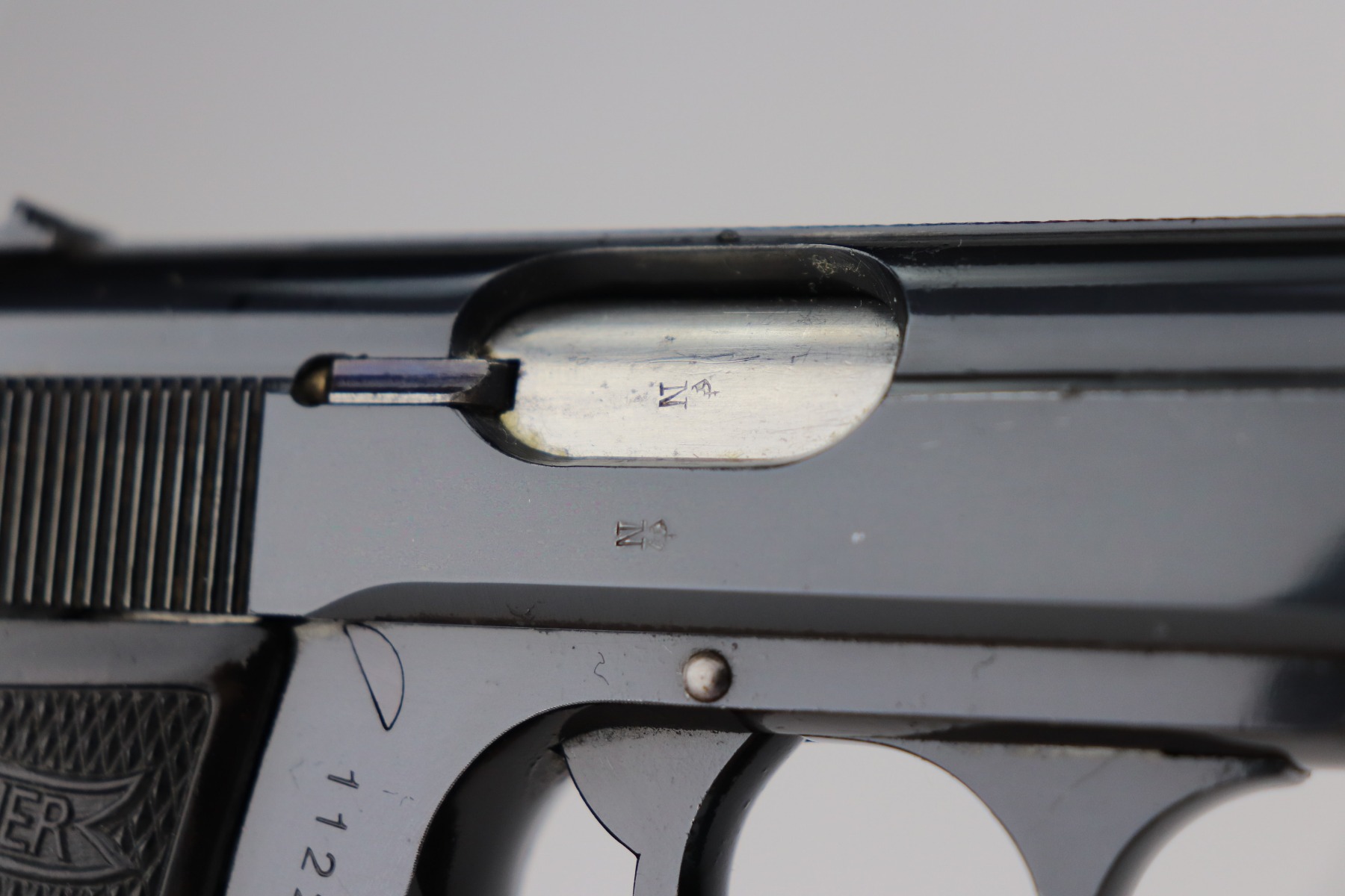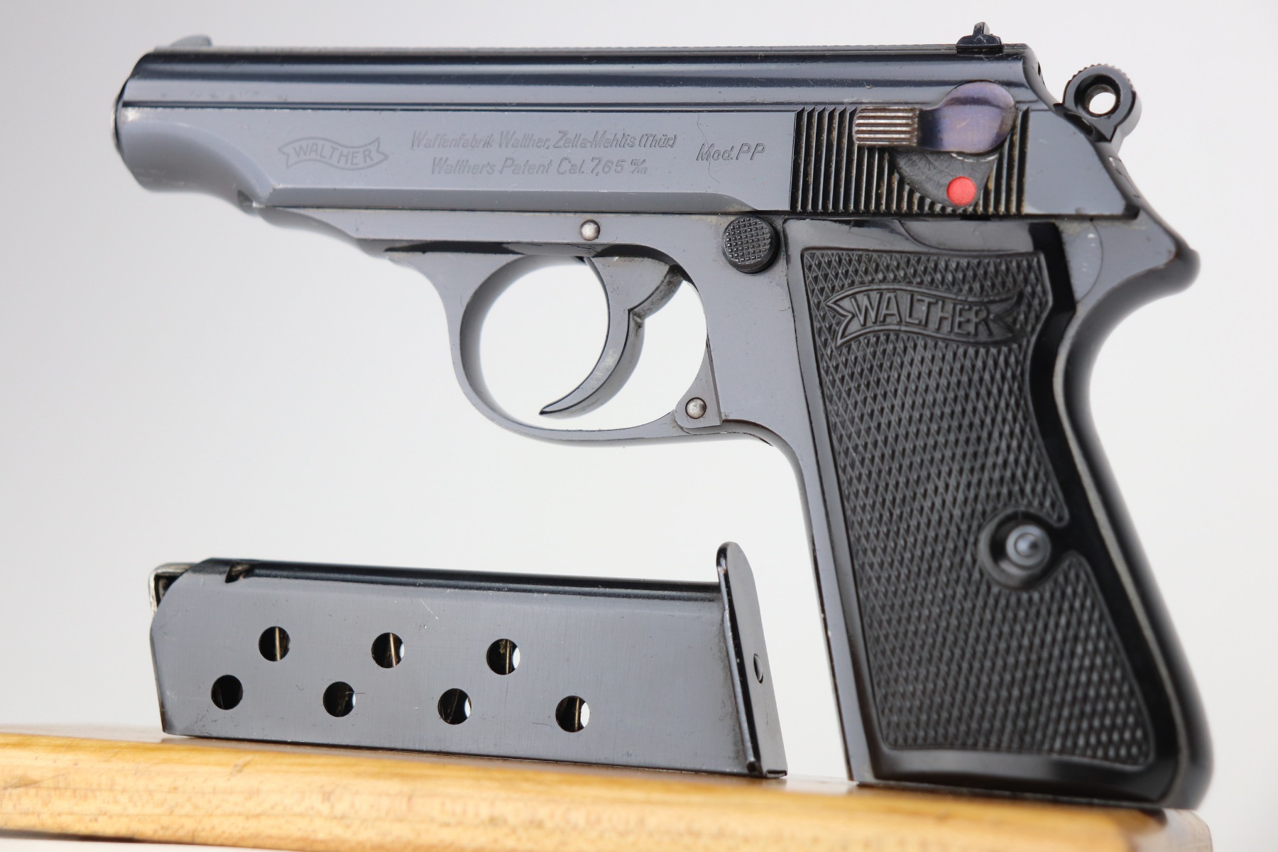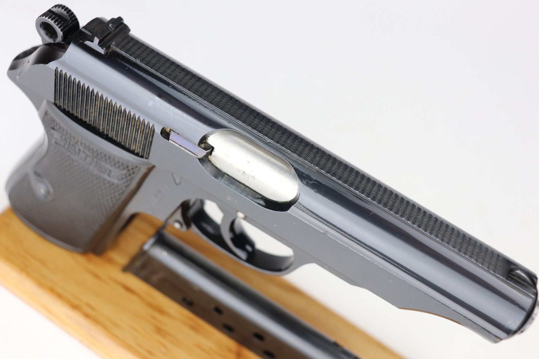 3/1/21 – This is a mint example of a Walther PP sold in the commercial market in 1938. It is all matching and has the proper “Crown N” proofs. It is in mint condition, retaining about 99% of its original finish. There is just a hint of wear around the muzzle and a very light scratch on the front strap. It has excellent grips. Excellent bore – shiny with strong rifling and minor freckling in the grooves. It comes with a post-war magazine, but we can swap it for a period-correct magazine for an extra $100.