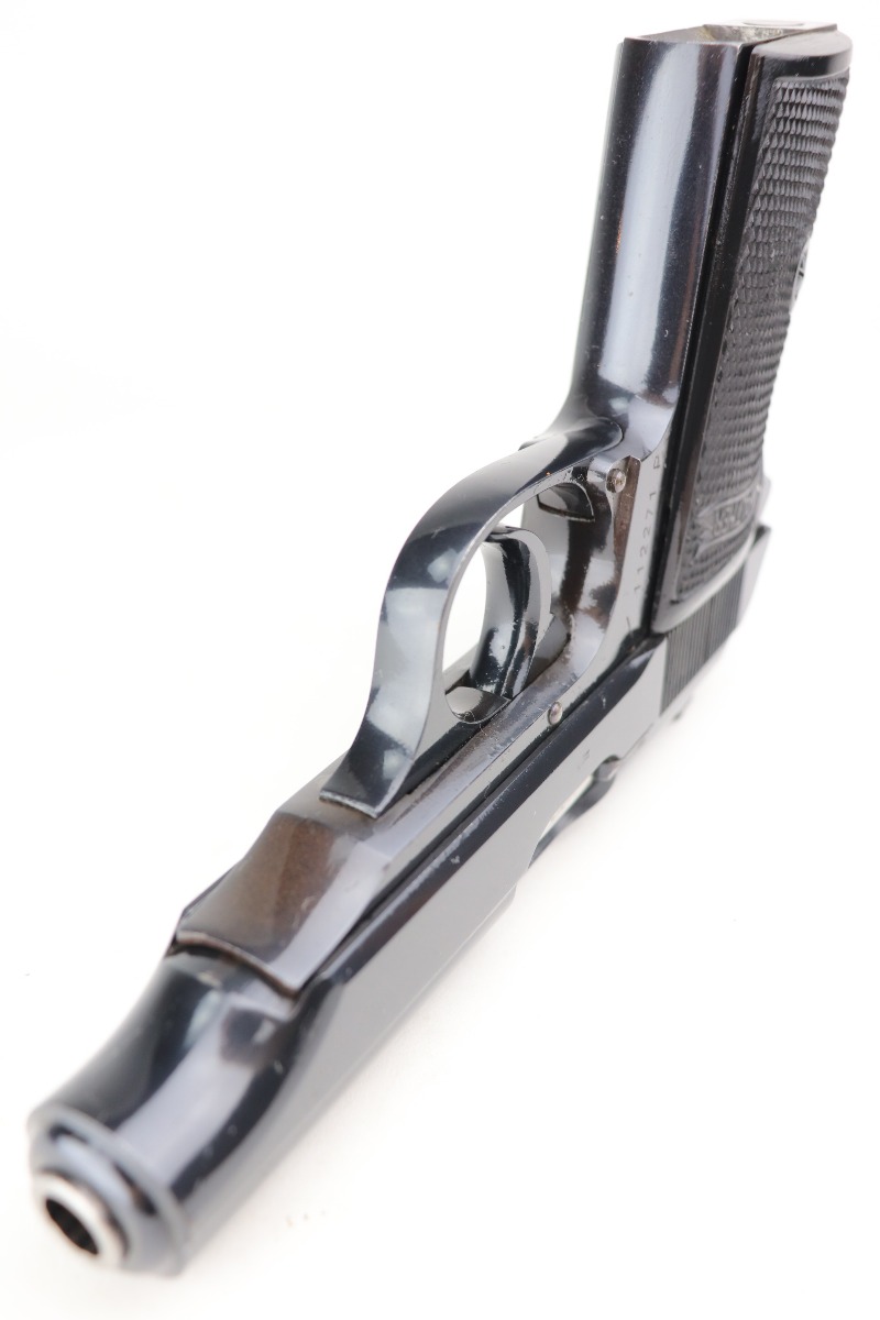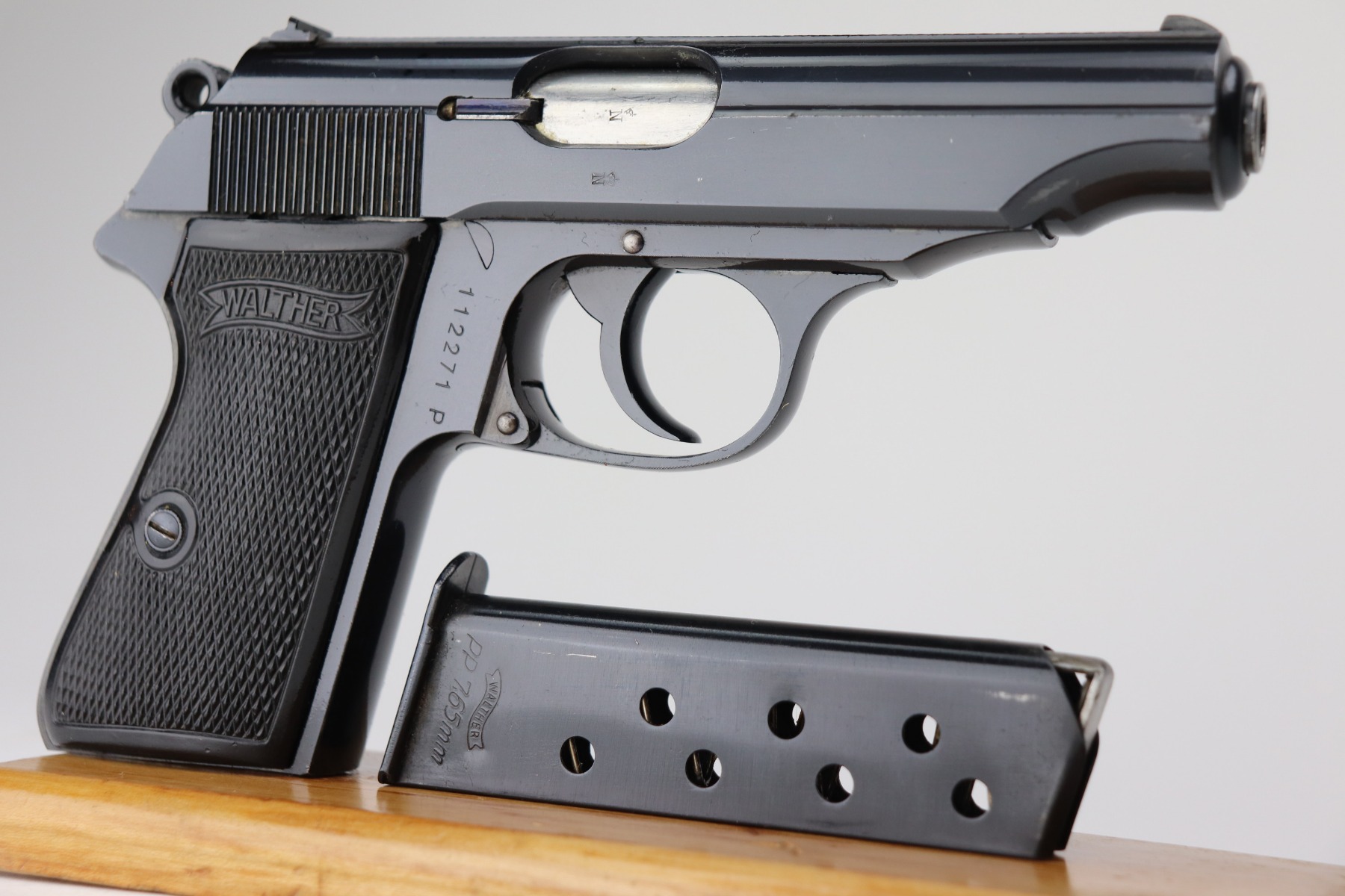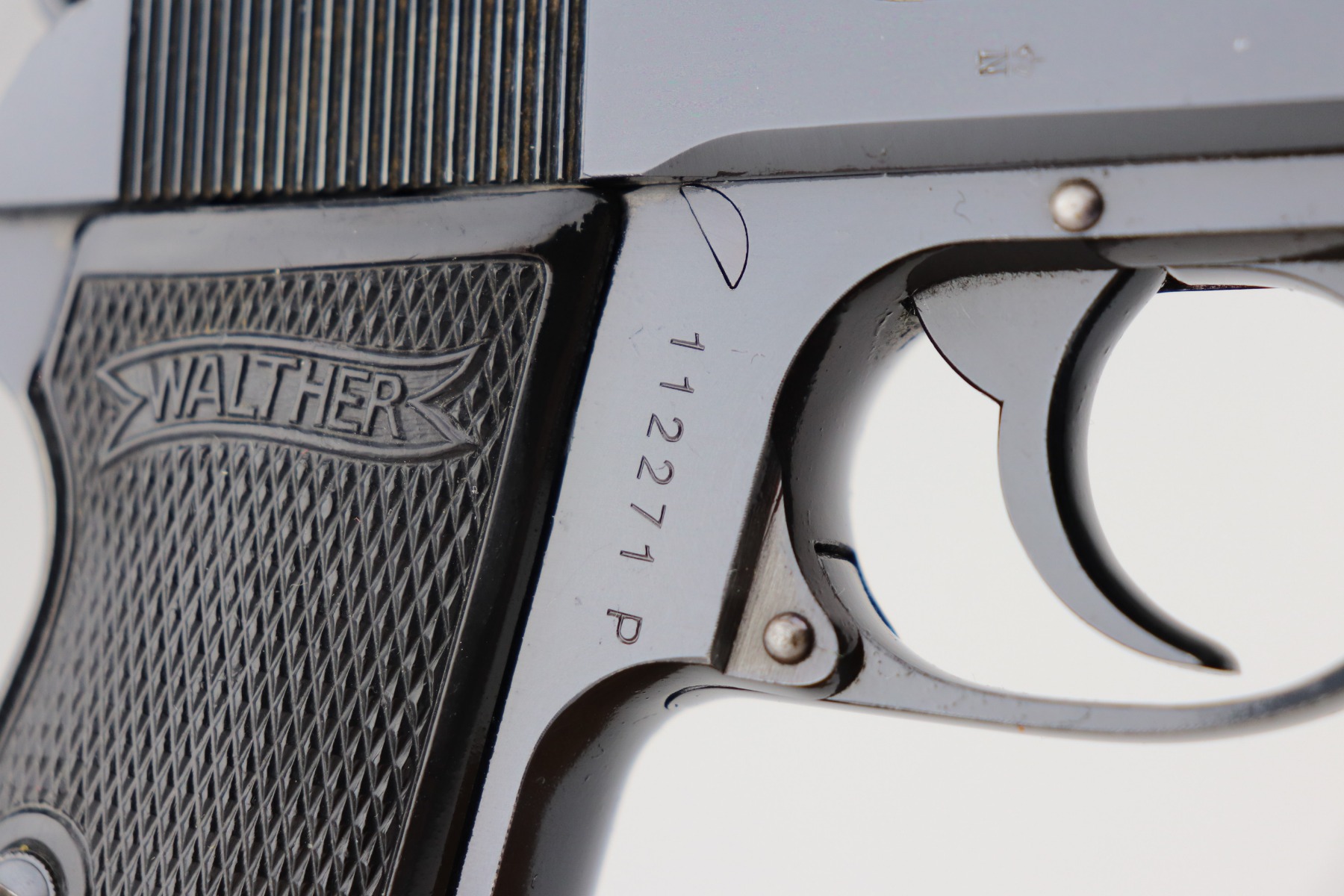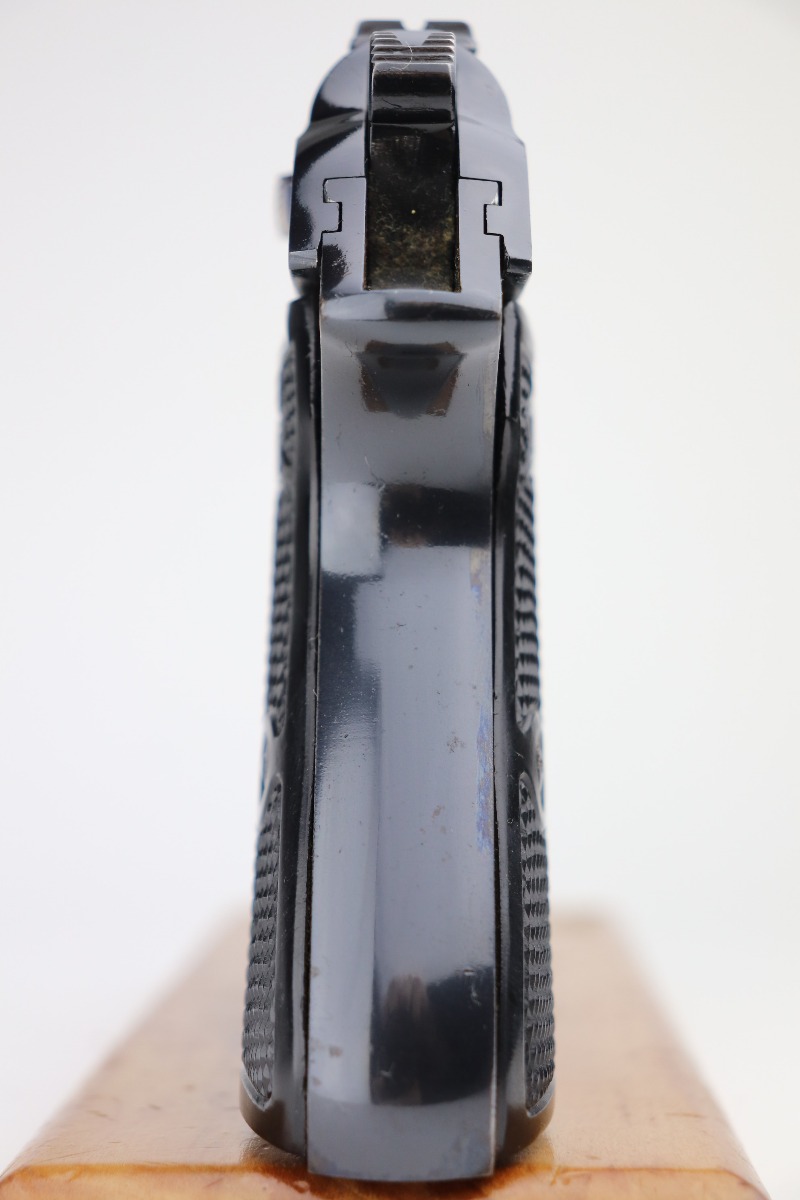 3/1/21 – This is a mint example of a Walther PP sold in the commercial market in 1938. It is all matching and has the proper “Crown N” proofs. It is in mint condition, retaining about 99% of its original finish. There is just a hint of wear around the muzzle and a very light scratch on the front strap. It has excellent grips. Excellent bore – shiny with strong rifling and minor freckling in the grooves. It comes with a post-war magazine, but we can swap it for a period-correct magazine for an extra $100.