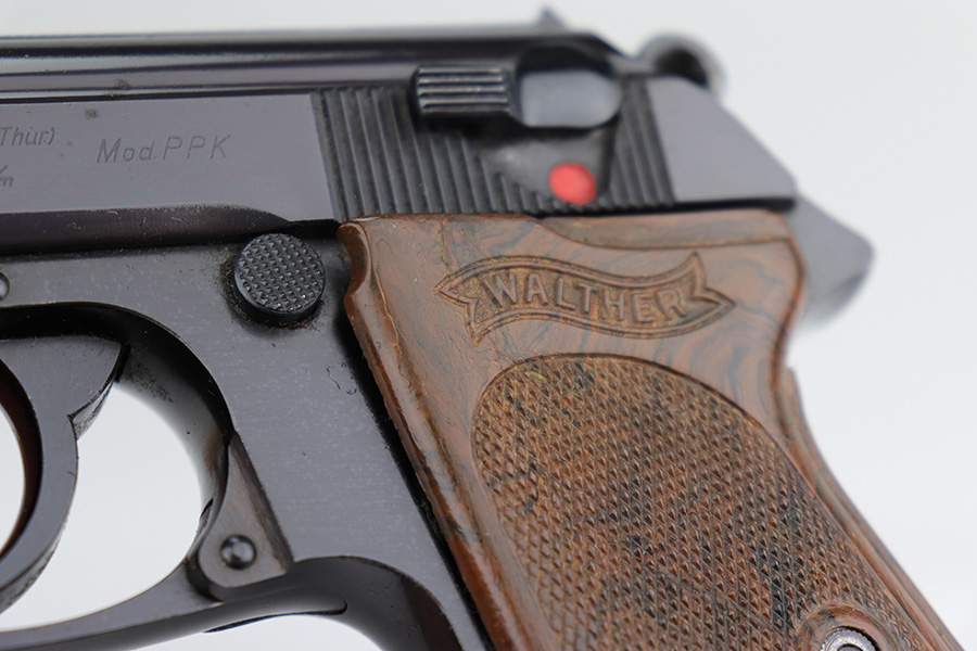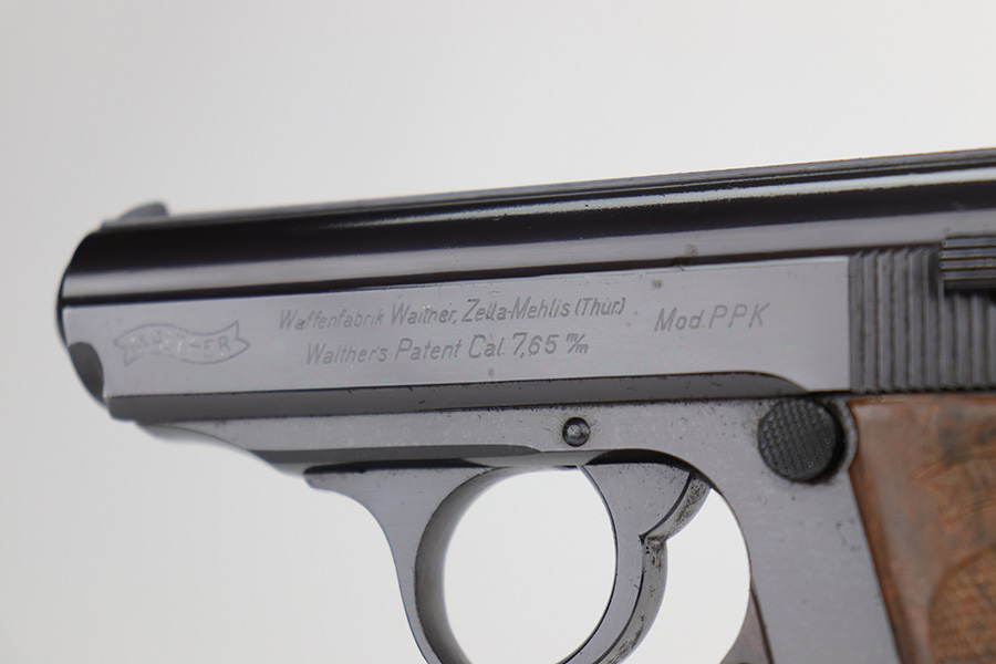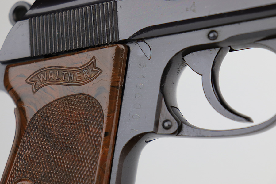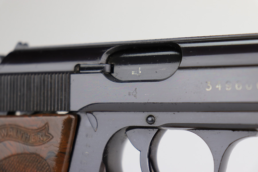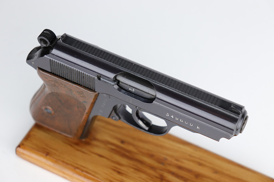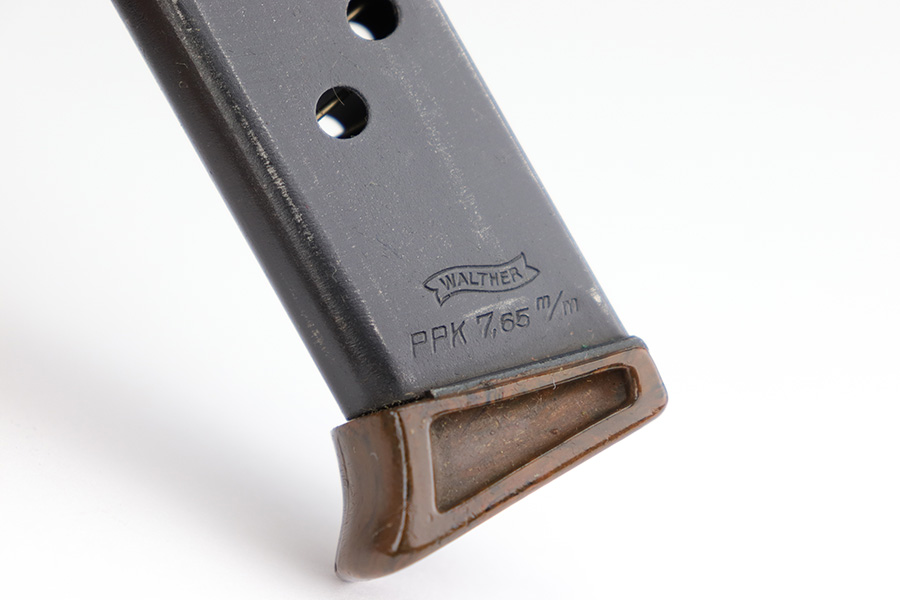 12/13/22 – This is a mint commercial Walther PPK from late ’41 or early ’42. It has nearly zero wear to mention, just a few tiny dots of pinpricking on the left side of the slide. Transitional chocolate brown grips and finger extension magazine. No cracks in either of them, and the pistol has a mint bore.