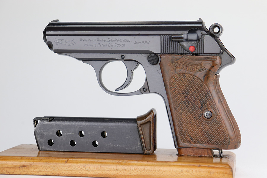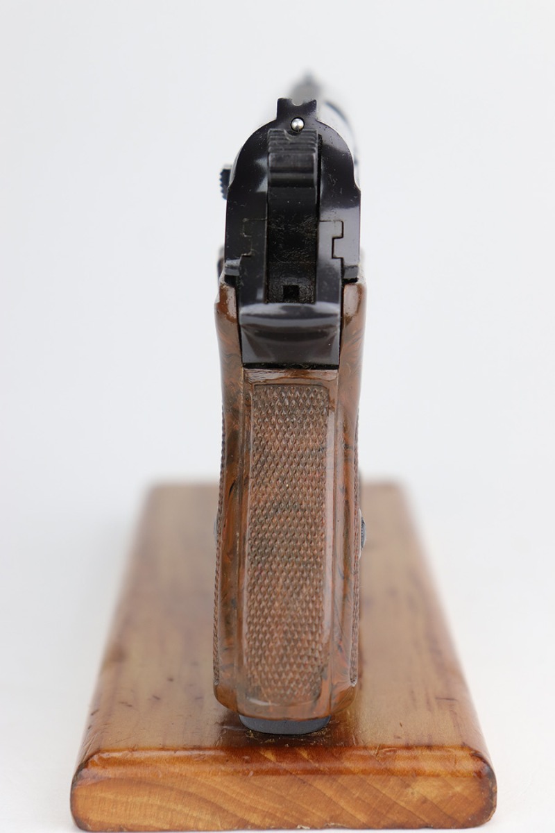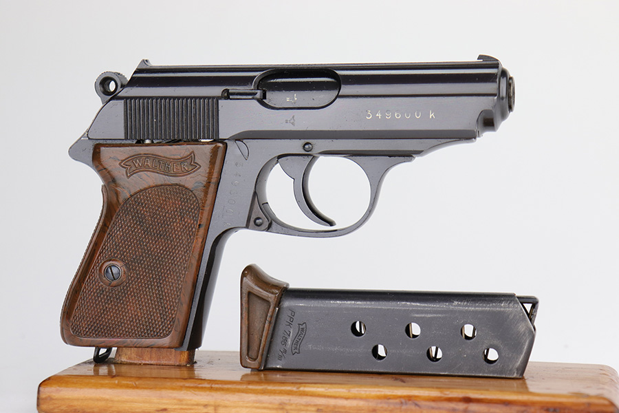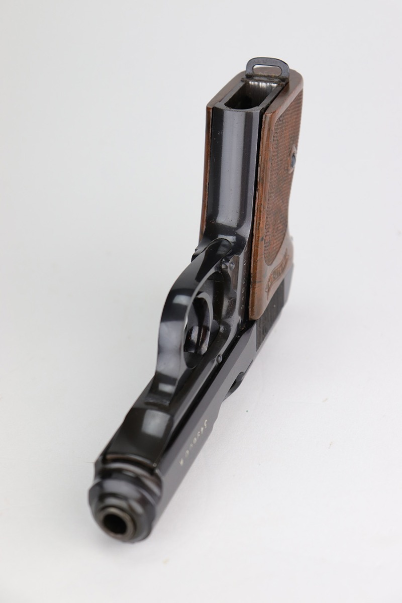 12/13/22 – This is a mint commercial Walther PPK from late ’41 or early ’42. It has nearly zero wear to mention, just a few tiny dots of pinpricking on the left side of the slide. Transitional chocolate brown grips and finger extension magazine. No cracks in either of them, and the pistol has a mint bore.