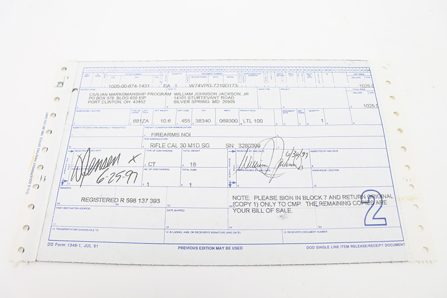 10/3/23 – Here is an absolutely gorgeous and documented CMP Sales US Springfield M1D sniper rifle with M84 scope, mount, sun shade, cone flash hider, MRT 2-52 stamped leather cheek piece, sling, original basic issue cleaning accessories, AND the original 1997 lottery winner paperwork. It also comes in the shipping box with plastic storage wrap numbered to the rifle. Excellent October of 1944 serial numbered Springfield receiver with 1-52 SA barrel with mint bore. ME and TE are both a 0. The rifle looks about new as re-arsenaled with just some light storage marks. The rifle and scope are excellent inside and out. All the accessories look new and unused. These were sold only if the shooting club member entered and was lucky enough to be selected as a lottery winner. The M1Ds were all made from existing stocks of M1 rifles, utilizing new SA barrels (usually 1951/52 dated) with a mix of other parts. They all typically show some stock evidence of rebuild as this one does. Stock looks Army arsenal refinished with faint cartouche. Two Circle P Proofs on the stock wrist. SA marked bolt, barrel, receiver, trigger guard assembly, and stock. Several of the accessories are all still new in the military wrap. The US M84 scope has crisp clear optics and has excellent blue finish. Scope adjusts properly. We doubt this M1D was ever issued. This one appears to have seen no service use after completing M1D program rebuild. Rifle, M84 scope, US Government paperwork, shipping box, accessories shipped with the rifle and all are tied together through documented part/serial numbers on the CMP purchase & shipping paperwork/box.