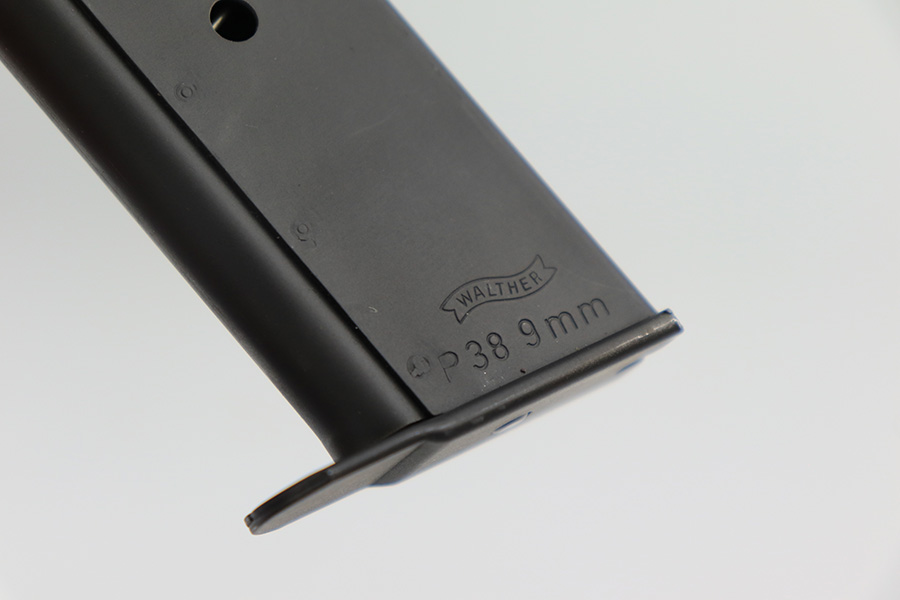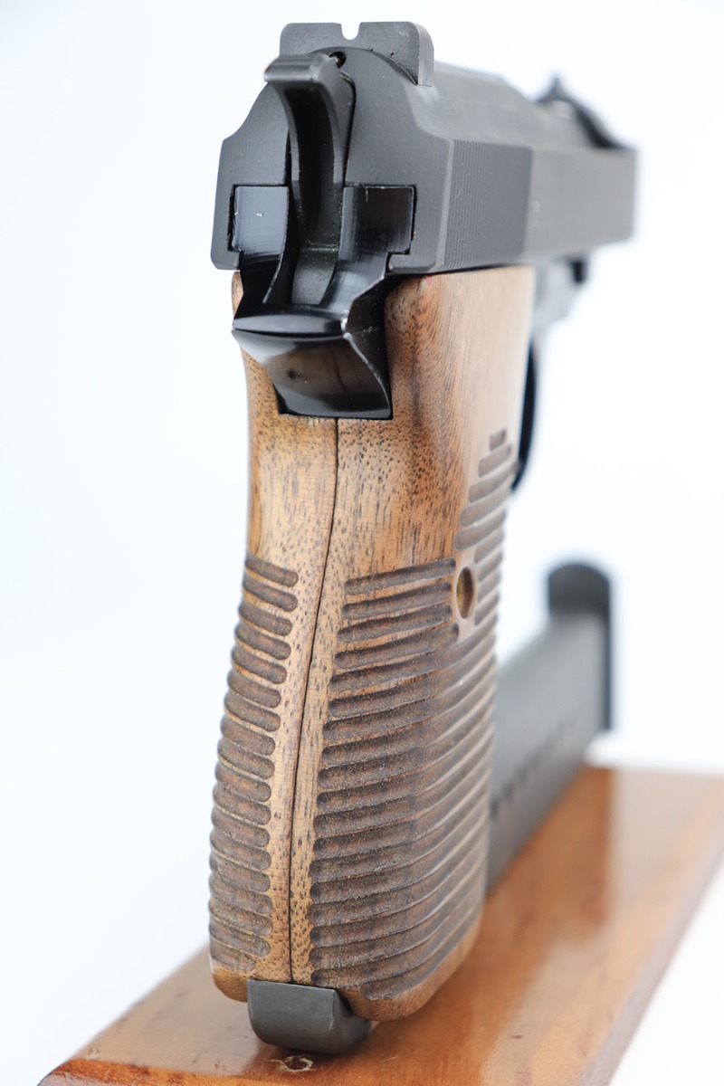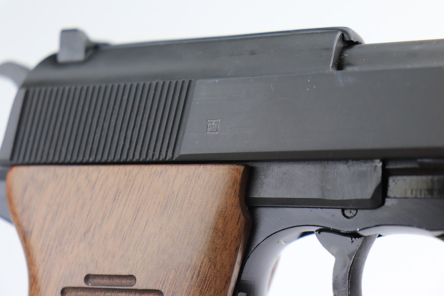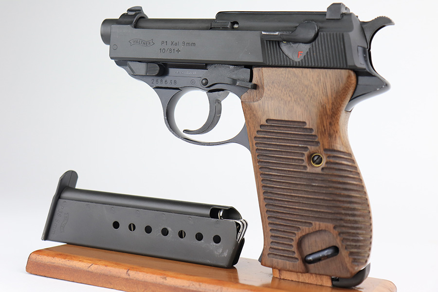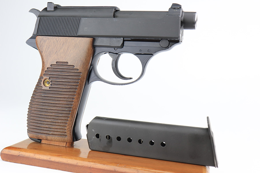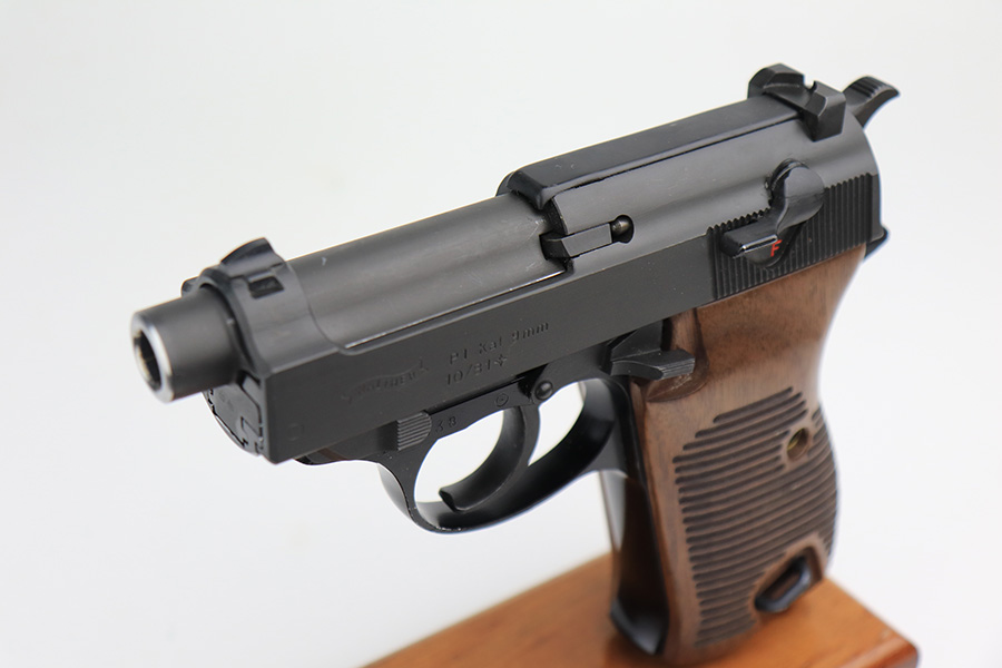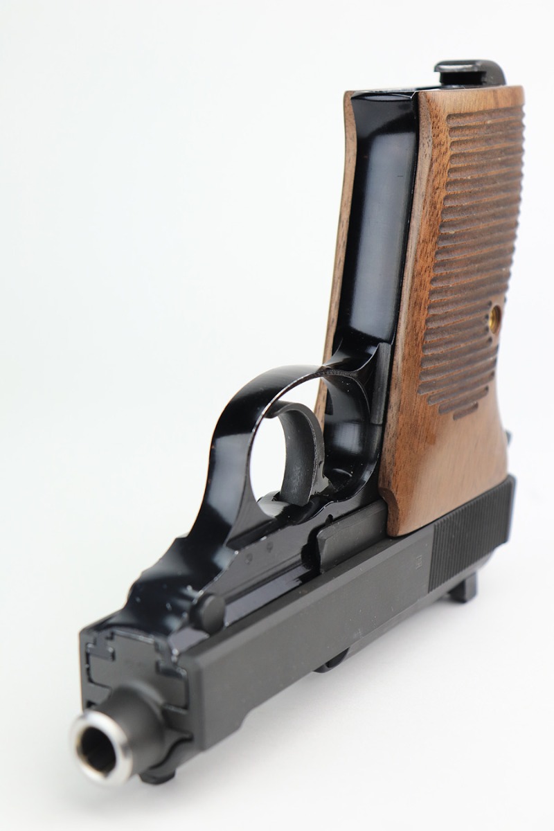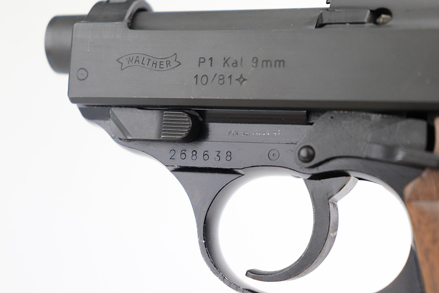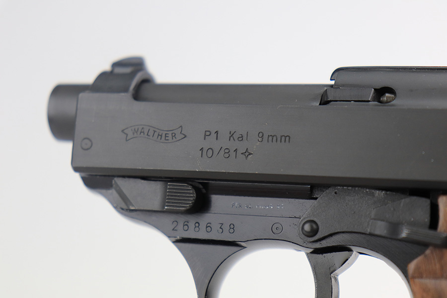 4/11/22 – This is a mint example of a Walther P1 manufactured in October of 1981. The gun is all matching, has the proper West German proofs throughout, and has a lightweight aluminum frame. Very light import mark on the left side of the frame. This particular example has a custom modified snub-nose barrel, 2.75″. This is a post-factory modification that was done professionally. The gun has retained virtually all of its finish with almost no sign of wear except for a few tiny handling marks on the underside of the frame and front strap. Comes with minty wood grips and one P.38-marked magazine. Mint bore. De-cocker is functional.