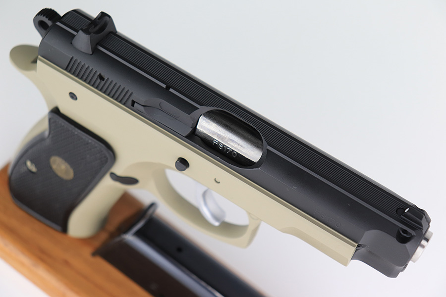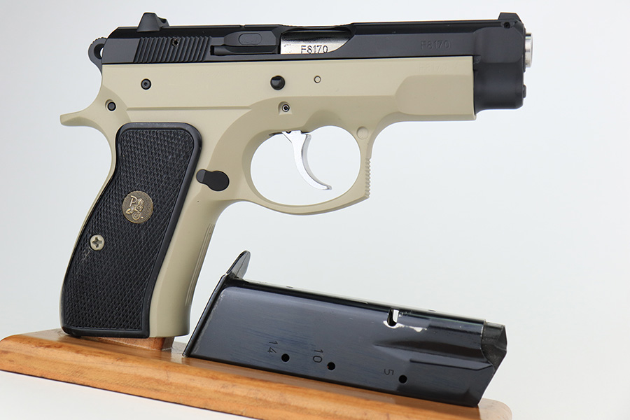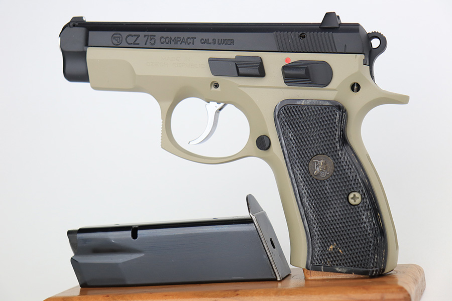 3/17/23 – This is a CZ 75 Compact semi auto pistol, chambered in 9mm Luger. It is all matching and is in like-new condition with essentially no signs of wear. Import mark on the right side of the frame. Fitted with excellent Pachmayr charcoal wood grips. Comes with one magazine. Excellent, shiny bore with strong rifling.