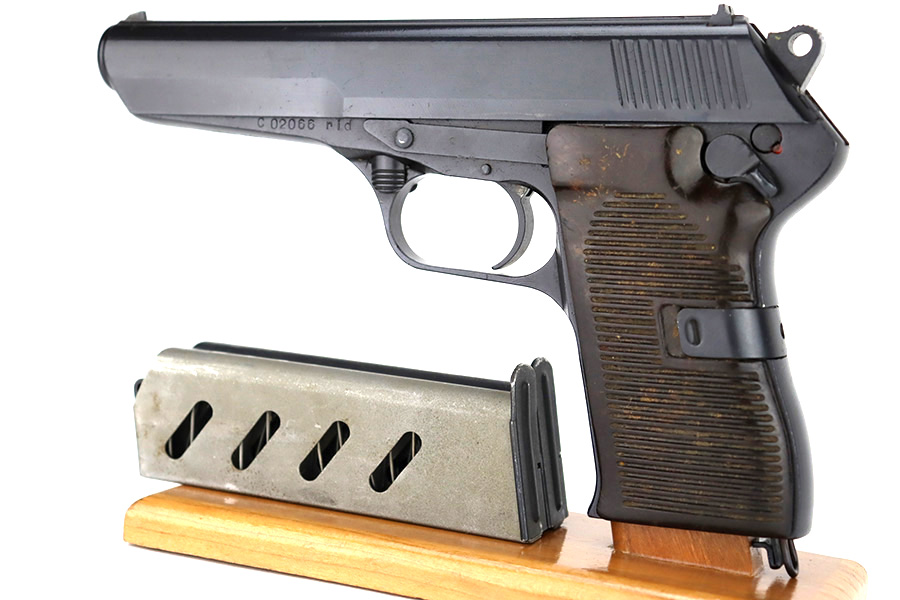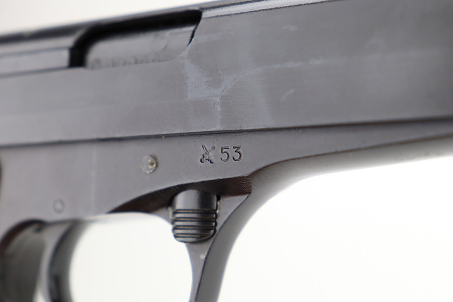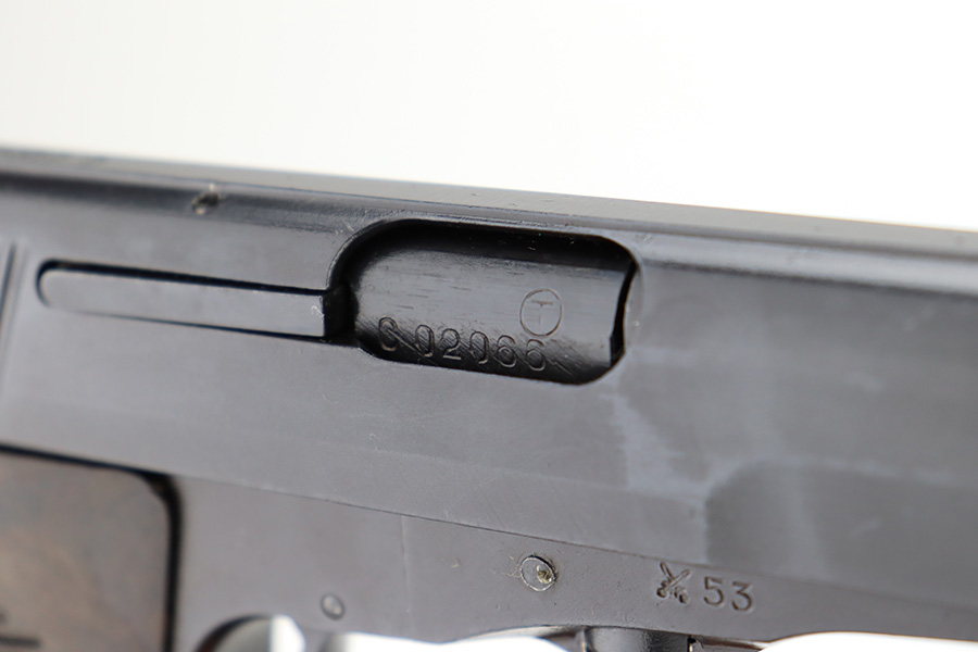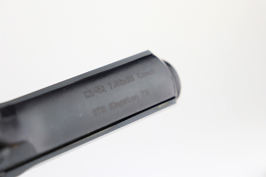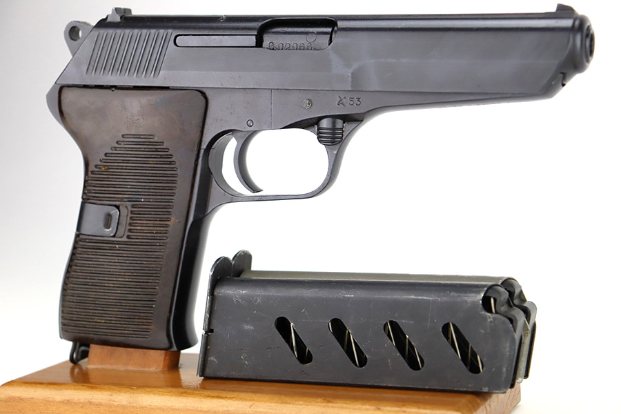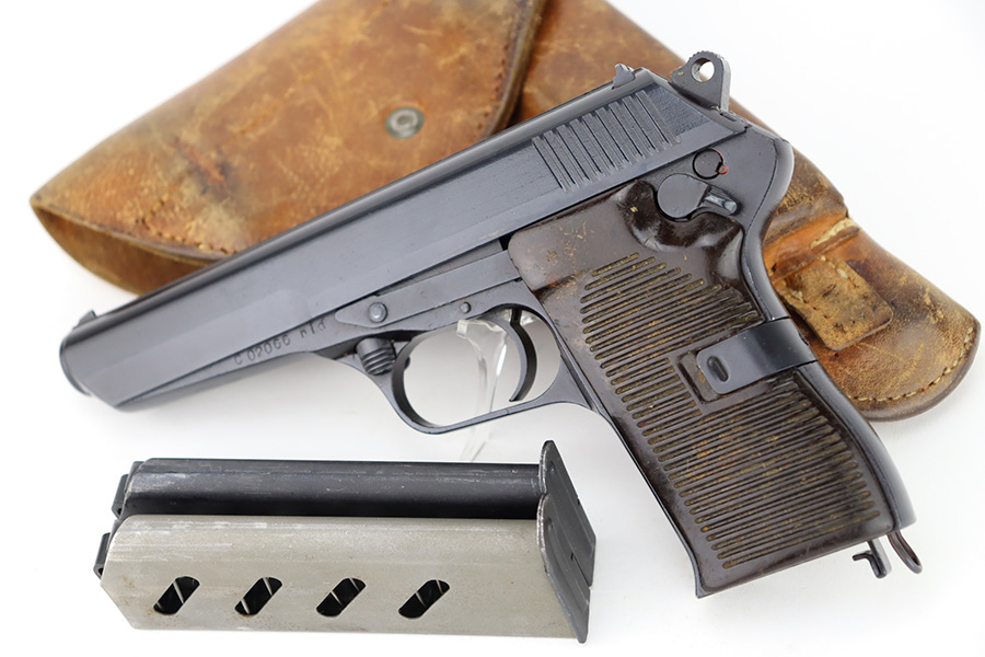 12/14/23 – This is a mint example of a Czech CZ Model 52 pistol manufactured in 1953. It is all matching and bares an import mark on the underside of the frame. It comes as a rig with a tan leather holster, cleaning rod, and two proper magazines. The gun has retained essentially all of its finish with no signs of wear. Fitted with brownish bakelite grips. The bore has strong rifling, but there is very light pin-pricking throughout.