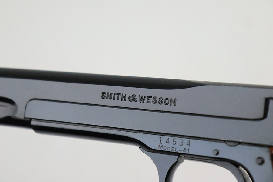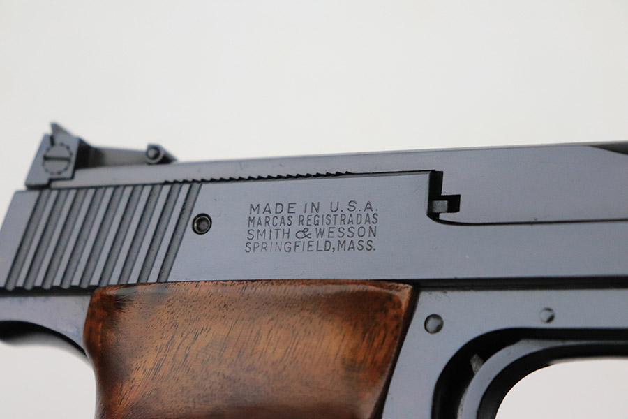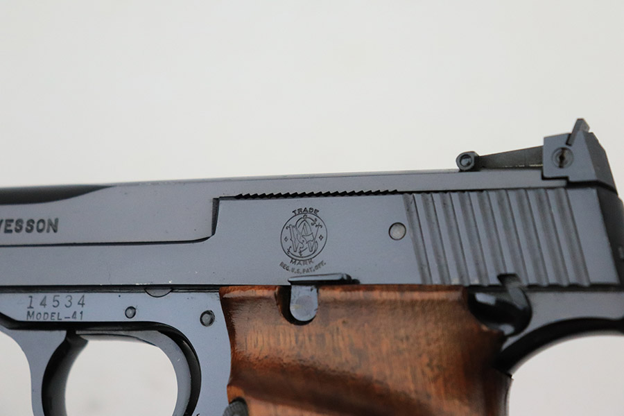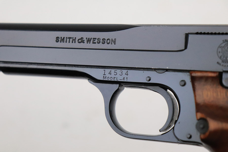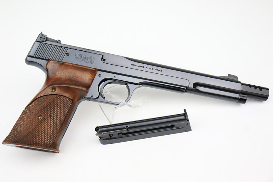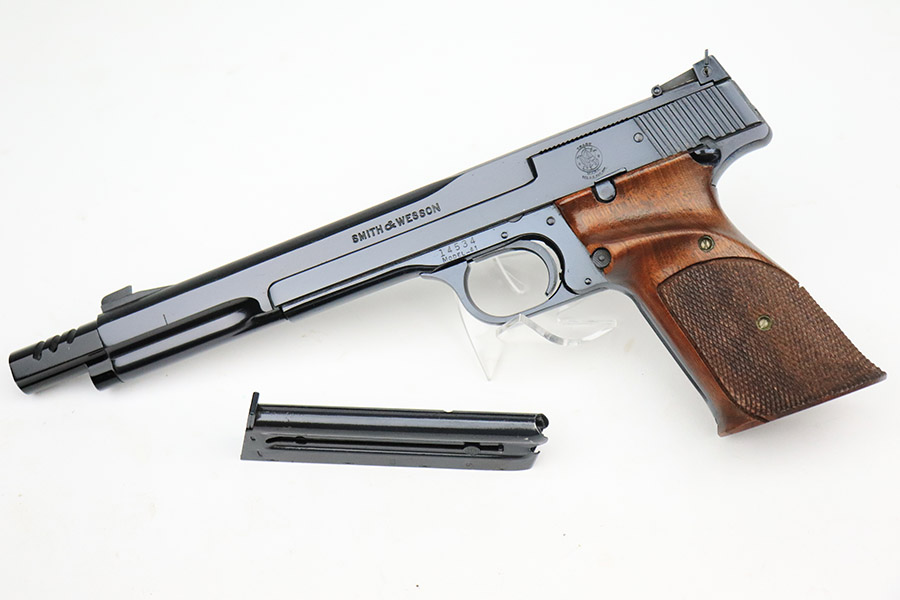 11/21/22 – This is a mint example of an early Smith & Wesson Model 41, manufactured in the second year of production, in 1959. The gun is all matching and has retained virtually all of its original high polish finish. There is almost no sign of wear or use except for a tiny amount of flaking in the finish on the right side of the muzzle attachment where it meets the barrel. Comes with excellent checkered Walnut grips – a couple of tiny chips along the bottom edge. Also comes with one proper magazine. The bore is mint.