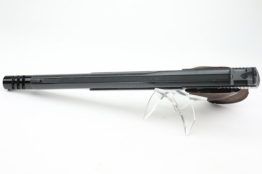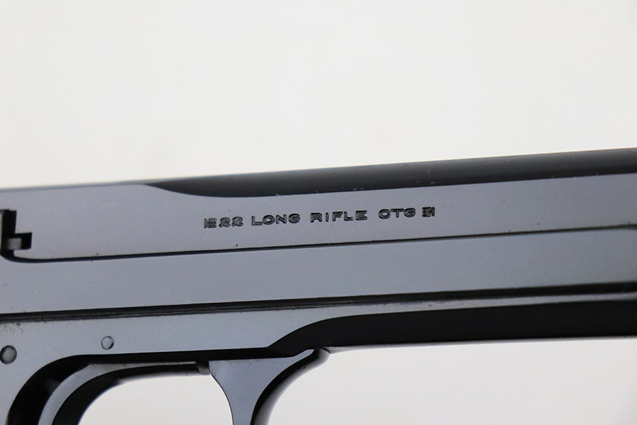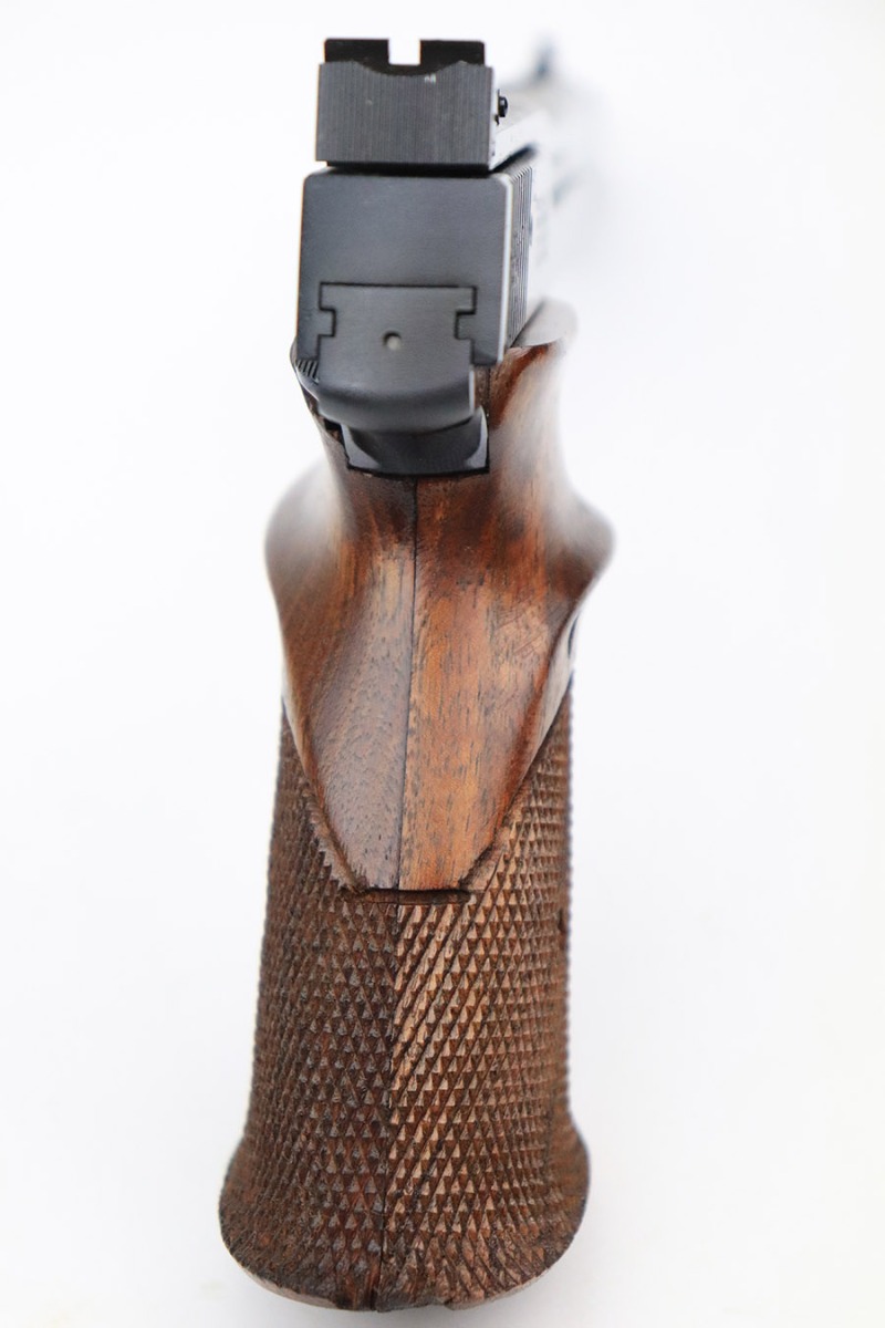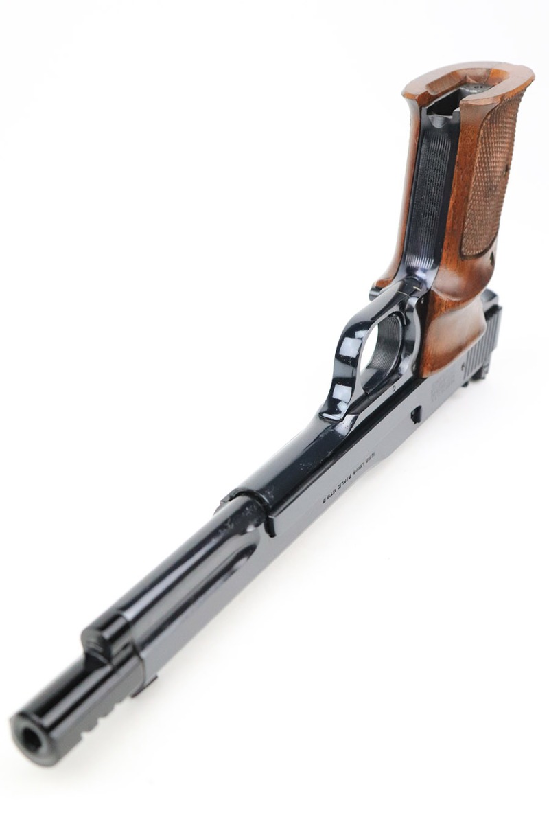 11/21/22 – This is a mint example of an early Smith & Wesson Model 41, manufactured in the second year of production, in 1959. The gun is all matching and has retained virtually all of its original high polish finish. There is almost no sign of wear or use except for a tiny amount of flaking in the finish on the right side of the muzzle attachment where it meets the barrel. Comes with excellent checkered Walnut grips – a couple of tiny chips along the bottom edge. Also comes with one proper magazine. The bore is mint.