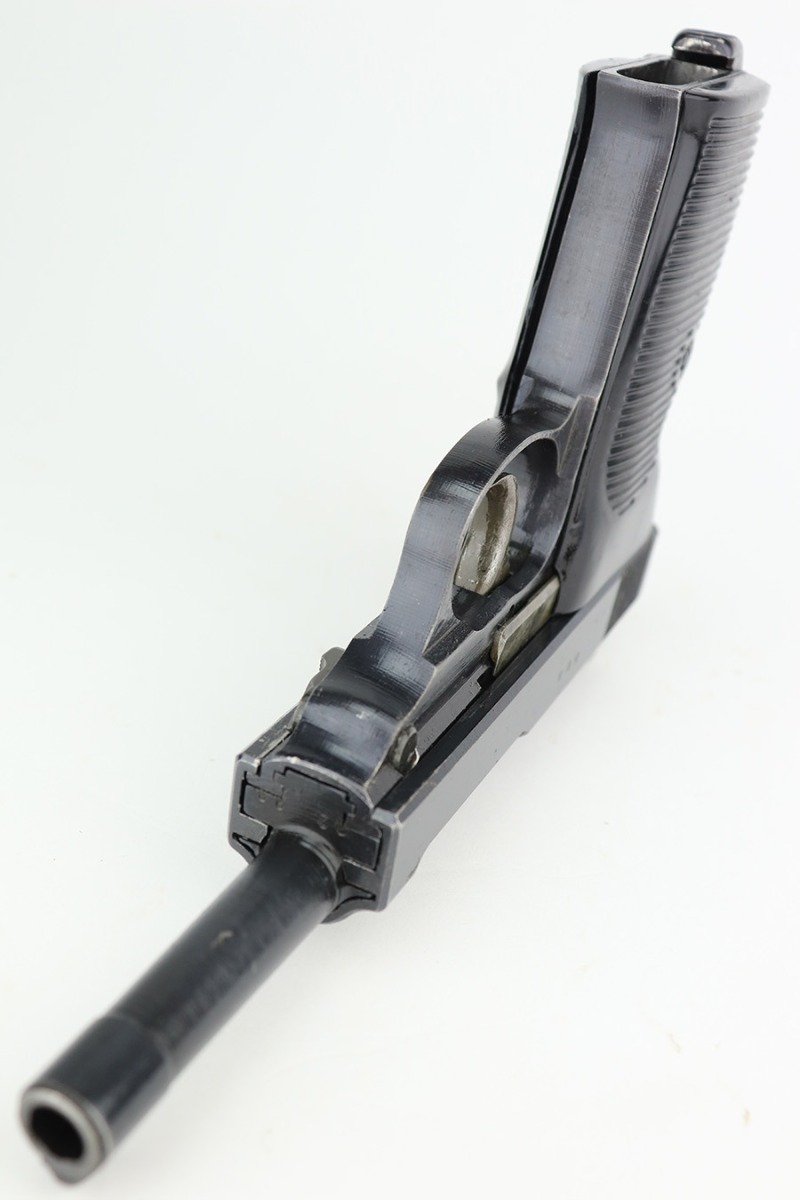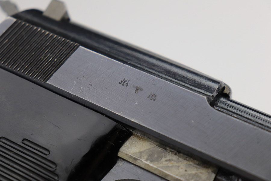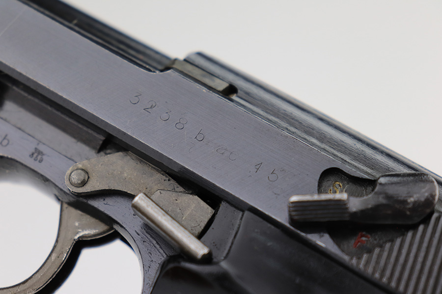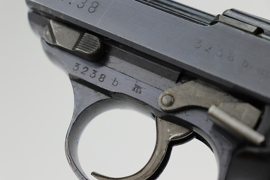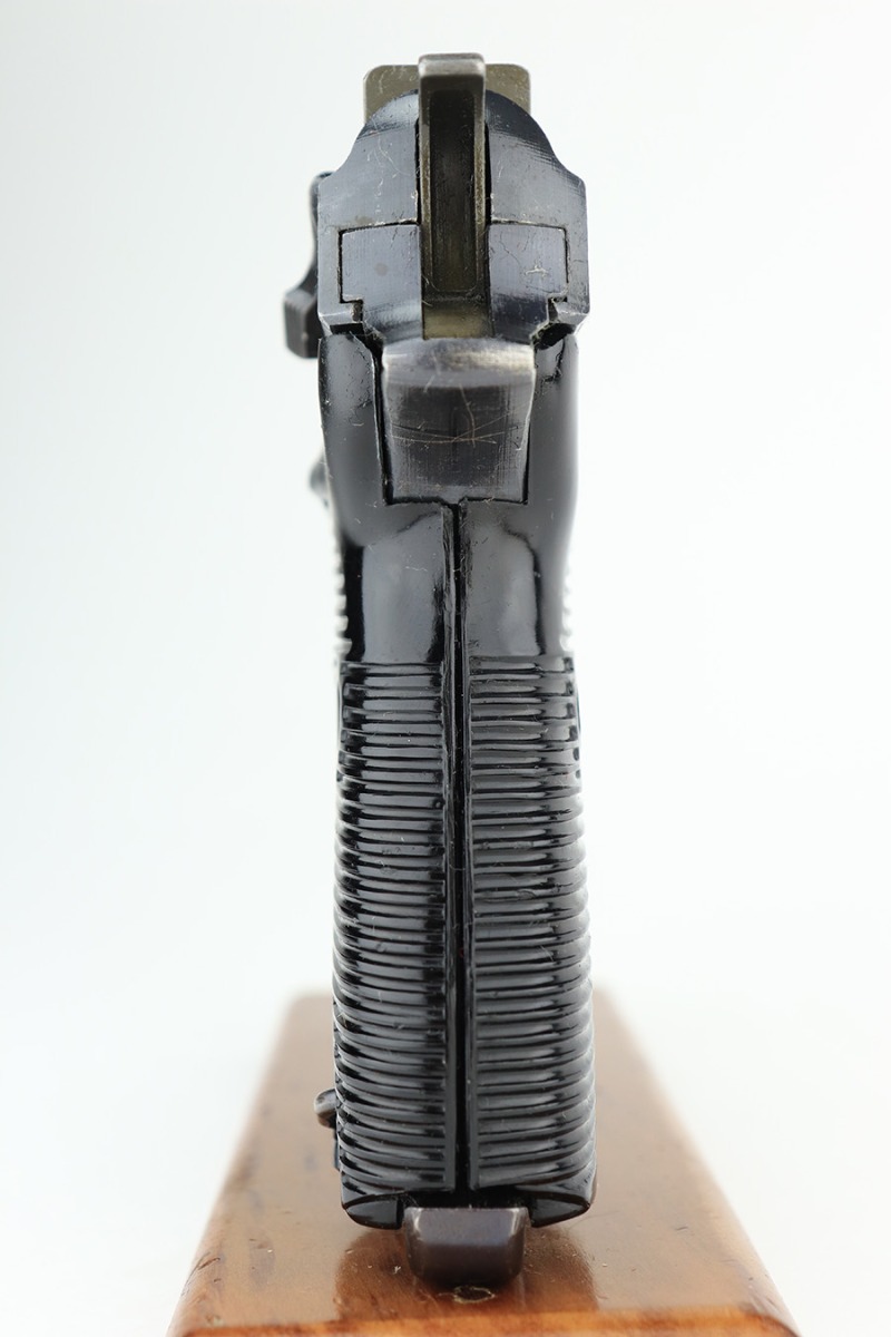 4/4/23 – This is a mint example of an end-of-war AC 45 Walther P.38 issued to the Nazi military in 1945. It is all matching and has the proper “Eagle 359” military acceptance proofs. This one has a rare “Waffen 76” marked barrel, indicating it was made at the Czech FNH factory. It has all the proper late-war features, such as rough machining, cog-style hammer, and phosphate small parts. It has retained virtually all of its finish. Fitted with very nice black plastic grips – some minor dulling on the left side. Comes with a jvd magazine. Like-new bore. De-cocker is not functional.