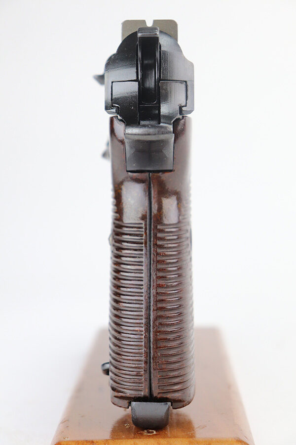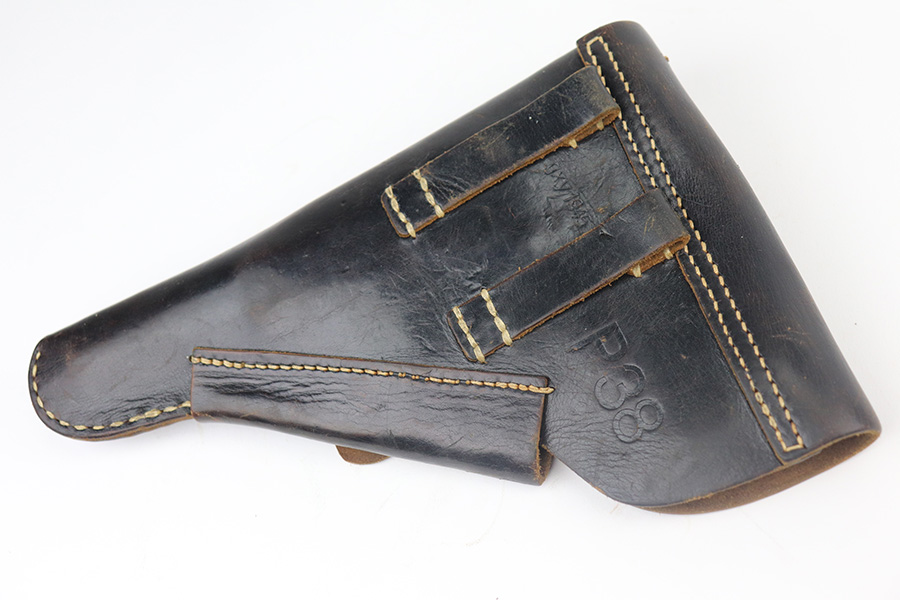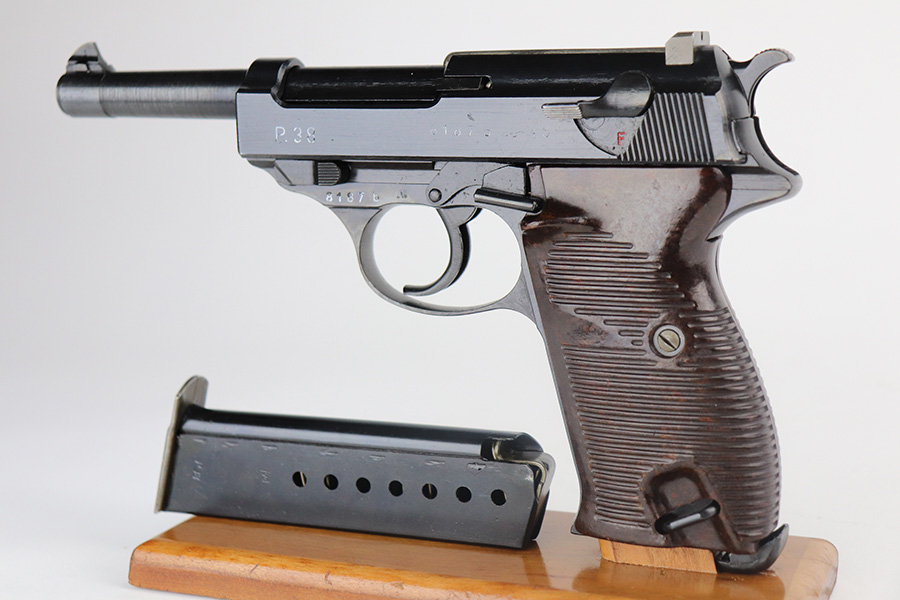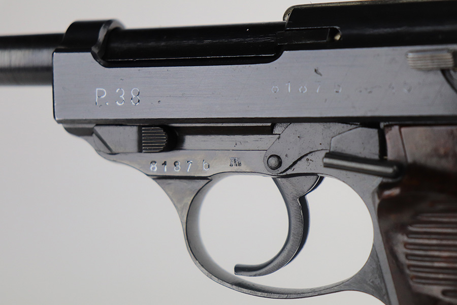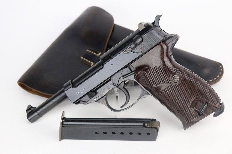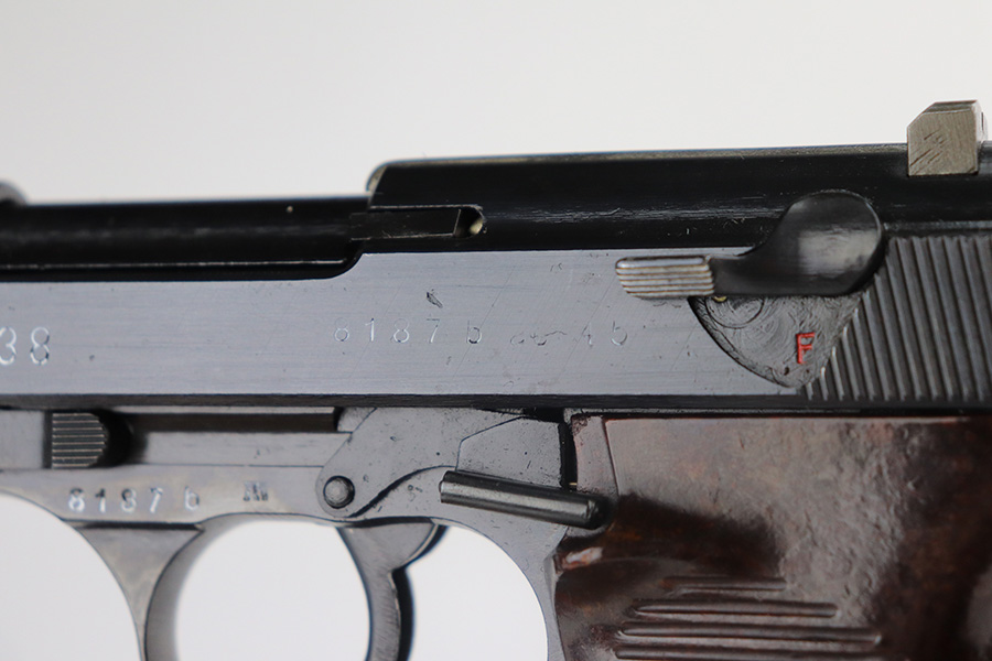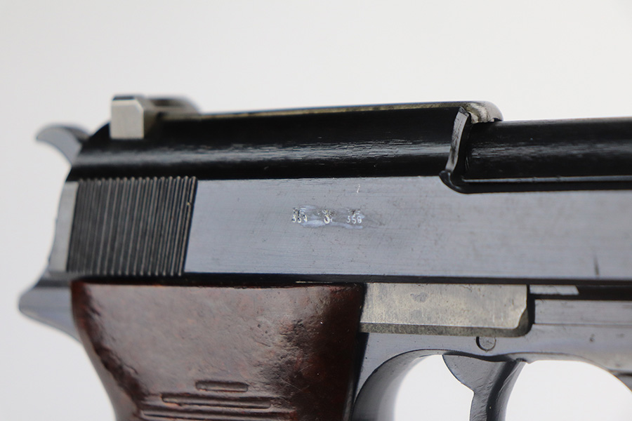 6/24/21 – This is a mint example of an end-of-war Walther P.38 rig, issued to the Nazi military in 1945. It is all matching and has the proper “Eagle 359” military proofs. The rig comes with a 1945-dated soft shell holster and a period-correct magazine. Some of the small parts have a phosphate finish – typical for end-of-war guns. The gun has retained virtually all of its finish with very minor spotty oxidation on the right side of the slide and front strap. Excellent grips. The bore is minty with just a hint of freckling in the grooves. De-cocker is functional.
