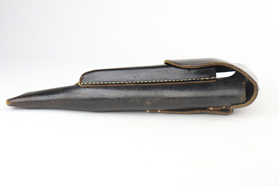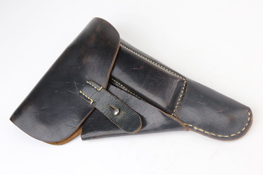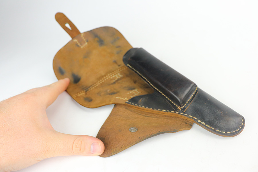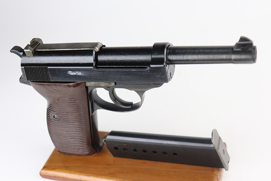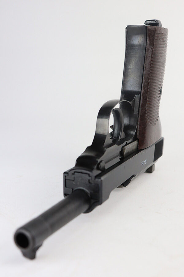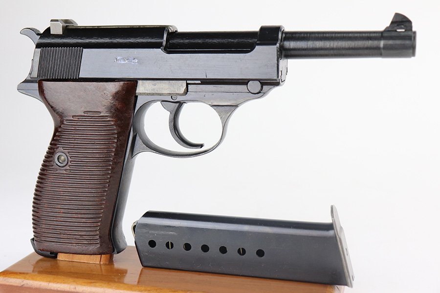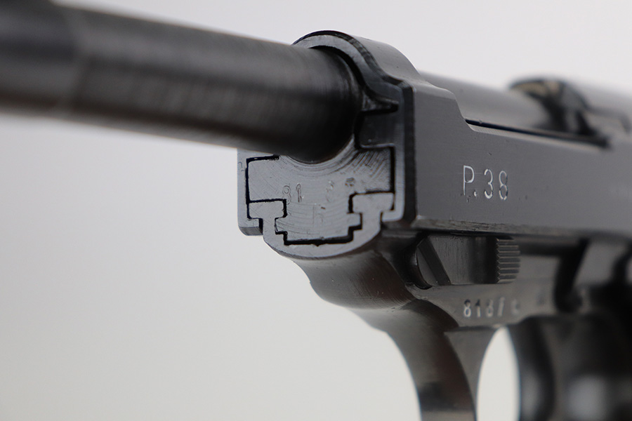 6/24/21 – This is a mint example of an end-of-war Walther P.38 rig, issued to the Nazi military in 1945. It is all matching and has the proper “Eagle 359” military proofs. The rig comes with a 1945-dated soft shell holster and a period-correct magazine. Some of the small parts have a phosphate finish – typical for end-of-war guns. The gun has retained virtually all of its finish with very minor spotty oxidation on the right side of the slide and front strap. Excellent grips. The bore is minty with just a hint of freckling in the grooves. De-cocker is functional.