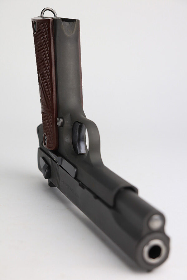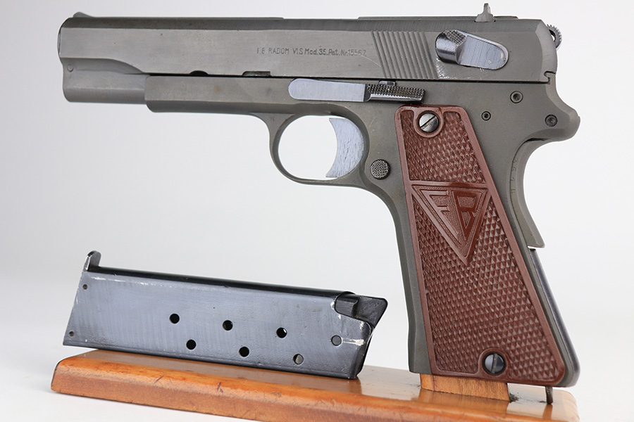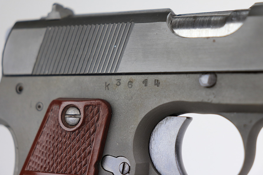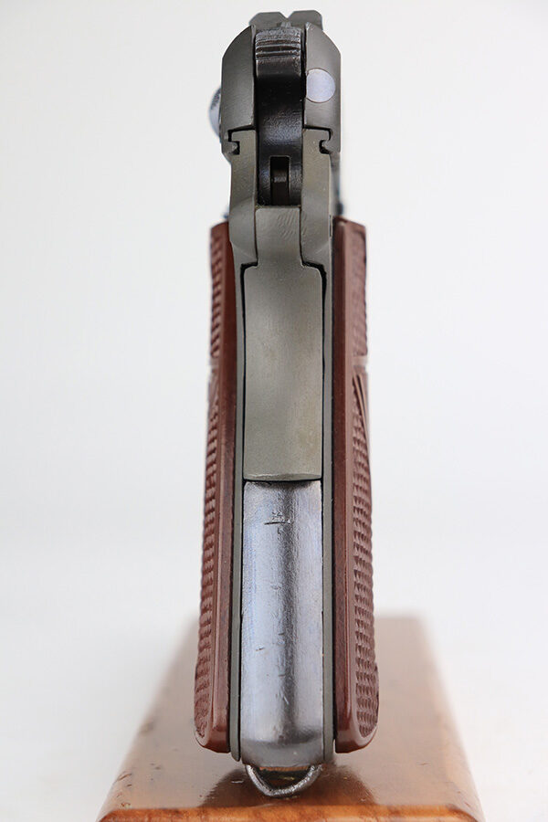 12/30/21 – This is an exceptional condition Radom that must have been put together from parts at the end of the war. The slide, barrel and frame are not matching, suggesting the late assembly. The condition of the phosphate and blued small parts are like-new. The barrel and bore are also in “like new” condition. It comes with late-war red color grips. The magazine is “Waffen 189” proofed on the bottom. Most of the gun is missing the inspection stamps (unissued gun) except for one faint “Eagle 623” on the trigger guard. The action and mechanics are tight. If the gun caught talk it could reveal its secrets so without that we can only guess that it was put together from parts after the Allied armies took over the Steyr factory, or possibly captured and assembled by GI’s as it was in transit from Radom to Steyr.