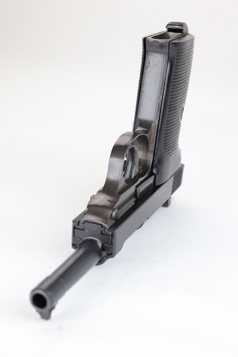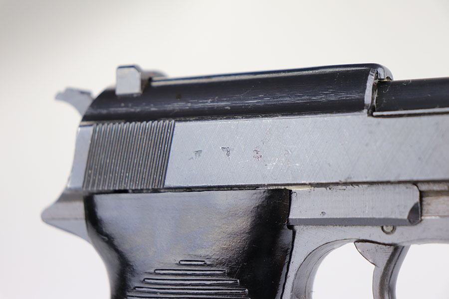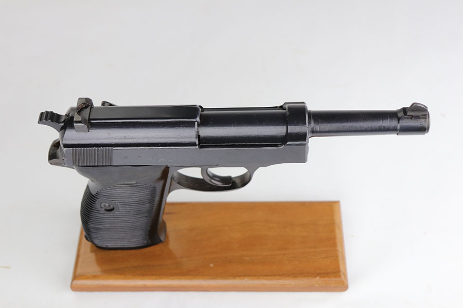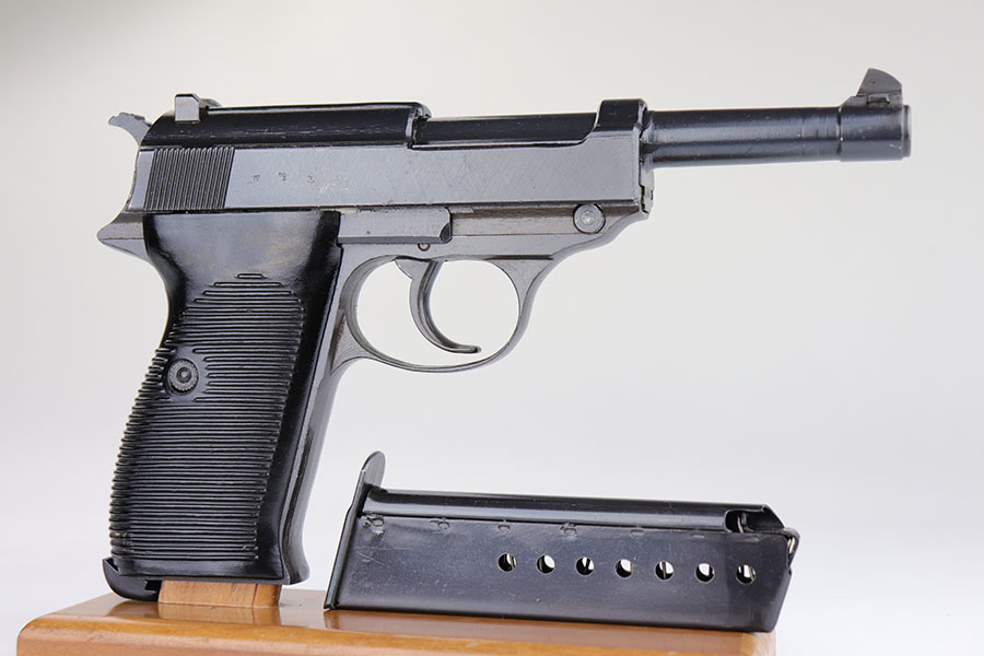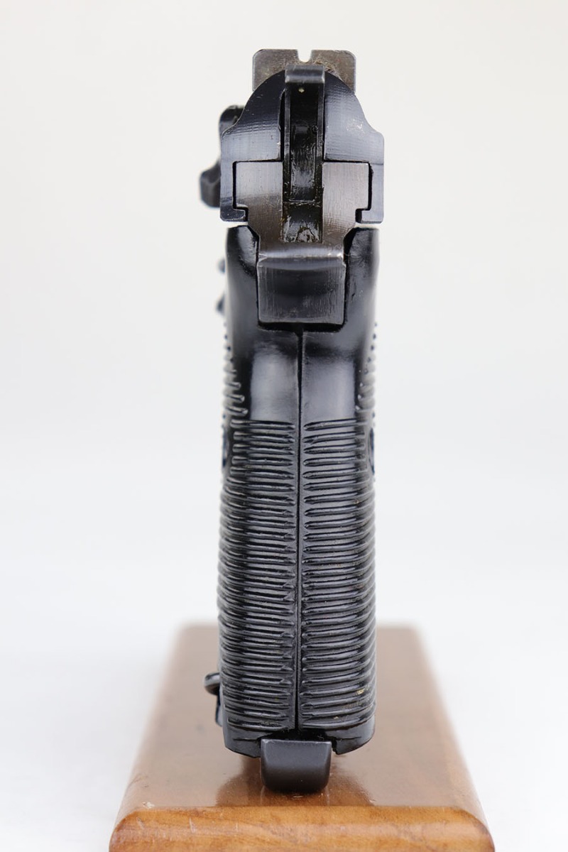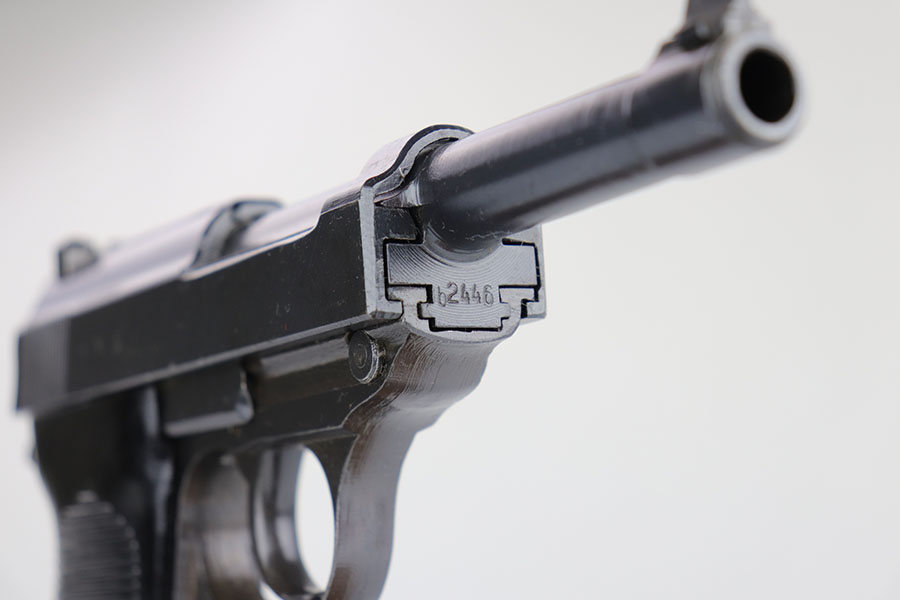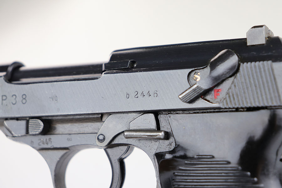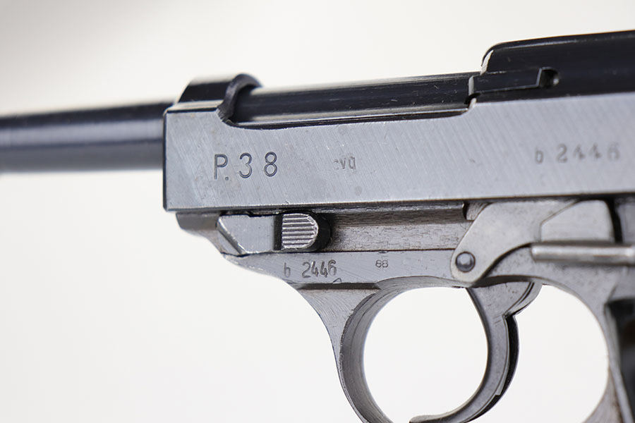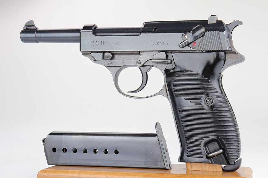 10/10/23 – This is a mint Spreewerk P.38 issued to the Nazi military at the very end of the war, in March of 1945. All matching with the proper “Eagle 88” military acceptance proofs. There is virtually no finish loss with just a few very light surface scratches on the right side of the slide. Fitted with period-correct reddish bakelite grips. Comes with a rare, end-of-war, “U” marked magazine. Mint bore. De-cocker is not functional.